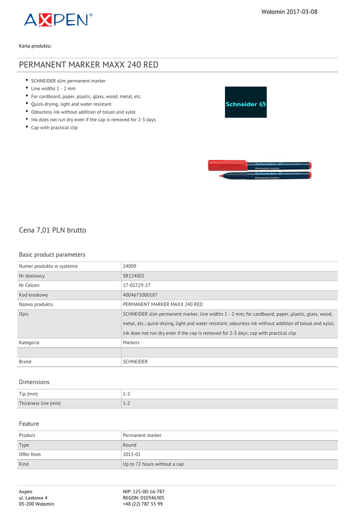 Wołomin 2017-03-08 Karta produktu: PERMANENT MARKER MAXX 240 RED SCHNEIDER slim permanent marker Line widths 1 - 2 mm For cardboard, paper, plastic, glass, wood, metal, etc. Quick-drying, light and water resistant Odourless ink without addition of toluol and xylol Ink does not run dry even if the cap is removed for 2-3 days Cap with practical clip Cena 7,01 PLN brutto Basic product parameters Numer produktu w systemie 24009 Nr dostawcy SR124002 Nr Celcen 17-01729-27 Kod kreskowy 4004675000187 Nazwa produktu PERMANENT MARKER MAXX 240 RED Opis SCHNEIDER slim permanent marker; line widths 1 - 2 mm; for cardboard, paper, plastic, glass, wood, metal, etc.; quick-drying, light and water resistant; odourless ink without addition of toluol and xylol; ink does not run dry even if the cap is removed for 2-3 days; cap with practical clip Kategoria Markers Brand SCHNEIDER Dimensions Tip (mm) 1-2 Thickness line (mm) 1-2 Feature Product Permanent marker Type Round Offer from 2015-01 Kind Up to 72 hours without a cap Axpen ul. Laskowa 4 05-200 Wołomin NIP: 125-00-16-787 REGON: 010346305 +48 (22) 787 55 99 Wołomin 2017-03-08 Karta katalogowa produktu cd. PERMANENT MARKER MAXX 240 RED Procurement vocabulary CPV 30192125-3 Pisaki Certifications New product Standard Hit Standard Colour Colour Red Serdecznie zapraszamy do współpracy Axpen zespół. Axpen ul. Laskowa 4 05-200 Wołomin NIP: 125-00-16-787 REGON: 010346305 +48 (22) 787 55 99