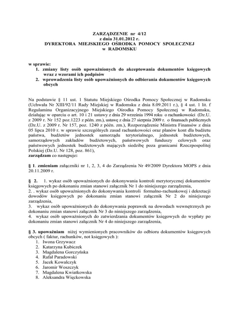 ZARZĄDZENIE nr 4/12 z dnia 31.01.2012 r. DYREKTORA MIEJSKIEGO OŚRODKA POMOCY SPOŁECZNEJ w RADOMSKU w sprawie: 1. zmiany listy osób upowaŜnionych do akceptowania dokumentów księgowych wraz z wzorami ich podpisów 2. wprowadzenia listy osób upowaŜnionych do odbierania dokumentów księgowych obcych Na podstawie § 11 ust. 1 Statutu Miejskiego Ośrodka Pomocy Społecznej w Radomsku (Uchwała Nr XIII/92/11 Rady Miejskiej w Radomsku z dnia 8.09.2011 r.), § 4 ust. 1 lit. f Regulaminu Organizacyjnego Miejskiego Ośrodka Pomocy Społecznej w Radomsku, działając w oparciu o art. 10 i 21 ustawy z dnia 29 września 1994 roku o rachunkowości (Dz.U. z 2009 r. Nr 152 poz.1223 z późn. zm.), ustawę z dnia 27 sierpnia 2009 r. o finansach publicznych (Dz.U. z 2009 r. Nr 157, poz. 1240 z późn. zm.), Rozporządzenie Ministra Finansów z dnia 05 lipca 2010 r. w sprawie szczególnych zasad rachunkowości oraz planów kont dla budŜetu państwa, budŜetów jednostek samorządu terytorialnego, jednostek budŜetowych, samorządowych zakładów budŜetowych, państwowych funduszy celowych oraz państwowych jednostek budŜetowych mających siedzibę poza granicami Rzeczpospolitej Polskiej (Dz.U. Nr 128, poz. 861), zarządzam co następuje: § 1. zmieniam załączniki nr 1, 2, 3, 4 do Zarządzenia Nr 49/2009 Dyrektora MOPS z dnia 20.11.2009 r. § 2. 1. wykaz osób upowaŜnionych do dokonywania kontroli merytorycznej dokumentów księgowych po dokonaniu zmian stanowi załącznik Nr 1 do niniejszego zarządzenia, 2. . wykaz osób upowaŜnionych do dokonywania kontroli formalno-rachunkowej i dekretacji dowodów księgowych po dokonaniu zmian stanowi załącznik Nr 2 do niniejszego zarządzenia, 3. wykaz osób upowaŜnionych do dokonywania poprawek na dowodach wewnętrznych po dokonaniu zmian stanowi załącznik Nr 3 do niniejszego zarządzenia, 4. wykaz osób upowaŜnionych do zatwierdzania dokumentów księgowych do wypłaty po dokonaniu zmian stanowi załącznik Nr 4 do niniejszego zarządzenia, § 3. upowaŜniam niŜej wymienionych pracowników do odbioru dokumentów księgowych obcych ( faktur, rachunków, not księgowych ): 1. Iwona Grzywacz 2. Katarzyna Kubiczek 3. Magdalena Gorczyńska 4. Rafał Paradowski 5. Jacek Kowalczyk 6. Jaromir Woszczyk 7. Magdalena Kwiatkowska 8. Aleksandra Więckowska 9. Kamilla Jabłońska 10. Marcin Dudek 11. Iwona Broszkiewicz 12. BoŜena Jaskórzyńska ŚDS 13. Ewelina Szmit ŚDS 14. Ewa Majdecka DDPS 15. Wanda Koźlik DDPS § 4. Odpowiedzialnymi za rzetelne i prawidłowe wykonywanie zarządzenia czynię wszystkich pracowników, którym powierzone zostały obowiązki realizacji budŜetu jednostki. § 5. Nadzór nad wykonaniem niniejszego zarządzenia powierzam Głównemu Księgowemu Ośrodka. § 6. Traci moc zarządzenie Nr 12/11 z dnia 03 lutego 2011 r. § 7. Zarządzenie wchodzi w Ŝycie z dniem podpisania, Otrzymują: 1. Główny Księgowy 2. Kierownicy i pracownicy wyszczególnieni w zarządzeniu 3. a/a DYREKTOR Miejskiego Ośrodka Pomocy Społecznej w Radomsku /-/ mgr Andrzej Barszcz Załącznik nr 1. księgowych Lp. Wykaz osób upowaŜnionych do dokonywania kontroli merytorycznej dokumentów Rodzaj dokumentacji Dział Nazwisko i imię oraz stanowisko słuŜbowe upowaŜnionego 1. Dokumentacja zakupu usług, materiałów, środków trwałych związana z utrzymaniem Ośrodka, oświadczenia Dział Organizacji Iwona Grzywacz za ryczałty, ekwiwalenty, rachunki za podróŜe słuŜbowe, i Spraw Osobowych Kierownik Działu wnioski o zaliczkę, rozliczenie zaliczki, dokumentacja dot. dofinansowania z ZFŚS, listy wypłat za prace społecznie uŜyteczne 2. Dokumentacja zakupu usług, materiałów, środków Dział Organizacji Magdalena trwałych związana z utrzymaniem Ośrodka, oświadczenia i Spraw Osobowych Gorczyńska za ryczałty, ekwiwalenty, rachunki za podróŜe słuŜbowe, Inspektor wnioski o zaliczkę, rozliczenie zaliczki, dokumentacja dot. dofinansowania z ZFŚS 3. Dokumentacja pracy i płacy, umowy zlecenia i o dzieło, Dział Organizacji Iwona Grzywacz i Spraw Osobowych Kierownik Działu 4. Dokumentacja pracy i płacy, umowy zlecenia i o dzieło, Dział Organizacji Magdalena i Spraw Osobowych Gorczyńska Inspektor 5 Dokumentacja przychodu i rozchodu materiałów, Dział Organizacji Iwona Grzywacz wyposaŜenia, i Spraw Osobowych Kierownik Działu 6. Dokumentacja przychodu i rozchodu materiałów, wyposaŜenia, 7. Dokumentacja dotycząca sprzętu komputerowego, programów komputerowych, sieci informatycznej i telefonicznej, obsługi informatycznej, 8. Dokumentacja dotycząca sprzętu komputerowego, programów komputerowych, sieci informatycznej i telefonicznej, obsługi informatycznej Wzór podpisu upowaŜnionego Wzór podpisu zastępującego Bez zmian Bez zmian Bez zmian Bez zmian Bez zmian Dział Organizacji Magdalena i Spraw Osobowych Gorczyńska Bez zmian Inspektor Stanowisko Jaromir Woszczyk samodzielne Koordynator ds. Bez zmian komp.pom. społ. Stanowisko Maciej Bez zmian samodzielne Krzyszkowski Informatyk 9. Faktury, rachunki, noty księgowe dotyczące pomocy społecznej, listy wypłat zasiłków z pomocy społecznej, korekty list wypłat, zestawienia za obiady wydane dla uczniów i dzieci w szkołach i przedszkolach, Dział Pomocy 10. Faktury, rachunki, noty księgowe dotyczące pomocy społecznej, Dział Pomocy 11. Faktury, rachunki, noty księgowe, zestawienia za obiady wydane dla uczniów i dzieci w szkołach i przedszkolach, listy wypłat zasiłków z pomocy społecznej, korekty list wypłat, Dział Pomocy 12. Faktury, rachunki, noty księgowe, zestawienia za obiady wydane dla uczniów i dzieci w szkołach i przedszkolach, listy wypłat zasiłków z pomocy społecznej, korekty list wypłat, Dział Pomocy 13. Faktury, rachunki, noty księgowe dotyczące pomocy Dział Innowacyjnej społecznej i ustawy o wspieraniu rodziny i pieczy Pracy zastępczej Środowiskowej 14. Faktury, rachunki, noty księgowe dotyczące opłat za DPS Dział Innowacyjnej