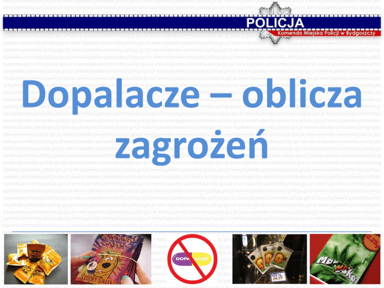 Dopalacze – oblicza zagrożeń Dopalacze • To substancje psychoaktywne, produkowane nielegalnie, zmieniające cechy narkotyku tak, aby mogły być legalnie dystrybuowane, po zażyciu wykazujące efekty narkotyczne1 • dopalacze syntetyczne- narkotyki projektowane • Nie wszystkie znajdują się na liście substancji kontrolowanych przepisami ustawy o przeciwdziałaniu narkomanii 1European Monitoring Centre for Drugs and Drug Addiction (EMCDDA, Lizbona) Jak działają dopalacze? • Substancje stymulujące - powodują rozdrażnienie i trudności w koncentracji uwagi • Mieszanki ziołowe, kanabinoidy – zażycie ich prowadzi do efektów niepożądanych w postaci kołatania serca, uczucia duszności, zaburzeń orientacji, niepokoju, stanów lękowych • Halucynogeny – osoba, która zażyła substancję doświadcza silnie obniżonego nastroju, lęków, uczucia zagrożenia, mogą też pojawić się zaburzenia osobowości i myśli samobójcze Szkodliwość dopalaczy • Stopień szkodliwości dopalaczy uzależniony jest od wielu czynników, m.in.: rodzaju dopalacza, ilości zawartych w nim toksycznych substancji, wieku, wagi i stanu zdrowia osoby zażywającej, okoliczności jakie towarzyszą zażywaniu dopalacza Szkodliwość dopalaczy • Dopalacze upośledzają funkcje mózgu, w zależności od wrażliwości organizmu wywołują nudności, bóle głowy, stany lękowe, drgawki, wysoką gorączkę, nadmierne pocenie się, bezsenność, problemy z oddychaniem, znużenie, urojenia, śpiączkę, wymioty i brązowienie skóry, a wieloletnie przyjmowanie dopalaczy może powodować nieodwracalne zaburzenia psychiczne Zakup dopalaczy • Pomimo napływających zewsząd wiadomości o szkodliwości dopalaczy, a także rosnącej liczby zatruć i ofiar śmiertelnych ich zażywania, nabycie tych środków za pośrednictwem internetu jest proste. Zakup dopalaczy • Bez problemu można odnaleźć reklamy promujące sklepy, np.: „Sklep z Dopalaczami dopalacze.sklep.pl to jedyne miejsce w internecie gdzie kupisz najtaniej, najlepsze dopalacze, RC chemicals. Jesteśmy najstarszym sklepem w internecie. Posiadamy wielu stałych zadowolonych klientów i największy asortyment w sieci. Nasz sklep online otwarty jest 24h w tygodniu. Oferujemy darmową dostawę w 1 dzień roboczy. W ofercie sklepu znajduję się bogaty wybór mefedronu 4-mmc i 3-mmc, magicznych ziół, wyciągaczy wilgoci oraz pigułki piorące. Polecamy nasz najnowszy specyfik rodem z Breaking Bad o nazwie Blue Sky Candy *zamiennik niebieskiej metaamfetaminy.” Towar kolekcjonerski • Handlarze nowych narkotyków twierdzą, że sprzedawany towar to przedmioty „kolekcjonerskie” i nie do spożycia. Problemy z dopalaczami • Nieznany skład opakowania; • Przebieg zatrucia indywidualny, różny u różnych osób – możliwe stany bezpośredniego zagrożenia życia oraz zgony; • Utraty przytomności, zaburzenia neurologiczne ( np. napady drgawkowe), w układzie oddechowym ( w tym zaburzenia oddychania wymagające respiratoterapii), zaburzenia kardiologiczne, hipertermia, zatrzymanie moczu…itp. • Agresja, pobudzenie psychoruchowe Problemy z dopalaczami • Leczenie objawowe; • Brak specyficznych odtrutek; • Brak możliwości identyfikacji w rutynowych badaniach toksykologicznych; • Zanieczyszczenia „tradycyjnymi” narkotykami ( np. amfetaminą); • Na rynku ciągle pojawia się nowa substancja DOPALACZE = ŚMIERĆ Ofiary dopalaczy Kamil 23 lata (zm. 2014), Gdańsk Grzegorz 24 lata (zm. 2014), Gdańsk Paweł 29 lat (zm. 2014), Kalisz Damian 16 lat (zm. 2013), Rybnik Tomasz 20 lat (zm. 2014), Jarocin Janusz 23 lata (zm. 2014), Katowice Mateusz 17 lat (zm. 2014), Olsztyn Ania – zdiagnozowana psychoza (2014), Elbląg Mikołaj 22 lata (zm. 2013), Krotoszyn Aleksander 19 lat – skazany za zabójstwo (2014), Słupsk oraz inni… Zgłoszone zatrucia dopalaczami • • • • 1079 zatruć dopalaczami w 2013 roku 2513 zatruć dopalaczami w 2014 roku 2752 zatruć dopalaczami od stycznia do czerwca 2015 roku 13 przypadków zgonów mogących mieć związek z zatruciem dopalaczami od początku roku Dane: gis.gov.pl Statystyki zgłoszonych zatruć w województwach wielkopolskie 15% zachodnio-pomorskie 2% dolnośląskie 4% kujawsko-pomorskie 6% 2015 (do maja) dolnośląskie lubelskie 3% kujawsko-pomorskie lubelskie lubuskie 7% warmińsko-mazurskie 6% lubuskie łódzkie małopolskie mazowieckie świętokrzyskie 1% łódzkie 25% opolskie podkarpackie podlaskie pomorskie śląskie 19% śląskie pomorskie 2% świętokrzyskie małopolskie 1% warmińsko-mazurskie podlaskie 2% wielkopolskie podkarpackie 1% opolskie 1% mazowieckie 4% zachodnio-pomorskie Dziękuję za uwagę mł. insp. Sławomir Szymański Zastępca Komendanta Miejskiego Policji w Bydgoszczy