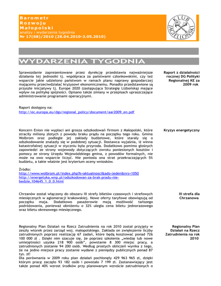 Barometr Rozwoju Małopolski analizy i wydarzenia tygodnia Nr 17(68)/2010 (26.04.2010-3.05.2010) IS WYDARZENIA TYGODNIA Sprawozdanie zaprezentowane przez dyrekcję przedstawia najważniejsze działania tej jednostki tj. współpraca za państwami członkowskimi, czy też wsparcie jakie udzielono państwom w ramach planu naprawy gospodarczej mającemu przeciwdziałać kryzysowi ekonomicznemu. Ponadto przedstawione są przyszłe inicjatywy tj. Europe 2020 (zastępująca Strategię Lizbońską) mające wpływ na politykę spójności. Opisano także zmiany w przepisach upraszczające administrowanie programami operacyjnymi. I Raport z działalności rocznej DG Polityki Regionalnej KE za 2009 rok Raport dostępny na: http://ec.europa.eu/dgs/regional_policy/document/aar2009_en.pdf Koncern Enion nie wypłaci ani grosza odszkodowań firmom z Małopolski, które straciły miliony złotych z powodu braku prądu na początku tego roku. Gmina Wolbrom oraz podległe jej zakłady budżetowe, które starały się o odszkodowanie znalazły się w podobnej sytuacji. Dostawca wyjaśnia, iż winna katastrofalnej sytuacji w styczniu była przyroda. Dodatkowo pomimo głośnych zapowiedzi ze strony wojewody dotyczących zwrotu poniesionych kosztów i pomocy ze strony Urzędu Wojewódzkiego gmina, z powodów formalnych, nie może na owo wsparcie liczyć. Nie poniosła ona strat przekraczających 5% budżetu, a takie właśnie jest kryterium oceny wniosków. Kryzys energetyczny Źródło: http://www.wolbrom.pl/index.php?k=aktualnosci&ads=jeden&nrs=1050 http://energetyka.wnp.pl/odszkodowan-za-brak-pradu-niebedzie,104645_1_0_0.html Chrzanów został włączony do obszaru III strefy biletów czasowych i strefowych miesięcznych w aglomeracji krakowskiej. Nowe oferty taryfowe obowiązują od początku maja. Dodatkowo pasażerowie mają możliwość tańszego podróżowania, ponieważ obniżeniu o 32% uległa cena biletu jednorazowego oraz biletu okresowego miesięcznego. III strefa dla Chrzanowa Regionalny Plan Działań na Rzecz Zatrudnienia na rok 2010 został przyjęty w zeszły wtorek przez zarząd woj. małopolskiego. Zakłada on zwiększenie liczby zatrudnionych poprzez realizację 67 zadań, które będą kosztować ponad 726 100 000 zł . Dzięki nim szacuje się, że poprzez szkolenia „wiedzę lub nowe umiejętności uzyska 218 900 osób”, powstanie 8 300 miejsc pracy, a zatrudnionych zostanie 94 200 osób. Według prostych obliczeń wynika z tego, że na jedno miejsce pracy zostanie wydane z pieniędzy publicznych ponad 87 tys. zł! Dla porównania w 2009 roku plan działań pochłonęły 429 963 965 zł, dzięki którym pracę zaczęło 93 182 osób i powstało 7 199 zł. Zastanawiający jest także ponad 40% wzrost środków przy planowanym wzroście zatrudnionych o Regionalny Plan Działań na Rzecz Zatrudnienia na rok 2010 Barometr Rozwoju Małopolski analizy i wydarzenia tygodnia Nr 17(68)/2010 (26.04.2010-3.05.2010) ponad 1% i 12% wzroście miejsc pracy. Stopa bezrobocia w MLP w 2007 roku wynosiła 8,7%, a w 2008 – 7,5%. Źródło: http://www.malopolskie.pl/Wydarzenia/Index.aspx?id=5764 Tydzień temu pisaliśmy o projekcie w zakresie gospodarki wodno-ściekowej w Myślenicach, który otrzymał gwarancję na dofinansowanie w kwocie Projekt ponad 112 mln zł. W tym tygodniu mamy namacalny efekt porównywalnego projektu w Wadowicach. Realizowany w latach 2005-2009 kosztował 18,2 mln euro (z czego 15 mln pochodziło jeszcze z Funduszu Spójności), za które wybudowane m. in. 54 km sieci kanalizacji sanitarnej i 16,1 km sieci wodociągowej. Znowu kanał(y) Źródło: http://www.malopolskie.pl/Wydarzenia/Index.aspx?id=5778 Podczas Targów Turystyki i Wypoczynku Lato 2010 (24-25.04) zorganizowanych w Warszawie, można było zapoznać się z ofertami turystycznymi Małopolski. W związku ze zbliżającymi się weekendami majowymi i wakacjami, nasz region prezentował swoje atrakcje na ten okres. Turystyka jest niezwykle ważna dla rozwoju Krakowa i okolic, dlatego tym bardziej należy pochwalić owo działanie Małopolskiej Organizacji Turystycznej. Ważne jest też, że przy organizacji stanowiska współdziałało wiele jednostek: Województwo Małopolskie Miasto Kraków, Tarnowskie Centrum Informacji wraz z Powiatem Tarnowskim, Powiat Suski, Stowarzyszenie Turystyczna Podkowa, Kopalnia Soli w Bochni oraz Lokalna Organizacja Turystyczna „Pieniny – Kraina niezwykła”. Targi w Warszawie Źródło: http://www.mot.krakow.pl/index,a,f,c,5,d,419.html http://www.bochnia.starostwo.gov.pl/aktualnosci/powiat-na-targach-wwarszawie.html Władze Nowego Wiśnicza rozpoczęły prace nad Lokalnym Programem Rewitalizacji. Zaczęły je w sposób godny pochwały, gdyż postanowiono skonsultować się z mieszkańcami. Ze strony Miasta mogą pobrać oni ankietę, w której pytani są o to co, dlaczego i w jaki sposób powinno zostać odnowione. Źródło: http://umwisnicz.home.pl/index.php? option=com_content&task=view&id=2123&Itemid=92 Wypowiedz się! Barometr Rozwoju Małopolski analizy i wydarzenia tygodnia Nr 17(68)/2010 (26.04.2010-3.05.2010) Niniejszy przegląd kończymy informacją o X Forum Kobiet, który odbył się w gminie Biskupice. Byłby to miły finał, gdyby nie… Podczas spotkania panie rozmawiały o profilaktyce chorób nowotworowych. Popieramy. Uczyły się komponować kwiaty i malować paznokcie… Jesteśmy rozczarowani. Mieliśmy nadzieję, iż przyciągnięcie szerokiego grona kobiet będzie okazją do poważnych rozważań czy obalania stereotypów. Być kobietą… Źródło: http://www.biskupice.pl/aktualnosci/x-forum-kobiet.html opracował zespół: Łukasz Drozdek, Michał Dulak, Maciej Gomółka, Joanna Heilig, Magdalena Jagła, Łukasz Leszczyński, Barbara Łącka, Jadwiga Klag, Aleksandra Skworzec, Tomasz Smoleń, Anna Sulima, Łukasz Wiślicki analiza tygodnia: Tomasz Smoleń, Łukasz Wiślicki opieka merytoryczna: Bożena Pietras-Goc koordynacja: Wojciech Przybylski Copyright 