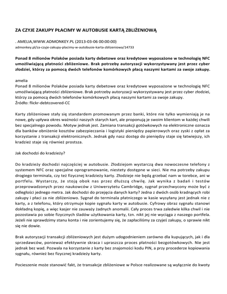 ZA CZYJE ZAKUPY PŁACIMY W AUTOBUSIE KARTĄ ZBLIŻENIOWĄ . AMELIA,WWW.ADMONKEY.PL (2013-03-06 00:00:00) admonkey.pl/za-czyje-zakupy-placimy-w-autobusie-karta-zblizeniowa/14733 Ponad 8 milionów Polaków posiada karty debetowe oraz kredytowe wyposażone w technologię NFC umożliwiającą płatności zbliżeniowe. Brak potrzeby autoryzacji wykorzystywany jest przez cyber złodziei, którzy za pomocą dwóch telefonów komórkowych płacą naszymi kartami za swoje zakupy. amelia Ponad 8 milionów Polaków posiada karty debetowe oraz kredytowe wyposażone w technologię NFC umożliwiającą płatności zbliżeniowe. Brak potrzeby autoryzacji wykorzystywany jest przez cyber złodziei, którzy za pomocą dwóch telefonów komórkowych płacą naszymi kartami za swoje zakupy. Źródło: flickr-debtcovered-CC Karty zbliżeniowe stały się standardem promowanym przez banki, które nie tylko wymieniają je na nowe, gdy upływa okres ważności naszych starych kart, ale proponują je swoim klientom w każdej chwili bez specjalnego powodu. Motyw jednak jest. Zamiana transakcji gotówkowych na elektroniczne oznacza dla banków obniżenie kosztów zabezpieczania i logistyki pieniędzy papierowych oraz zyski z opłat za korzystanie z transakcji elektronicznych. Jednak gdy nasz dostęp do pieniędzy staje się łatwiejszy, ich kradzież staje się również prostsza. Jak dochodzi do kradzieży? Do kradzieży dochodzi najczęściej w autobusie. Złodziejom wystarczą dwa nowoczesne telefony z systemem NFC oraz specjalne oprogramowanie, niestety dostępne w sieci. Nie ma potrzeby zakupu drogiego terminala, czy też fizycznej kradzieży karty. Złodzieje nie będą grzebać nam w torebce, ani w portfelu. Wystarczy, że stoją obok nas przez dłuższą chwilę. Jak wynika z badań i testów przeprowadzonych przez naukowców z Uniwersytetu Cambridge, sygnał przechwycony może być z odległości jednego metra. Jak dochodzi do przejęcia danych karty? Jedna z dwóch osób kradnących robi zakupy i płaci za nie zbliżeniowo. Sygnał do terminala płatniczego w kasie wysyłany jest jednak nie z karty, a z telefonu, który otrzymuje kopie sygnału karty w autobusie. Cyfrowy obraz sygnału stanowi dokładną kopię, a więc kasjer nie zauważy żadnych anomalii. Cały proces trwa zaledwie kilka chwil i nie pozostawia po sobie fizycznych śladów użytkowania karty, tzn. nikt jej nie wyciąga z naszego portfela. Jeżeli nie sprawdzimy stanu konta i nie zorientujemy się, że zapłaciliśmy za czyjeś zakupy, o sprawie nikt się nie dowie. Brak autoryzacji transakcji zbliżeniowych jest dużym udogodnieniem zarówno dla kupujących, jak i dla sprzedawców, ponieważ efektywnie skraca i upraszcza proces płatności bezgotówkowych. Nie jest jednak bez wad. Pozwala na korzystanie z karty bez znajomości kodu PIN, a przy procederze kopiowania sygnału, również bez fizycznej kradzieży karty. Pocieszenie może stanowić fakt, że transakcje zbliżeniowe w Polsce realizowane są wyłącznie do kwoty 50 złotych, czyli potencjalne straty z tytułu kradzieży będą niewielkie. Jednak z drugiej strony liczba tych transakcji, teoretycznie ograniczona do 5 dziennie, może spowodować wyczyszczenie naszego konta. W jaki sposób? Znany jest przypadek 78 transakcji wykonanych kartą zbliżeniową jednego dnia, ponieważ tego typu płatności wykonywane są w trybie offline i nie są rejestrowane w czasie rzeczywistym. Banki otrzymują coraz więcej reklamacji związanych z nieprawnym użyciem kart zbliżeniowych przez osoby postronne. Z racji tego, że autoryzacja transakcji przy użyciu takiej karty odbywa się poprzez jej posiadanie w portfelu, kieszeni, nie pozostają inne ślady jej użycia, takie jak podpis, czy PIN. Ubezpieczenia kart często pokrywają straty w wyniku takich transakcji od kwoty 200 PLN, a więc jeśli straciliśmy 50, 100, lub 150 złotych, ubezpieczenie nas nie dotyczy. Warto zwrócić na to uwagę przy podpisywaniu umowy z bankiem. Czy można bezpiecznie korzystać z kart zbliżeniowych? Okazuje się, że najlepiej zabezpieczeni przed przechwytywaniem danych z kart płatniczych są posiadacze telefonów z możliwością płatności zbliżeniowej takich jak T-Mobile My Wallet, czy Orange Cash. Najpierw wprowadzają dane karty lub kart do telefonu, a następnie korzystają z sygnału wysyłanego z komórki podczas płatności. Uruchomienie takiej płatności wymaga autoryzacji PIN w telefonie, a więc właściciele kart są świadomi każdej transakcji. Mogą również przy pomocy kilku kliknięć wyłączyć przekazywanie danych NFC. Posiadacze kart zbliżeniowych takiej możliwości nie mają. Testowanie nowych technologii Nowe technologie stawiają przed projektantami, deweloperami i informatykami nowe wyzwania komunikacyjne. Nie chodzi tylko o warstwę oprogramowania i sprzęt, ale także o „user experience”, czyli wrażenia użytkownika, a także jego poziom wiedzy i umiejętności do posługiwania się tą technologią. Jeżeli wrażenia są złe, a technologia trudna lub niebezpieczna w codziennym użytkowaniu, to może się nie przyjąć. Takimi prawami rządzą się finansowe aplikacje mobilne. W przypadku „płatności przez telefon” zagrożenia dla danych użytkownika mogą powstawać dopiero w momencie fizycznego kontaktu atakującego z urządzeniem, na przykład kradzieży telefonu. – Warto w procesie projektowym kłaść nacisk nie tylko na identyfikację kluczowych funkcjonalności, ale i głównych zagrożeń dla bezpieczeństwa danych – mówi Mateusz Biliński, mobility manager w Lizard Mobile. – Wspomaganie się tutaj ekspertyzą osób spoza projektu, które zadają właściwe pytania, skutecznie zwiększa szanse aplikacji na zaistnienie w świecie mobilnym – dodaje. Warto inwestować w najnowsze technologie oraz uczyć się jak korzystać z tych, które już na co dzień nosimy w portfelu. Jak zabezpieczyć się przed nieautoryzowanym użyciem naszej karty radzi 