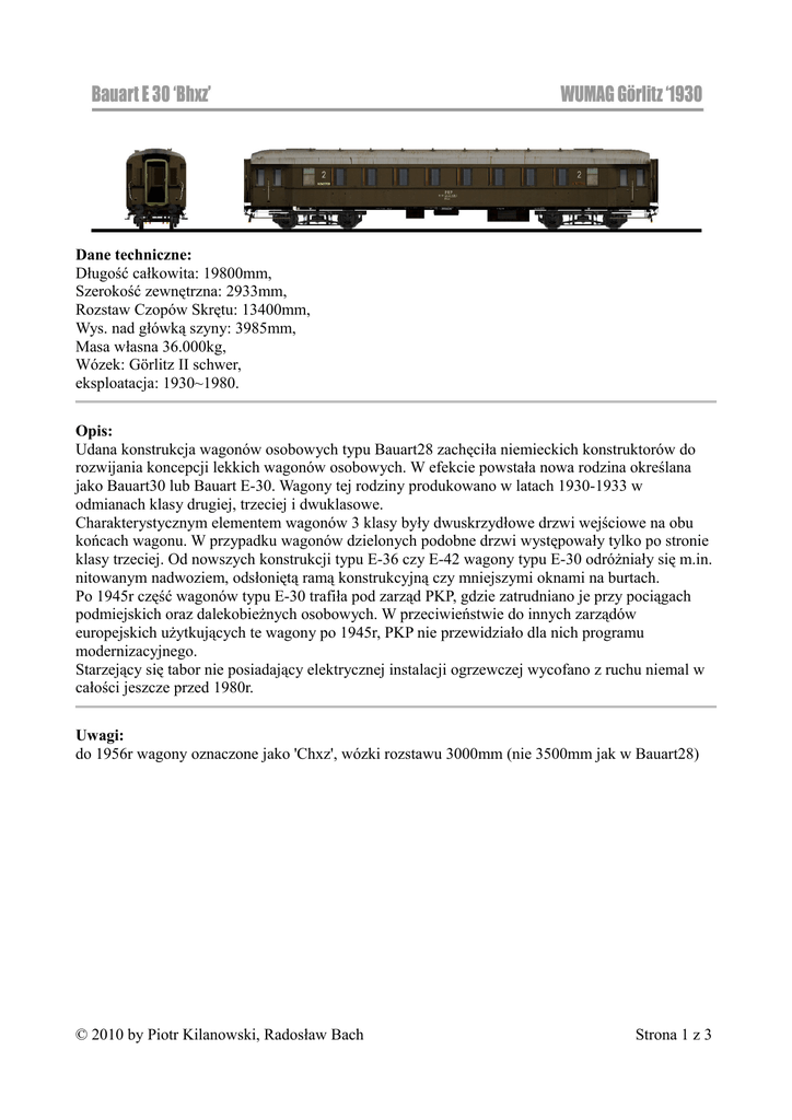 Dane techniczne: Długość całkowita: 19800mm, Szerokość zewnętrzna: 2933mm, Rozstaw Czopów Skrętu: 13400mm, Wys. nad główką szyny: 3985mm, Masa własna 36.000kg, Wózek: Görlitz II schwer, eksploatacja: 1930~1980. Opis: Udana konstrukcja wagonów osobowych typu Bauart28 zachęciła niemieckich konstruktorów do rozwijania koncepcji lekkich wagonów osobowych. W efekcie powstała nowa rodzina określana jako Bauart30 lub Bauart E-30. Wagony tej rodziny produkowano w latach 1930-1933 w odmianach klasy drugiej, trzeciej i dwuklasowe. Charakterystycznym elementem wagonów 3 klasy były dwuskrzydłowe drzwi wejściowe na obu końcach wagonu. W przypadku wagonów dzielonych podobne drzwi występowały tylko po stronie klasy trzeciej. Od nowszych konstrukcji typu E-36 czy E-42 wagony typu E-30 odróżniały się m.in. nitowanym nadwoziem, odsłoniętą ramą konstrukcyjną czy mniejszymi oknami na burtach. Po 1945r część wagonów typu E-30 trafiła pod zarząd PKP, gdzie zatrudniano je przy pociągach podmiejskich oraz dalekobieżnych osobowych. W przeciwieństwie do innych zarządów europejskich użytkujących te wagony po 1945r, PKP nie przewidziało dla nich programu modernizacyjnego. Starzejący się tabor nie posiadający elektrycznej instalacji ogrzewczej wycofano z ruchu niemal w całości jeszcze przed 1980r. Uwagi: do 1956r wagony oznaczone jako 'Chxz', wózki rozstawu 3000mm (nie 3500mm jak w Bauart28) © 2010 by Piotr Kilanowski, Radosław Bach Strona 1 z 3 Zdjęcia Wagon Bhxz Bauart30 na stacji Białystok, 27.06.2009. Wagon nie posiada oryginalnych wózków Gorlitz II Schwer, ma wózki typowe dla rodziny 1A. Ciekawe, gdzie podziały się oryginalne? Photo by Piotr Kilanowski. Wagon Bhxz Bauart30 (ex-C4u30) na stacji Białystok, 19.03.2010. Wagon nie posiada oryginalnych wózków, ma wózki typowe dla rodziny 1A. Photo by Piotr Kilanowski. © 2010 by Piotr Kilanowski, Radosław Bach Strona 2 z 3 Wrak wagonu Bauart30 w krzakach na stacji Toruń Główny. Kolejny przykład "dbania" o tabor zabytkowy w naszym pięknym kraiku... 19.03.2010. Photo by Piotr Kilanowski. © 2010 by Piotr Kilanowski, Radosław Bach Strona 3 z 3