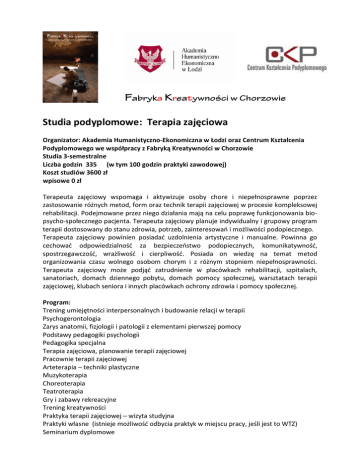 Studia podyplomowe: Terapia zajęciowa Organizator: Akademia Humanistyczno-Ekonomiczna w Łodzi oraz Centrum Kształcenia Podyplomowego we współpracy z Fabryką Kreatywności w Chorzowie Studia 3-semestralne Liczba godzin 335 (w tym 100 godzin praktyki zawodowej) Koszt studiów 3600 zł wpisowe 0 zł Terapeuta zajęciowy wspomaga i aktywizuje osoby chore i niepełnosprawne poprzez zastosowanie różnych metod, form oraz technik terapii zajęciowej w procesie kompleksowej rehabilitacji. Podejmowane przez niego działania mają na celu poprawę funkcjonowania biopsycho-społecznego pacjenta. Terapeuta zajęciowy planuje indywidualny i grupowy program terapii dostosowany do stanu zdrowia, potrzeb, zainteresowań i możliwości podopiecznego. Terapeuta zajęciowy powinien posiadać uzdolnienia artystyczne i manualne. Powinna go cechować odpowiedzialność za bezpieczeństwo podopiecznych, komunikatywność, spostrzegawczość, wrażliwość i cierpliwość. Posiada on wiedzę na temat metod organizowania czasu wolnego osobom chorym i z różnym stopniem niepełnosprawności. Terapeuta zajęciowy może podjąć zatrudnienie w placówkach rehabilitacji, szpitalach, sanatoriach, domach dziennego pobytu, domach pomocy społecznej, warsztatach terapii zajęciowej, klubach seniora i innych placówkach ochrony zdrowia i pomocy społecznej. Program: Trening umiejętności interpersonalnych i budowanie relacji w terapii Psychogerontologia Zarys anatomii, fizjologii i patologii z elementami pierwszej pomocy Podstawy pedagogiki psychologii Pedagogika specjalna Terapia zajęciowa, planowanie terapii zajęciowej Pracownie terapii zajęciowej Arteterapia – techniki plastyczne Muzykoterapia Choreoterapia Teatroterapia Gry i zabawy rekreacyjne Trening kreatywności Praktyka terapii zajęciowej – wizyta studyjna Praktyki własne (istnieje możliwość odbycia praktyk w miejscu pracy, jeśli jest to WTZ) Seminarium dyplomowe Organizacja studiów: Czas trwania: marzec 2016 – marzec 2017 Część zajęć realizowana jest w formie bezpośrednich spotkań, a część w formie e-learningowej, dzięki czemu zjazdy odbywają się 1 x w miesiącu w soboty i niedziele w godzinach 09.00 – 18.00. Dodatkowo planowany jest jeden 7-dniowy zjazd w lipcu 2016 w dniach 11-17.07.2016. Terminy zjazdów w I semestrze: 19-20.03.2016 23-24.04.2016 07-08.05.2016 04-05.06.2016 09.07-15.07.2016 Podane terminy mogą ulec niewielkim zmianom. Istnieje również możliwość przesunięcia terminów na wniosek grupy. Opiekun merytoryczny: Jolanta Łysakowska Organizacja: Tomasz Gluźniewicz W sytuacji losowej, w przypadku braku możliwości uczestnictwa w zajęciach, student może indywidualne zaliczyć wybrany przedmiot w dogodnym terminie przed zakończeniem studiów. Odpłatność za studia można dokonać w całości przed rozpoczęciem się zajęć, w dwóch ratach po 1800 zł lub w 12 ratach po 300 zł. Wymagane dokumenty: •podpisana kopia dyplomu ukończenia studiów wyższych •formularz zgłoszeniowy •kserokopia dowodu osobistego Miejsce realizacji Studiów podyplomowych: Kowary Osoby zainteresowane prosimy o kontakt: Fabryka Kreatywności tel.: 666-353-121 e-mail: [email protected] www.fabrykakreatywnosci.pl Istnieje możliwość uzyskania dofinansowania w wysokości 80% lub 100% w ramach Krajowego Funduszu Szkoleniowego. Dofinansowanie jest przyznawane przez Urząd Pracy osobom pracującym. O dofinansowanie mogą starać się również osoby bezrobotne.