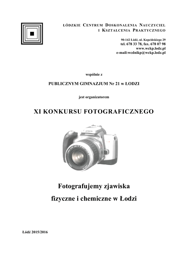 ŁÓDZKIE C ENTRUM D OSKONALENIA N AUCZYCIEL I K SZTAŁCENIA P RAKTYCZNEGO 90-142 Łódź, ul. Kopcińskiego 29 tel. 678 33 78, fax. 678 07 98 www.wckp.lodz.pl e-mail:[email protected] wspólnie z PUBLICZNYM GIMNAZJUM Nr 21 w ŁODZI jest organizatorem XI KONKURSU FOTOGRAFICZNEGO Fotografujemy zjawiska fizyczne i chemiczne w Łodzi Łódź 2015/2016 REGULAMIN XI KONKURSU FOTOGRAFICZNEGO Fotografujemy zjawiska fizyczne i chemiczne w Łodzi I. ORGANIZATOR Łódzkie Centrum Doskonalenia Nauczycieli Publiczne Gimnazjum nr 21 w Łodzi . i Kształcenia Praktycznego oraz II. ADRESAT KONKURSU Uczniowie gimnazjów i szkół ponadgimnazjalnych. z Łodzi (z włączeniem gimnazjów z Brzezin, Lutomierska, Rogowa, Przecławia i Aleksandrowa Łódzkiego). III. CELE KONKURSU • • • Rozwijanie zainteresowań i uzdolnień uczniów. Stwarzanie uczniom możliwości osiągnięcia sukcesu. Wzbogacenie form pracy z uczniami zdolnymi. IV. PRZEDMIOT OCENY KONKURSOWEJ 1. Komisja konkursowa oceniać będzie dostarczone zdjęcia obrazujące zjawiska fizyczne i chemiczne, na papierze fotograficznym (pełen połysk) w formacie nie mniejszym niż 13 cm x 18 cm w następujących kategoriach: • • • obserwacja fizyczna lub chemiczna, eksperyment fizyczny lub chemiczny, walory artystyczne. 2. Każde dostarczone na konkurs zdjęcie musi być podpisane tj. nazwisko i imię autora oraz nazwa szkoły. 3. Wszystkie dostarczone na konkurs zdjęcia przedstawionego zjawiska lub eksperymentu. muszą zawierać krótki opis 4. Każdemu uczestnikowi przysługuje prawo przekazania na konkurs nie więcej niż pięciu zdjęć 5. Do zdjęć należy dołączyć podpisaną (tj. nazwisko i imię autora oraz nazwa szkoły) płytę CD/DVD z zapisanymi w formie cyfrowej zdjęciami jako pliki jpg, które będą wykorzystane podczas podsumowanie konkursu. 6. Organizator ma prawo do weryfikacji nadesłanych zdjęć, ma prawo nie przyjąć do konkursu zdjęć nieprzedstawiających obserwacji bądź eksperymentu fizycznego lub chemicznego, a także nie uwzględnić w konkursie prac posiadających wady, np. złą jakość zdjęcia lub uszkodzenia wynikłe np. z nieodpowiedniego zabezpieczenia przesyłki. V. ZALECANA LITERATURA Wszystkie dostępne periodyki z fotografii. VI. STRUKTURA I PRZEBIEG KONKURSU Organizowany konkurs jest dwuetapowy. Etap I – szkolny (z włączeniem gimnazjów z Brzezin, Lutomierska, Rogowa, Przecławia i Aleksandrowa Łódzkiego), Etap II – ogólnołódzki. Eliminacje konkursowe na I etapie przeprowadzi Szkolna Komisja Konkursowa powołana przez Dyrektora Szkoły. Eliminacje konkursowe na II etapie zostaną przeprowadzone przez Komisję Konkursową powołaną przez Dyrektora Łódzkiego Centrum Doskonalenia Nauczycieli i Kształcenia Praktycznego. VII. TERMINARZ KONKURSU Etap I – szkolny - do 15 grudnia 2015 roku, Etap II – ogólnołódzki - do 8 stycznia 2016 roku, O ewentualnej zmianie terminu i godziny przeprowadzenia eliminacji konkursowych szkoły zostaną powiadomione odrębnym pismem. VIII. ZGŁASZANIE UCZNIÓW DO KONKURSU KARTĘ ZGŁOSZENIA UCZESTNICTWA W KONKURSIE (w załączeniu) wraz ze zdjęciami fotograficznymi należy: przesłać pocztą z dopiskiem „Fotografujemy zjawiska fizyczne i chemiczne w Łodzi” lub pozostawić w sekretariacie ŁCDNiKP, ul. Kopcińskiego 29 – p.105 do dnia 8 stycznia 2016 roku. IX. MIEJSCE PRZEPROWADZENIA ELIMINACJI KONKURSOWYCH Łódzkie Centrum Doskonalenia Nauczycieli i Kształcenia Praktycznego O ewentualnej zmianie miejsca przeprowadzenia eliminacji konkursowych szkoły zostaną powiadomione odrębnym pismem. X. SPOSÓB I TERMIN OGŁASZANIA WYNIKÓW 1. Komisja dokona wyboru zdjęć oraz 7 marca 2016 roku. przyzna nagrody w terminie do dnia 2. Rozstrzygnięcie i podsumowanie konkursu, na które zaproszeni są wszyscy uczniowie uczestnicy konkursu wraz ze swymi nauczycielami odbędzie się 8 kwietnia 2016 roku w ŁCDNiKP. 3. Po podsumowaniu konkursu lista nagrodzonych osób będzie dostępna na witrynie internetowej ŁCDNiKP (www.wckp.lodz.pl) od dnia 11 kwietnia 2016 roku. XI. NAGRODY 1. Spośród nadesłanych zdjęć, Komisja konkursowa wybierze zdjęcia fotograficzne, którym zostaną przyznane w każdej kategorii poszczególne miejsca: • • • I miejsce, II miejsce, III miejsce. dodatkowo Komisja przyzna 3 wyróżnienia. 2. Uczestnicy konkursu, którzy zajęli jedno z powyższych miejsc oraz ich nauczyciele zostaną uhonorowani dyplomami. XII. UWAGI KOŃCOWE 1. Organizator nie przyjmuje negatywów zdjęć. 2. Uczestnik konkursu oraz opiekun nauczyciel składając swój podpis na karcie zgłoszenia oświadcza, że: posiada autorskie prawa do zdjęcia i przenosi je na ŁCDNiKP w zakresie niezbędnym do jego publikacji i innego rozpowszechniania oraz dokonywania jego opracowania w stopniu, jaki organizator uzna za stosowny i wskazany dla prawidłowej realizacji założeń konkursu, • zdjęcia nie zostały uprzednio nigdzie publikowane, • wyraża zgodę na przetwarzanie i udostępnianie danych osobowych uczestnika konkursu. • 3. Organizator nie jest zobowiązany do zwrotu nadesłanych materiałów. 4. Organizator nie ponosi odpowiedzialności za niezawinione przez organizatora działania P.P.U.P. „Poczty Polskiej”. XIII. ZAŁĄCZNIKI Załącznik Nr 1- KARTA ZGŁOSZENIA UCZESTNICTWA W KONKURSIE ZAŁĄCZNIK NR 1 ........................... (data) ............................................. (pieczęć Szkoły) Łódzkie Centrum Doskonalenia Nauczycieli i Kształcenia Praktycznego ul. Kopcińskiego 29 90 – 142 Łódź KOMISJA XI KONKURSU FOTOGRAFICZNEGO FOTOGRAFUJEMY ZJAWISKA FIZYCZNE I CHEMICZNE W ŁODZI KARTA ZGŁOSZENIA UCZESTNICTWA W KONKURSIE LP. IMIĘ I NAZWISKO UCZNIA (wpisać drukowanymi literami) KLASA IMIĘ I NAZWISKO NAUCZYCIELA PROWADZĄCEGO PODPIS NAUCZYCIELA PROWADZĄCEGO NAZWA SZKOŁY: ..................................................................................................................... ADRES SZKOŁY: ..............