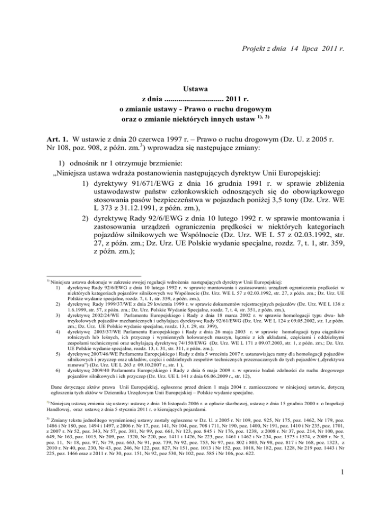 Projekt z dnia 14 lipca 2011 r. Ustawa z dnia .............................. 2011 r. o zmianie ustawy - Prawo o ruchu drogowym oraz o zmianie niektórych innych ustaw 1), 2) Art. 1. W ustawie z dnia 20 czerwca 1997 r. – Prawo o ruchu drogowym (Dz. U. z 2005 r. Nr 108, poz. 908, z późn. zm.3) wprowadza się następujące zmiany: 1) odnośnik nr 1 otrzymuje brzmienie: „Niniejsza ustawa wdraża postanowienia następujących dyrektyw Unii Europejskiej: 1) dyrektywy 91/671/EWG z dnia 16 grudnia 1991 r. w sprawie zbliżenia ustawodawstw państw członkowskich odnoszących się do obowiązkowego stosowania pasów bezpieczeństwa w pojazdach poniżej 3,5 tony (Dz. Urz. WE L 373 z 31.12.1991, z późn. zm.), 2) dyrektywę Rady 92/6/EWG z dnia 10 lutego 1992 r. w sprawie montowania i zastosowania urządzeń ograniczenia prędkości w niektórych kategoriach pojazdów silnikowych we Wspólnocie (Dz. Urz. WE L 57 z 02.03.1992, str. 27, z późn. zm.; Dz. Urz. UE Polskie wydanie specjalne, rozdz. 7, t. 1, str. 359, z późn. zm.); 1) Niniejsza ustawa dokonuje w zakresie swojej regulacji wdrożenia następujących dyrektyw Unii Europejskiej: 1) dyrektywę Rady 92/6/EWG z dnia 10 lutego 1992 r. w sprawie montowania i zastosowania urządzeń ograniczenia prędkości w niektórych kategoriach pojazdów silnikowych we Wspólnocie (Dz. Urz. WE L 57 z 02.03.1992, str. 27, z późn. zm.; Dz. Urz. UE Polskie wydanie specjalne, rozdz. 7, t. 1, str. 359, z późn. zm.), 2) dyrektywę Rady 1999/37/WE z dnia 29 kwietnia 1999 r. w sprawie dokumentów rejestracyjnych pojazdów (Dz. Urz. WE L 138 z 1.6.1999, str. 57, z późn. zm.; Dz. Urz. Polskie Wydanie Specjalne, rozdz. 7, t. 4, str. 351, z późn. zm.), 3) dyrektywę 2002/24/WE Parlamentu Europejskiego i Rady z dnia 18 marca 2002 r. w sprawie homologacji typu dwu- lub trzykołowych pojazdów mechanicznych i uchylająca dyrektywę Rady 92/61/EWG (Dz. Urz. WE L 124 z 09.05.2002, str. 1,z późn. zm.; Dz. Urz. UE Polskie wydanie specjalne, rozdz. 13, t. 29, str. 399), 4) dyrektywę 2003/37/WE Parlamentu Europejskiego i Rady z dnia 26 maja 2003 r. w sprawie homologacji typu ciągników rolniczych lub leśnych, ich przyczep i wymiennych holowanych maszyn, łącznie z ich układami, częściami i oddzielnymi zespołami technicznymi oraz uchylającą dyrektywę 74/150/EWG (Dz. Urz. WE L 171 z 09.07.2003, str. 1, z późn. zm.; Dz. Urz. UE Polskie wydanie specjalne, rozdz. 13, t. 31, str. 311, z późn. zm.), 5) dyrektywę 2007/46/WE Parlamentu Europejskiego i Rady z dnia 5 września 2007 r. ustanawiająca ramy dla homologacji pojazdów silnikowych i przyczep oraz układów, części i oddzielnych zespołów technicznych przeznaczonych do tych pojazdów („dyrektywa ramowa”) (Dz. Urz. UE L 263 z 09.10.2007 r., str. 1 ), 6) dyrektywę 2009/40 Parlamentu Europejskiego i Rady z dnia 6 maja 2009 r. w sprawie badań zdolności do ruchu drogowego pojazdów silnikowych i ich przyczep (Dz. Urz. UE L 141 z dnia 06.06.2009 r., str. 12), Dane dotyczące aktów prawa Unii Europejskiej, ogłoszone przed dniem 1 maja 2004 r. zamieszczone w niniejszej ustawie, dotyczą ogłoszenia tych aktów w Dzienniku Urzędowym Unii Europejskiej – Polskie wydanie specjalne. 2) Niniejszą ustawą zmienia się ustawy: ustawę z dnia 16 listopada 2006 r. o opłacie skarbowej, ustawę z dnia 15 grudnia 2000 r. o Inspekcji Handlowej, oraz ustawę z dnia 5 stycznia 2011 r. o kierujących pojazdami. 3) Zmiany tekstu jednolitego wymienionej ustawy zostały ogłoszone w Dz. U. z 2005 r. Nr 109, poz. 925, Nr 175, poz. 1462, Nr 179, poz. 1486 i Nr 180, poz. 1494 i 1497, z 2006 r. Nr 17, poz. 141, Nr 104, poz. 708 i 711, Nr 190, poz. 1400, Nr 191, poz. 1410 i Nr 235, poz. 1701, z 2007 r. Nr 52, poz. 343, Nr 57, poz. 381, Nr 99, poz. 661, Nr 123, poz. 845 i Nr 176, poz. 1238, z 2008 r. Nr 37, poz. 214, Nr 100, poz. 649, Nr 163, poz. 1015, Nr 209, poz. 1320, Nr 220, poz. 1411 i 1426, Nr 223, poz. 1461 i 1462 i Nr 234, poz. 1573 i 1574, z 2009 r. Nr 3, poz. 11, Nr 18, poz. 97, Nr 79, poz. 663, Nr 91, poz. 739, Nr 92, poz. 753, Nr 97, poz. 802 i 803, Nr 98, poz. 817 i Nr 168, poz. 1323, z 2010 r. Nr 40, poz. 230, Nr 43, poz. 246, Nr 122, poz. 827, Nr 151, poz. 1013 i Nr 152, poz. 1018, Nr 182, poz. 1228, Nr 219 poz. 1443 i Nr 225, poz. 1466 oraz z 2011 r. Nr 30, poz. 151, Nr 92, poz 530, Nr 102, poz. 585 i Nr 106, poz. 622. 1 3) dyrektywy 96/53/WE z dnia 25 lipca 1996 r. ustanawiającej dla niektórych pojazdów drogowych poruszających się na terytorium Unii Europejskiej maksymalne dopuszczalne wymiary w ruchu krajowym i międzynarodowym oraz maksymalne dopuszczalne obciążenia w ruchu międzynarodowym (Dz. Urz. UE L 235 z 17.09.1996, str. 59—75, z późn. zm., Polskie wydanie specjalne: rozdz. 7, t. 2 str. 478 – 494); 4) dyrektywy 97/27/WE z dnia 22 lipca 1997 r. odnoszącej się do mas i wymiarów niektórych kategorii pojazdów silnikowych i ich przyczep oraz zmieniającej dyrektywę 70/156/EWG (Dz.U. UE L 233 z 25.8.1997, str. 1— 31, z późn. zm., Polskie wydanie specjalne: rozdz. 3, t.19 str. 200 – 230); 5) dyrektywę Rady 1999/37/WE z dnia 29 kwietnia 1999 r. w sprawie dokumentów rejestracyjnych pojazdów (Dz. Urz. WE L 138 z 1.6.1999, str. 57, z późn. zm.; Dz. Urz. Polskie wydanie specjalne, rozdz. 7, t. 4, str. 351, z późn. zm.); 6) dyrektywy 2000/30/WE z dnia 6 czerwca 2000 r. w sprawie drogowej kontroli przydatności do ruchu pojazdów użytkowych poruszających się we Wspólnocie (Dz.U. WE L 203 z 10.8.2000, str. 1—8, z późn. zm., Polskie wydanie specjalne: rozdz.7, t. 5 str. 80 – 87); 7) dyrektywę 2002/24/WE Parlamentu Europejskiego i Rady z dnia 18 marca 2002 r. w sprawie homologacji typu dwu- lub trzykołowych pojazdów mechanicznych i uchylająca dyrektywę Rady 92/61/EWG (Dz. Urz. WE L 124 z 09.05.2002, str. 1,z późn. zm.; Dz. Urz. UE Polskie wydanie specjalne, rozdz. 13, t. 29, str. 399); 8) dyrektywy 2003/20/WE Parlamentu Europejskiego i Rady z dnia 8 kwiet