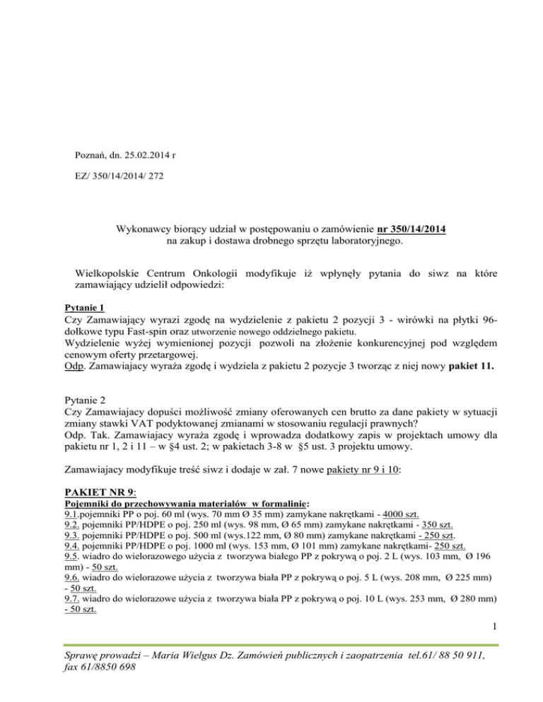 Poznań, dn. 25.02.2014 r EZ/ 350/14/2014/ 272 Wykonawcy biorący udział w postępowaniu o zamówienie nr 350/14/2014 na zakup i dostawa drobnego sprzętu laboratoryjnego. Wielkopolskie Centrum Onkologii modyfikuje iż wpłynęły pytania do siwz na które zamawiający udzielił odpowiedzi: Pytanie 1 Czy Zamawiający wyrazi zgodę na wydzielenie z pakietu 2 pozycji 3 - wirówki na płytki 96dołkowe typu Fast-spin oraz utworzenie nowego oddzielnego pakietu. Wydzielenie wyżej wymienionej pozycji pozwoli na złożenie konkurencyjnej pod względem cenowym oferty przetargowej. Odp. Zamawiajacy wyraża zgodę i wydziela z pakietu 2 pozycje 3 tworząc z niej nowy pakiet 11. Pytanie 2 Czy Zamawiajacy dopuści możliwość zmiany oferowanych cen brutto za dane pakiety w sytuacji zmiany stawki VAT podyktowanej zmianami w stosowaniu regulacji prawnych? Odp. Tak. Zamawiajacy wyraża zgodę i wprowadza dodatkowy zapis w projektach umowy dla pakietu nr 1, 2 i 11 – w §4 ust. 2; w pakietach 3-8 w §5 ust. 3 projektu umowy. Zamawiajacy modyfikuje treść siwz i dodaje w zał. 7 nowe pakiety nr 9 i 10: PAKIET NR 9: Pojemniki do przechowywania materiałów w formalinie: 9.1.pojemniki PP o poj. 60 ml (wys. 70 mm Ø 35 mm) zamykane nakrętkami - 4000 szt. 9.2. pojemniki PP/HDPE o poj. 250 ml (wys. 98 mm, Ø 65 mm) zamykane nakrętkami - 350 szt. 9.3. pojemniki PP/HDPE o poj. 500 ml (wys.122 mm, Ø 80 mm) zamykane nakrętkami - 250 szt. 9.4. pojemniki PP/HDPE o poj. 1000 ml (wys. 153 mm, Ø 101 mm) zamykane nakrętkami- 250 szt. 9.5. wiadro do wielorazowego użycia z tworzywa białego PP z pokrywą o poj. 2 L (wys. 103 mm, Ø 196 mm) - 50 szt. 9.6. wiadro do wielorazowe użycia z tworzywa biała PP z pokrywą o poj. 5 L (wys. 208 mm, Ø 225 mm) - 50 szt. 9.7. wiadro do wielorazowe użycia z tworzywa biała PP z pokrywą o poj. 10 L (wys. 253 mm, Ø 280 mm) - 50 szt. 1 Sprawę prowadzi – Maria Wielgus Dz. Zamówień publicznych i zaopatrzenia tel.61/ 88 50 911, fax 61/8850 698 9.8. pudełko uniwersalne z tworzywa PP – prostokątne, ze szczelną białą/niebieską/przezroczystą przykrywą z PE/PP (wym. 240 x 140 mm wysokość ~ 80 mm) - 50 szt. 9.9 pudełko uniwersalne z tworzywa PP – prostokątne, za szczelną przezroczystą przykrywką z PP (wym. 260 x 180 mm. wysokość ~ 140mm) – 20 szt. 9.10 pudełko uniwersalne z tworzywa PP – prostokątne, za szczelną przezroczystą przykrywką z PP ( wym. 380 x 260mm wysokość ~140mm) – 10 szt. Wzór umowy dot. pakietu 9 w załączeniu. PAKIET NR 10: Uniwersalna wirówka laboratoryjna z wyposażeniem – 1 sztuka Szczegółowy opis zawarty jest w zmodyfikowanym załączniku nr 7 Wzór umowy dot. pakietu 10 w załączeniu. W związku z powyższym Zamawiajacy modyfikuje treść w pkt. IV siwz: IV. Termin wykonania zamówienia 1) Pakiety 1- 7, 11: dostawa jednorazowa w ciągu 10 dni roboczych licząc od daty podpisania umowy 2) Pakiet 8 – dostawa jednorazowa w ciągu 30 dni licząc od daty podpisania umowy 3) Pakiet 9 – umowa na okres 12 miesięcy od daty podpisania umowy; dostawy sukcesywnie zgodnie z zamówieniami częściowymi; termin dostawy maksymalnie 4 dni robocze od złożenia zamówienia faxem lub telefonicznie. W ofercie należy przedstawić termin realizacji zamówienia. Dostawy w godzinach 8:00 do 14:00 do magazynu WCO 4) Pakiet 10 - dostawa jednorazowa w ciągu do 6 tygodni licząc od daty podpisania umowy Oraz w pkt. VI. 4 poprzez dodanie ppkt. 6 o treści Opisy dla pakietu 10 - wirówka uniwersalna Opisy, foldery, fotografie, opisy techniczne, dane katalogowe producenta jednoznacznie potwierdzające parametry techniczno - użytkowe oferowanego sprzętu - zgodnie z opisem przedmiotu zamówienia zał. 7 do specyfikacji oraz wypełniony załącznik nr 7 dla pakietu 10. Ocena dokumentów będzie dokonana na zasadzie spełnia/nie spełnia, w oparciu o informacje zawarte w dokumentach. Z treści załączonych dokumentów musi jednoznacznie wynikać, iż ww. warunki Wykonawca spełnił. W związku z powyższym Zamawiajacy przedłuża termin składania i otwarcia ofert z dnia 28.02.2014r na dzień 05.03.2014r – składanie ofert do godz. 10.00 i otwarcie ofert o godz. 11.00 Z poważaniem Z-ca Dyrektora ds. ekonomiczno- -eksploatacyjnych inż. Małgorzata Kołodziej-Sarna 2 Sprawę prowadzi – Maria Wielgus Dz. Zamówień publicznych i zaopatrzenia tel.61/ 88 50 911, fax 61/8850 698