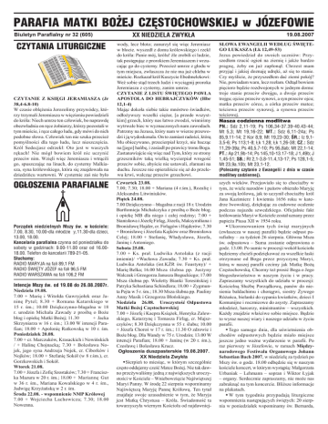 PARAFIA MATKI BOŻEJ CZÊSTOCHOWSKIEJ w JÓZEFOWIE Biuletyn Parafialny nr 32 (605) CZYTANIA LITURGICZNE CZYTANIE Z KSIĘGI JERAMIASZA (Jr 38,4-6.8-10) W czasie oblężenia Jerozolimy przywódcy, którzy trzymali Jeremiasza w więzieniu powiedzieli do króla: Niech umrze ten człowiek, bo naprawdę obezwładnia on ręce żołnierzy, którzy pozostali w tym mieście, i ręce całego ludu, gdy mówi do nich podobne słowa. Człowiek ten nie szuka przecież pomyślności dla tego ludu, lecz nieszczęścia. Król Sedecjasz odrzekł: Oto jest w waszych rękach! Nie mógł bowiem król nic uczynić przeciw nim. Wzięli więc Jeremiasza i wtrącili go, spuszczając na linach, do cysterny Malkiasza, syna królewskiego, która się znajdowała na dziedzińcu wartowni. W cysternie zaś nie było OG£OSZENIA PARAFIALNE Porz¹dek niedzielnych Mszy œw. w koœciele: 7.00, 8.30, 10.00-dla m³odzie¿y, 11.30-dla dzieci, 13.00, 18.00. Kancelaria parafialna czynna od poniedzia³ku do soboty w godzinach: 9.00-11.00 oraz od 16.0018.00. Telefon do kancelarii 789-21-05. S³uchamy: RADIO MARYJA na fali 89,1 FM RADIO ŒWIÊTY JÓZEF na fali 96,5 FM RADIO WARSZAWA na fali 106,2 FM Intencje Mszy œw. od 19.08 do 26.08.2007r. Niedziela 19.08. 7.00 + Marię i Witolda Gawryjołek oraz Janinę Pytel; 8.30 + Romana Katarskiego w 15 r. śm.; 10.00 Dziękczynno-błagalna w 18 r. urodzin Michała Zawady z prośbą o Boże błog i opiekę Matki Bożej; 11.30 + Jacka Skrzyniarza w 16 r. śm.; 13.00 W intencji Parafian; 18.00 + Apolonię Ratkowską w 10 r. śm. Poniedziałek 20.08. 7.00 + cr. Marczuków, Krasackich i Nowińskich / + Halinę Chojnacką; 7.30 + Bolesława Nojek, jego syna Andrzeja Nojek, cr. Ciborków i Nojków; 18.00 + Stefanię Sokół (w 8 r.śm.), cr. Gorzkowskich i Sokół. Wtorek 21.08. 7.00 + Józefa i Zofię Szostaków; 7.30 + Franciszka Mazura w 20 r. śm.; 18.00+ Mariannę Gut w 36 r. śm., Mariana Kowalskiego w 4 r. śm., Jadwigę Krzyżańską w 2 r. śm. Środa 22.08. - wspomnienie NMP Królowej 7.00 + Wojciecha Lachowicza; 7.30; 18.00 Nowenna. XX NIEDZIELA ZWYKŁA 19.08.2007 wody, lecz błoto; zanurzył się więc Jeremiasz w błocie. wyszedł z domu królewskiego i rzekł do króla: Panie mój, królu! źle zrobili ci ludzie, tak postępując z prorokiem Jeremiaszem i wrzucając go do cysterny. Przecież umrze z głodu w tym miejscu, zwłaszcza że nie ma już chleba w mieście. Rozkazał król Kuszycie Ebedmelekowi: Weź sobie stąd trzech ludzi i wyciągnij proroka Jeremiasza z cysterny, zanim umrze. CZYTANIE Z LISTU ŚWIĘTEGO PAWŁA APOSTOŁA DO HEBRAJCZYKÓW (Hbr 12,1-4) Mając dokoła siebie takie mnóstwo świadków, odłożywszy wszelki ciężar, [a przede wszystkim] grzech, który nas łatwo zwodzi, winniśmy wytrwale biec w wyznaczonych nam zawodach. Patrzmy na Jezusa, który nam w wierze przewodzi i ją wydoskonala. On to zamiast radości, którą Mu obiecywano, przecierpiał krzyż, nie bacząc na [jego] hańbę, i zasiadł po prawicy tronu Boga. Zastanawiajcie się więc nad Tym, który ze strony grzeszników taką wielką wycierpiał wrogość przeciw sobie, abyście nie ustawali, złamani na duchu. Jeszcze nie opieraliście się aż do przelewu krwi, walcząc przeciw grzechowi. SŁOWA EWANGELII WEDŁUG ŚWIĘTEGO ŁUKASZA (Łk 12,49-53) Jezus powiedział do swoich uczniów: Przyszedłem rzucić ogień na ziemię i jakże bardzo pragnę, żeby on już zapłonął. Chrzest mam przyjąć i jakiej doznaję udręki, aż się to stanie. Czy myślicie, że przyszedłem dać ziemi pokój? Nie, powiadam wam, lecz rozłam. Odtąd bowiem pięcioro będzie rozdwojonych w jednym domu: troje stanie przeciw dwojgu, a dwoje przeciw trojgu; ojciec przeciw synowi, a syn przeciw ojcu; matka przeciw córce, a córka przeciw matce; teściowa przeciw synowej, a synowa przeciw teściowej. Nasza codzienna modlitwa PN.: Sdz 2,11-19; Ps 106,34-37.39-40.43-44; Mt 5,3; Mt 19,16-22; WT.: Sdz 6,11-24a; Ps 85,9.11-14; 2 Kor 8,9; Mt 19,23-30; ŚR.: Iz 9,13,5-6; Ps 113;1-8; Łk 1,28; Łk 1,26-38; CZ.: Sdz 11,29-39a; Ps 40,5.7-10; Ps 95,8ab; Mt 22,1-14; PT.: Ap 21,9b-14; Ps 145,10-13.17-18; J 1,49b; J 1,45-51; SB.: Rt 2,1-3.8-11.4,13-17; Ps 128,1-5; Mt 23,9a.10b; Mt 23,1-12. Czwartek 23.08. 7.00; 7.30; 18.00 + Mariana (4 r.śm.), Rozalię i Aleksandra Litwiniuków. Piątek 24.08. 7.00 Dziękczynno – błagalna z racji 18 r. Urodzin Bartłomieja Michalczyka z prośbą o Boże błog. i opiekę MB dla niego i całej rodziny; 7.00 + Stanisława i Józefę Firląg, Józefa, Maksymiliana i Bronisławę Hajder, cr. Firlągów i Hajderów; 7.30 + Bronisławę i Józefata Kajków oraz Bronisława Celej; 18.00 + Stefanię, Władysława, Józefa, Janinę i Antoniego. Sobota 25.08. 7.00 + Ks. prał. Ludwika Antolaka (z racji imienin)/ +Wacława Zawada; 7.30 + Ks. prał. Ludwika Antolaka (int.KŻR św. Faustyny)/ + Marię Belka; 16.00Msza ślubna pp. Justyny Walczak i Grzegorza Janusza Boguckiego; 17.00 Msza ślubna pp. Wioletty Bianki Teresińskiej i Patryka Sebastiana Schindlera; 18.00 + Zygmunta Pejta w 5 r. śm.; 18.30 Msza ślubna pp. Pauliny Anny Masik i Grzegorza Błońskiego. Niedziela 26.08. Uroczystość Odpustowa Matki Bożej Częstochowskiej 7.00 + Józefę i Kacpra Książek, Henryka Zalewskiego, Katarzynę i Tomasza Firląg, cr. Majszczyków; 8.30 Dziękczynna w 55 r. ślubu; 10.00 + Józefa Choroś w 17 r. śm.; 11.30 O zdrowie i Boże błog. Dla Wandy w 75 r. Urodzin; 13.00 W intencji Parafian; 18.00 + Janinę (w 20 r. śm.), Czesławę i Bolesława Krucz. Ogłoszenia duszpasterskie 19.08.2007. XX Niedziela Zwykła wSierpień to miesiąc, w którym szczególnie często oddajemy cześć Matce Bożej. Nie tak dawno przeżywaliśmy jedną z największych uroczystości w Kościele – Wniebowzięcie Najświętszej Maryi Panny. W środę 22 sierpnia wspominamy Najświętszą Maryję Pannę Królową. Ten tytuł znajduje swoje uzasadnienie w tym, że Maryja jest Matką Chrystusa – Króla. Świadomość ta towarzy
