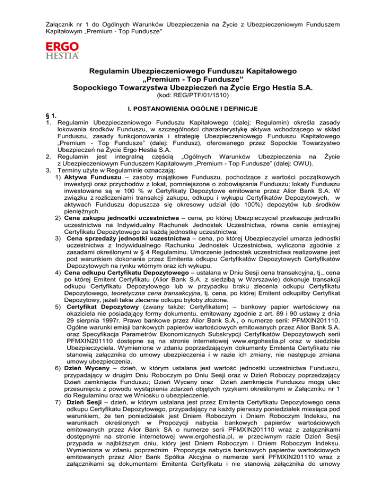 Załącznik nr 1 do Ogólnych Warunków Ubezpieczenia na Życie z Ubezpieczeniowym Funduszem Kapitałowym „Premium - Top Fundusze" Regulamin Ubezpieczeniowego Funduszu Kapitałowego „Premium - Top Fundusze” Sopockiego Towarzystwa Ubezpieczeń na Życie Ergo Hestia S.A. (kod: REG/PTF/01/1510) I. POSTANOWIENIA OGÓLNE I DEFINICJE § 1. 1. Regulamin Ubezpieczeniowego Funduszu Kapitałowego (dalej: Regulamin) określa zasady lokowania środków Funduszu, w szczególności charakterystykę aktywa wchodzącego w skład Funduszu, zasady funkcjonowania i strategię Ubezpieczeniowego Funduszu Kapitałowego „Premium - Top Fundusze” (dalej: Fundusz), oferowanego przez Sopockie Towarzystwo Ubezpieczeń na Życie Ergo Hestia S.A. 2. Regulamin jest integralną częścią „Ogólnych Warunków Ubezpieczenia na Życie z Ubezpieczeniowym Funduszem Kapitałowym „Premium - Top Fundusze” (dalej: OWU). 3. Terminy użyte w Regulaminie oznaczają: 1) Aktywa Funduszu – zasoby majątkowe Funduszu, pochodzące z wartości początkowych inwestycji oraz przychodów z lokat, pomniejszone o zobowiązania Funduszu; lokaty Funduszu inwestowane są w 100 % w Certyfikaty Depozytowe emitowane przez Alior Bank S.A. W związku z rozliczeniami transakcji zakupu, odkupu i wykupu Certyfikatów Depozytowych, w aktywach Funduszu dopuszcza się okresowy udział (do 100%) depozytów lub środków pieniężnych. 2) Cena zakupu jednostki uczestnictwa – cena, po której Ubezpieczyciel przekazuje jednostki uczestnictwa na Indywidualny Rachunek Jednostek Uczestnictwa, równa cenie emisyjnej Certyfikatu Depozytowego za każdą jednostkę uczestnictwa; 3) Cena sprzedaży jednostki uczestnictwa – cena, po której Ubezpieczyciel umarza jednostki uczestnictwa z Indywidualnego Rachunku Jednostek Uczestnictwa, wyliczona zgodnie z zasadami określonymi w § 4 Regulaminu. Umorzenie jednostek uczestnictwa realizowane jest pod warunkiem dokonania przez Emitenta odkupu Certyfikatów Depozytowych Certyfikatów Depozytowych na rynku wtórnym oraz ich wykupu. 4) Cena odkupu Certyfikatu Depozytowego – ustalana w Dniu Sesji cena transakcyjna, tj., cena po której Emitent Certyfikatu (Alior Bank S.A. z siedzibą w Warszawie) dokonuje transakcji odkupu Certyfikatu Depozytowego lub w przypadku braku zlecenia odkupu Certyfikatu Depozytowego, teoretyczna cena transakcyjna, tj. cena, po której Emitent odkupiłby Certyfikat Depozytowy, jeżeli takie zlecenie odkupu byłoby złożone. 5) Certyfikat Depozytowy (zwany także: Certyfikatem) – bankowy papier wartościowy na okaziciela nie posiadający formy dokumentu, emitowany zgodnie z art. 89 i 90 ustawy z dnia 29 sierpnia 1997r. Prawo bankowe przez Alior Bank S.A., o numerze serii: PFMXIN201110. Ogólne warunki emisji bankowych papierów wartościowych emitowanych przez Alior Bank S.A. oraz Specyfikacja Parametrów Ekonomicznych Subskrypcji Certyfikatów Depozytowych serii PFMXIN201110 dostępne są na stronie internetowej www.ergohestia.pl oraz w siedzibie Ubezpieczyciela. Wymienione w zdaniu poprzedzającym dokumenty Emitenta Certyfikatu nie stanowią załącznika do umowy ubezpieczenia i w razie ich zmiany, nie następuje zmiana umowy ubezpieczenia. 6) Dzień Wyceny – dzień, w którym ustalana jest wartość jednostki uczestnictwa Funduszu, przypadający w drugim Dniu Roboczym po Dniu Sesji oraz w Dzień Roboczy poprzedzający Dzień zamknięcia Funduszu; Dzień Wyceny oraz Dzień zamknięcia Funduszu mogą ulec przesunięciu z powodu wystąpienia zdarzeń objętych ryzykami określonymi w Załączniku nr 1 do Regulaminu oraz we Wniosku o ubezpieczenie. 7) Dzień Sesji – dzień, w którym ustalana jest przez Emitenta Certyfikatu Depozytowego cena odkupu Certyfikatu Depozytowego, przypadający na każdy pierwszy poniedziałek miesiąca pod warunkiem, że ten poniedziałek jest Dniem Roboczym i Dniem Roboczym Indeksu, na warunkach określonych w Propozycji nabycia bankowych papierów wartościowych emitowanych przez Alior Bank SA o numerze serii PFMXIN201110 wraz z załącznikami dostępnymi na stronie internetowej www.ergohestia.pl, w przeciwnym razie Dzień Sesji przypada w najbliższym dniu, który jest Dniem Roboczym i Dniem Roboczym Indeksu. Wymieniona w zdaniu poprzednim Propozycja nabycia bankowych papierów wartościowych emitowanych przez Alior Bank Spółka Akcyjna o numerze serii PFMXIN201110 wraz z załącznikami są dokumentami Emitenta Certyfikatu i nie stanowią załącznika do umowy Załącznik nr 1 do Ogólnych Warunków Ubezpieczenia na Życie z Ubezpieczeniowym Funduszem Kapitałowym „Premium - Top Fundusze" ubezpieczenia i w razie ich zmiany, nie następuje zmiana umowy ubezpieczenia. 8) Dzień Roboczy – oznacza każdy dzień inny niż sobota, niedziela lub dni ustawowo wolne od pracy, w którym Emitent i Biuro Maklerskie Emitenta, a także każda inna instytucja finansowa uczestnicząca w rozliczeniu, prowadzą działalność w sposób umożliwiający wykonanie czynności określonych w Ogólnych Warunkach Emisji oraz Specyfikacji Parametrów Ekonomicznych Subskrypcji. Ogólne warunki emisji bankowych papierów wartościowych emitowanych przez Alior Bank S.A. oraz Specyfikacja Parametrów Ekonomicznych Subskrypcji Certyfikatów Depozytowych serii PFMXIN201110 dostępne są na stronie internetowej www.ergohestia.pl oraz w siedzibie Ubezpieczyciela. Wymienione w zdaniu poprzedzającym dokumenty Emitenta Certyfikatu nie stanowią załącznika do umowy ubezpieczenia i w razie ich zmiany, nie następuje zmiana umowy ubezpieczenia. II. FUNDUSZ §2 1. Fundusz oferowany jest wyłącznie w ramach „Umowy Ubezpieczenia na Życie z Ubezpieczeniowym Funduszem Kapitałowym „Premium - Top Fundusze”. 2. Aktywa Funduszu inwestowane są w Certyfikaty Depozytowe. 3. Charakterystykę aktywa wchodzącego w skład Funduszu, cel inwestycyjny oraz zasady lokowania środków Funduszu określa Załącznik nr 1 do Regulaminu. 4. Umorzenie jednostek uczestnictwa możliwe jest