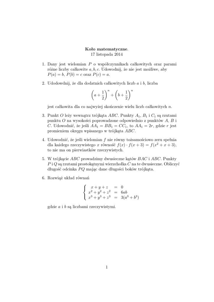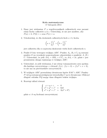 Koło matematyczne. 17 listopada 2014 1. Dany jest wielomian P o współczynnikach całkowitych oraz parami różne liczby całkowite a, b, c. Udowodnij, że nie jest możliwe, aby P (a) = b, P (b) = c oraz P (c) = a. 2. Udodowdnij, że dla dodatnich całkowitych liczb a i b, liczba n n 1 1 + b+ a+ 2 2 jest całkowita dla co najwyżej skończenie wielu liczb całkowitych n. 3. Punkt O leży wewnątrz trójkąta ABC. Punkty A1 , B1 i C1 są rzutami punktu O na wysokości poprowadzone odpowiednio z punktów A, B i C. Udowodnić, że jeśli AA1 = BB1 = CC1 , to AA1 = 2r, gdzie r jest promieniem okręgu wpisanego w trójkąta ABC. 4. Udowodnić, że jeśli wielomian f nie równy tożsamościowo zeru spełnia dla każdego rzeczywistego x równość f (x) · f (x + 3) = f (x2 + x + 3), to nie ma on pierwiastków rzeczywistych. 5. W trójkącie ABC prowadzimy dwusieczne kątów BAC i ABC. Punkty P i Q są rzutami prostokątnymi wierzchołka C na te dwusieczne. Obliczyć długość odcinka P Q mając dane długości boków trójkąta. 6. Rozwiąż układ równań x+y+z = 0 x2 + y 2 + z 2 = 6ab 3 x + y 3 + z 3 = 3(a3 + b3 ) gdzie a i b są liczbami rzeczywistymi. 1