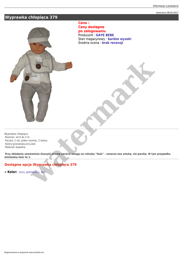 Informacje o produkcie Utworzono 08-03-2017 Wyprawka chłopięca 379 Cena : Ceny dostępne po zalogowaniu at Wyprawka chłopięca. Rozmiar: od 0 do 3 m. Paczka: 1 szt, jeden rozmiar, 2 kolory Kolory:granatowy,ecru,beż Materiał: bawełna. er m ar k Producent : GAYE BEBE Stan magazynowy : bardzo wysoki Średnia ocena : brak recenzji Przy składaniu zamówienia (koszyk) proszę zwrócić uwagę na rubrykę ''ilość'' - oznacza ona sztukę, nie paczkę. W tym przypadku minimalna ilość to 1. w Dostępne opcje Wyprawka chłopięca 379 » Kolor: ecru, granatowy, beż. Wygenerowano w programie www.oscGold.com