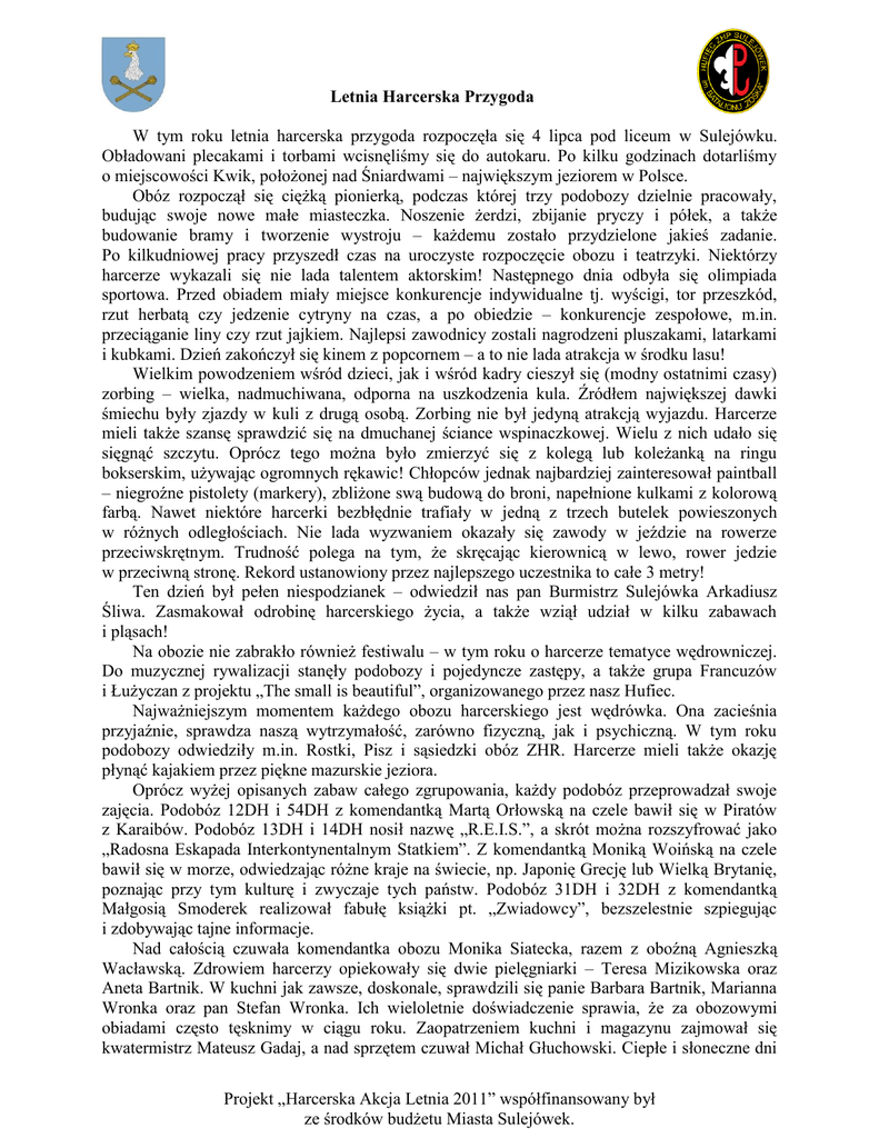Letnia Harcerska Przygoda W tym roku letnia harcerska przygoda rozpoczęła się 4 lipca pod liceum w Sulejówku. Obładowani plecakami i torbami wcisnęliśmy się do autokaru. Po kilku godzinach dotarliśmy o miejscowości Kwik, położonej nad Śniardwami – największym jeziorem w Polsce. Obóz rozpoczął się ciężką pionierką, podczas której trzy podobozy dzielnie pracowały, budując swoje nowe małe miasteczka. Noszenie żerdzi, zbijanie pryczy i półek, a także budowanie bramy i tworzenie wystroju – każdemu zostało przydzielone jakieś zadanie. Po kilkudniowej pracy przyszedł czas na uroczyste rozpoczęcie obozu i teatrzyki. Niektórzy harcerze wykazali się nie lada talentem aktorskim! Następnego dnia odbyła się olimpiada sportowa. Przed obiadem miały miejsce konkurencje indywidualne tj. wyścigi, tor przeszkód, rzut herbatą czy jedzenie cytryny na czas, a po obiedzie – konkurencje zespołowe, m.in. przeciąganie liny czy rzut jajkiem. Najlepsi zawodnicy zostali nagrodzeni pluszakami, latarkami i kubkami. Dzień zakończył się kinem z popcornem – a to nie lada atrakcja w środku lasu! Wielkim powodzeniem wśród dzieci, jak i wśród kadry cieszył się (modny ostatnimi czasy) zorbing – wielka, nadmuchiwana, odporna na uszkodzenia kula. Źródłem największej dawki śmiechu były zjazdy w kuli z drugą osobą. Zorbing nie był jedyną atrakcją wyjazdu. Harcerze mieli także szansę sprawdzić się na dmuchanej ściance wspinaczkowej. Wielu z nich udało się sięgnąć szczytu. Oprócz tego można było zmierzyć się z kolegą lub koleżanką na ringu bokserskim, używając ogromnych rękawic! Chłopców jednak najbardziej zainteresował paintball – niegroźne pistolety (markery), zbliżone swą budową do broni, napełnione kulkami z kolorową farbą. Nawet niektóre harcerki bezbłędnie trafiały w jedną z trzech butelek powieszonych w różnych odległościach. Nie lada wyzwaniem okazały się zawody w jeździe na rowerze przeciwskrętnym. Trudność polega na tym, że skręcając kierownicą w lewo, rower jedzie w przeciwną stronę. Rekord ustanowiony przez najlepszego uczestnika to całe 3 metry! Ten dzień był pełen niespodzianek – odwiedził nas pan Burmistrz Sulejówka Arkadiusz Śliwa. Zasmakował odrobinę harcerskiego życia, a także wziął udział w kilku zabawach i pląsach! Na obozie nie zabrakło również festiwalu – w tym roku o harcerze tematyce wędrowniczej. Do muzycznej rywalizacji stanęły podobozy i pojedyncze zastępy, a także grupa Francuzów i Łużyczan z projektu „The small is beautiful”, organizowanego przez nasz Hufiec. Najważniejszym momentem każdego obozu harcerskiego jest wędrówka. Ona zacieśnia przyjaźnie, sprawdza naszą wytrzymałość, zarówno fizyczną, jak i psychiczną. W tym roku podobozy odwiedziły m.in. Rostki, Pisz i sąsiedzki obóz ZHR. Harcerze mieli także okazję płynąć kajakiem przez piękne mazurskie jeziora. Oprócz wyżej opisanych zabaw całego zgrupowania, każdy podobóz przeprowadzał swoje zajęcia. Podobóz 12DH i 54DH z komendantką Martą Orłowską na czele bawił się w Piratów z Karaibów. Podobóz 13DH i 14DH nosił nazwę „R.E.I.S.”, a skrót można rozszyfrować jako „Radosna Eskapada Interkontynentalnym Statkiem”. Z komendantką Moniką Woińską na czele bawił się w morze, odwiedzając różne kraje na świecie, np. Japonię Grecję lub Wielką Brytanię, poznając przy tym kulturę i zwyczaje tych państw. Podobóz 31DH i 32DH z komendantką Małgosią Smoderek realizował fabułę książki pt. „Zwiadowcy”, bezszelestnie szpiegując i zdobywając tajne informacje. Nad całością czuwała komendantka obozu Monika Siatecka, razem z oboźną Agnieszką Wacławską. Zdrowiem harcerzy opiekowały się dwie pielęgniarki – Teresa Mizikowska oraz Aneta Bartnik. W kuchni jak zawsze, doskonale, sprawdzili się panie Barbara Bartnik, Marianna Wronka oraz pan Stefan Wronka. Ich wieloletnie doświadczenie sprawia, że za obozowymi obiadami często tęsknimy w ciągu roku. Zaopatrzeniem kuchni i magazynu zajmował się kwatermistrz Mateusz Gadaj, a nad sprzętem czuwał Michał Głuchowski. Ciepłe i słoneczne dni Projekt „Harcerska Akcja Letnia 2011” współfinansowany był ze środków budżetu Miasta Sulejówek. spędzone na kąpielisku nie obyłyby się bez zawsze uśmiechniętej pani ratownik – Aleksandry Kurbiel. Nadszedł koniec letniej harcerskiej przygody, ale na szczęście nie na długo. Razem z początkiem września rozpoczną się zbiórki i rajdy, na które już teraz serdecznie zapraszamy! Więcej zdjęć z Harcerskiej Akcji Letniej można obejrzeć na naszej stronie internetowej www.sulejowek.zhp.pl Agata Woińska, Małgorzata Foryś Odwiedziny Burmistrza Miasta Sulejówek Projekt „Harcerska Akcja Letnia 2011” współfinansowany był ze środków budżetu Miasta Sulejówek. Harcerze na tle samolotu do gaszenia pożarów Projekt „Harcerska Akcja Letnia 2011” współfinansowany był ze środków budżetu Miasta Sulejówek.