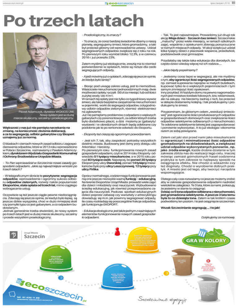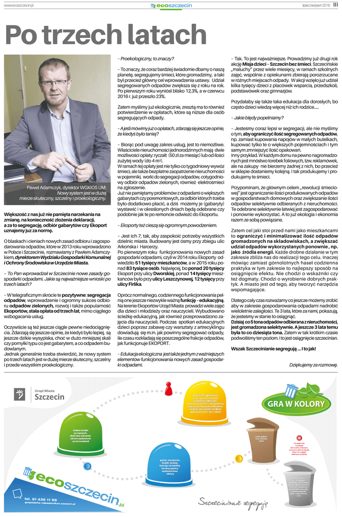 www.ecoszczecin.pl lipiec/sierpień 2016 III Po trzech latach – Proekologiczny, to znaczy? – To znaczy, że coraz bardziej świadomie dbamy o naszą planetę, segregujemy śmieci, które gromadzimy, a taki był przecież główny cel wprowadzenia ustawy. Udział segregowanych odpadów zwiększa się z roku na rok. Po pierwszym roku wyniósł blisko 12,3%, a w czerwcu 2016 r. już przeszło 23%. Zatem myślimy już ekologicznie, zresztą ma to również potwierdzenie w opłatach, które są niższe dla osób segregujących odpady. – A jeśli mówimy już o opłatach, zdarzają się jeszcze opinie, że kiedyś było taniej? Paweł Adamczyk, dyrektor WGKiOŚ UM: Nowy system jest w dużej mierze skuteczny, szczelny i proekologiczny. Większość z nas już nie pamięta narzekania na zmianę, na konieczność złożenia deklaracji, a za to segregację, odbiór gabarytów czy Ekoport uznajemy juz za normę. O blaskach i cieniach nowych zasad odbioru i zagospodarowania odpadów, które w 2013 roku wprowadzono w Polsce i Szczecinie, rozmawiamy z Pawłem Adamczykiem, dyrektorem Wydziału Gospodarki Komunalnej i Ochrony Środowiska w Urzędzie Miasta. – To Pan wprowadzał w Szczecinie nowe zasady gospodarki odpadami. Jakie są najważniejsze wnioski po trzech latach? – W telegraficznym skrócie te pozytywne: segregacja odpadów, wprowadzenie i ogromny sukces odbioru odpadów zielonych, rozwój i także popularność Ekoportów, stała opłata od trzech lat, mimo ciągłego wzbogacania usług. Oczywiście są też jeszcze ciągle pewne niedociągnięcia. Zdarzają się jeszcze opinie, że kiedyś było lepiej, są jeszcze dzikie wysypiska, choć w dużo mniejszej skali czy pomyłki typu co jest gabarytem, a co odpadem budowlanym. Jednak generalnie trzeba stwierdzić, że nowy system po trzech latach jest w dużej mierze skuteczny, szczelny i przede wszystkim proekologiczny. – Biorąc pod uwagę zakres usług, jest to niemożliwe. Właściciele nieruchomości jednorodzinnych mają dwie możliwości opłaty: ryczałt (50 zł za miesiąc) lub od ilości zużytej wody (do 4 m3). W ramach tej opłaty jest nie tylko co tygodniowy wywóz śmieci, ale także bezpłatne zaopatrzenie nieruchomości w pojemniki, worki do segregacji odpadów, cotygodniowy odbiór odpadów zielonych, również elektrośmieci na zgłoszenie. Już nie pamiętamy problemów z odpadami o większych gabarytach czy poremontowych, za odbiór których trzeba było dodatkowo płacić, a dziś możemy je (gabaryty) wystawić i w określonych dniach będą odebrane czy podobnie jak te po remoncie odwieźć do Ekoportu. – Tak. To jest najważniejsze. Prowadzimy już drugi rok akcję Misja dzieci – Szczecin bez śmieci. Szczecińskie „maluchy” przez wiele miesięcy, w ramach szkolnych zajęć, wspólnie z opiekunami zbierają porozrzucane w różnych miejscach odpady. W akcji wzięło już udział kilka tysięcy dzieci z placówek wsparcia, przedszkoli, podstawówek oraz gimnazjów. Przydałaby się także taka edukacja dla dorosłych, bo często dzieci wiedzą więcej niż ich rodzice….. – Jakie błędy popełniamy? – Jesteśmy coraz lepsi w segregacji, ale nie myślimy o tym, aby ograniczyć ilość segregowanych odpadów, np. zamiast kupowania napojów w małych butelkach, kupować tylko te o większych pojemnościach i tym samym zmniejszyć ilość opakowań. Inny przykład. W każdym domu na pewno nagromadzonych jest mnóstwo torebek foliowych, tzw. reklamówek, ale na zakupy nie bierzemy żadnej z nich, bo przecież w sklepie dostaniemy kolejną. I tak produkujemy i produkujemy te śmieci. Przypominam, że głównym celem „rewolucji śmieciowej” jest ograniczanie ilości produkowanych odpadów w gospodarstwach domowych oraz zwiększanie ilości odpadów selektywnie odbieranych z nieruchomości. Te odebrane selektywnie łatwiej jest zagospodarować i ponownie wykorzystać. A to już ekologia i ekonomia razem ze sobą powiązane. – Ekoporty też cieszą się ogromnym powodzeniem. – Jest ich 7, tak, aby zaspokoić potrzeby wszystkich dzielnic miasta. Budowany jest ósmy przy zbiegu ulic Arkońska i Harcerzy. Po pierwszym roku funkcjonowania nowych zasad gospodarki odpadami, czyli w 2014 roku Ekoporty odwiedziło 51 tysięcy mieszkańców, a w 2015 roku ponad 83 tysiące osób. Najwięcej, bo ponad 20 tysięcy Ekoport przy ulicy Dworskiej, ponad 14 tysięcy mieszkańców było przy ulicy Leszczynowej, 12 tysięcy przy ulicy Firlika. Zatem cel jaki stoi przed nami jako mieszkańcami to ograniczyć i minimalizować ilość odpadów gromadzonych na składowiskach, a zwiększać udział odpadów wykorzystanych ponownie , np. jako źródła energii. Każde drobne działanie w tym zakresie zbliża nas do realizacji tego celu. Inaczej mówiąc zamiast górnolotnych haseł codzienna praktyka w tym zakresie to najlepszy sposób na osiągnięcie efektu. Nie chodzi o wskaźniki czy też dogmaty. Chodzi o wyrobienie dobrych praktyk. A miasto jest od tego, aby tworzyć narzędzia wspomagające. Oprócz normalnego, codziennego funkcjonowania pełnią one jeszcze niezwykle ważną funkcję – edukacyjną. Na terenie Ekoportów Urząd Miasta prowadzi wiele zajęć dla dzieci i młodzieży oraz nauczycieli. Wybudowano ścieżkę edukacyjną, jak również przeprowadzono zajęcia dla nauczycieli. Podczas spotkań edukacyjnych dzieci poprzez zabawę czy warsztaty z artrecyklingu dowiadują się m.in. jak powinny segregować odpady, ile czasu rozkładają się poszczególne frakcje odpadów, jak funkcjonuje EKOPORT. Dlatego cały czas rozważamy co jeszcze możemy zrobić aby w zakresie gospodarowania odpadami nadrobić wieloletnie zaległości. Te 3 lata, które za nami, pokazują, że jesteśmy w stanie to osiągnąć. Dzisiaj co 5 tona odpadów odbierana z nieruchomości, jest gromadzona selektywnie. A jeszcze 3 lata temu była to co dziesiąta tona. Zatem w tak krótkim czasie podwoiliśmy ten poziom. I to jest osiągni