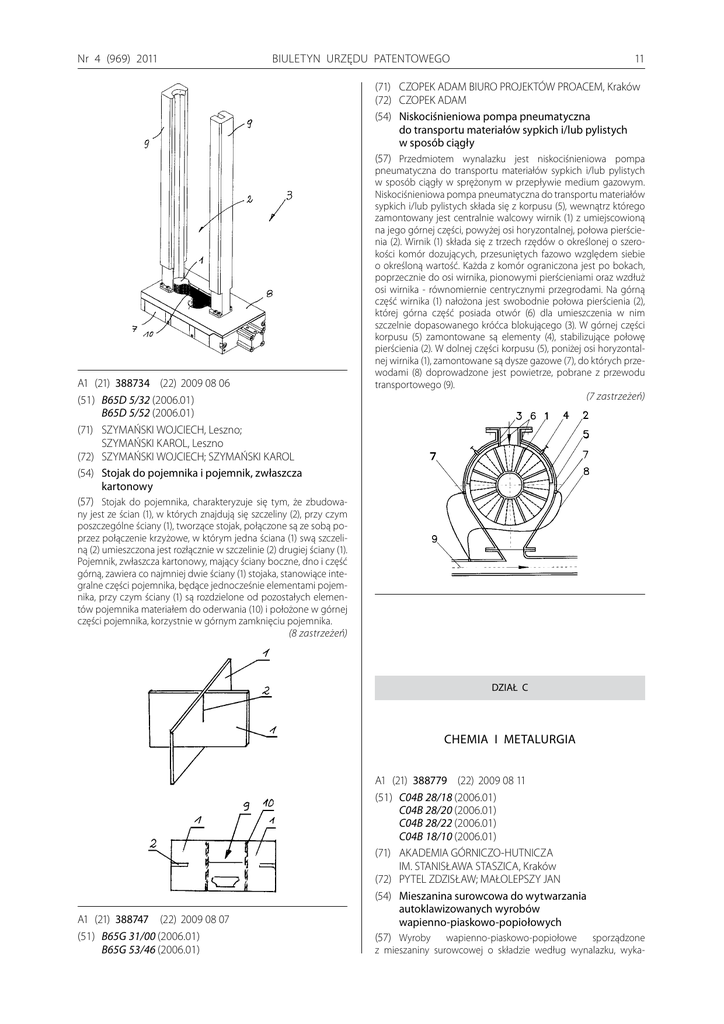 Nr 4 (969) 2011 BIULETYN URZĘDU PATENTOWEGO 11 (71) CZOPEK ADAM BIURO PROJEKTÓW PROACEM, Kraków (72) CZOPEK ADAM (54) Niskociśnieniowa pompa pneumatyczna do transportu materiałów sypkich i/lub pylistych w sposób ciągły (57) Przedmiotem wynalazku jest niskociśnieniowa pompa A1 (21) 388734 (22) 2009 08 06 (51) B65D 5/32 (2006.01) B65D 5/52 (2006.01) (71) SZYMAŃSKI WOJCIECH, Leszno; SZYMAŃSKI KAROL, Leszno (72) SZYMAŃSKI WOJCIECH; SZYMAŃSKI KAROL (54) Stojak do pojemnika i pojemnik, zwłaszcza kartonowy (57) Stojak do pojemnika, charakteryzuje się tym, że zbudowa- pneumatyczna do transportu materiałów sypkich i/lub pylistych w sposób ciągły w sprężonym w przepływie medium gazowym. Niskociśnieniowa pompa pneumatyczna do transportu materiałów sypkich i/lub pylistych składa się z korpusu (5), wewnątrz którego zamontowany jest centralnie walcowy wirnik (1) z umiejscowioną na jego górnej części, powyżej osi horyzontalnej, połowa pierścienia (2). Wirnik (1) składa się z trzech rzędów o określonej o szerokości komór dozujących, przesuniętych fazowo względem siebie o określoną wartość. Każda z komór ograniczona jest po bokach, poprzecznie do osi wirnika, pionowymi pierścieniami oraz wzdłuż osi wirnika - równomiernie centrycznymi przegrodami. Na górną część wirnika (1) nałożona jest swobodnie połowa pierścienia (2), której górna część posiada otwór (6) dla umieszczenia w nim szczelnie dopasowanego króćca blokującego (3). W górnej części korpusu (5) zamontowane są elementy (4), stabilizujące połowę pierścienia (2). W dolnej części korpusu (5), poniżej osi horyzontalnej wirnika (1), zamontowane są dysze gazowe (7), do których przewodami (8) doprowadzone jest powietrze, pobrane z przewodu transportowego (9). (7 zastrzeżeń) ny jest ze ścian (1), w których znajdują się szczeliny (2), przy czym poszczególne ściany (1), tworzące stojak, połączone są ze sobą poprzez połączenie krzyżowe, w którym jedna ściana (1) swą szczeliną (2) umieszczona jest rozłącznie w szczelinie (2) drugiej ściany (1). Pojemnik, zwłaszcza kartonowy, mający ściany boczne, dno i część górną, zawiera co najmniej dwie ściany (1) stojaka, stanowiące integralne części pojemnika, będące jednocześnie elementami pojemnika, przy czym ściany (1) są rozdzielone od pozostałych elementów pojemnika materiałem do oderwania (10) i położone w górnej części pojemnika, korzystnie w górnym zamknięciu pojemnika. (8 zastrzeżeń) DZIAŁ C CHEMIA I METALURGIA A1 (21) 388747 (22) 2009 08 07 (51) B65G 31/00 (2006.01) B65G 53/46 (2006.01) A1 (21) 388779 (22) 2009 08 11 (51) C04B 28/18 (2006.01) C04B 28/20 (2006.01) C04B 28/22 (2006.01) C04B 18/10 (2006.01) (71) AKADEMIA GÓRNICZO-HUTNICZA IM. STANISŁAWA STASZICA, Kraków (72) PYTEL ZDZISŁAW; MAŁOLEPSZY JAN (54) Mieszanina surowcowa do wytwarzania autoklawizowanych wyrobów wapienno-piaskowo-popiołowych (57) Wyroby wapienno-piaskowo-popiołowe sporządzone z mieszaniny surowcowej o składzie według wynalazku, wyka- 12 BIULETYN URZĘDU PATENTOWEGO zują wytrzymałość na ściskanie co najmniej o 45% wyższą w stosunku do wyrobów tradycyjnych. Mieszanina składa się z piasku kwarcowego w ilości 61,5 - 20,5% wagowych, wapna palonego w ilości 5,5 - 8,0% wagowych oraz z dodatku mineralnego w postaci mielonych popiołów dennych w ilości 20,5 - 61,5% wagowych, stanowiących odpad powstający przy spalaniu paliw stałych, korzystnie z węgla kamiennego, w kotłach fluidalnych. (1 zastrzeżenie) A1 (21) 388719 (22) 2009 08 04 (51) C04B 28/20 (2006.01) C04B 28/22 (2006.01) C04B 28/18 (2006.01) (71) POLITECHNIKA WARSZAWSKA, Warszawa (72) CZARNECKI LECH; GARBACZ ANDRZEJ; ŁUKOWSKI PAWEŁ; PIOTROWSKI TOMASZ (54) Spoiwo cementowo-wapienne (57) Spoiwo cementowo-wapienne zawierające wapno hydratyzowane oraz cement charakteryzuje się tym, że zawiera wapno hydratyzowane, cement oraz dwuskładnikowy układ modyfikujący złożony z mikrokrzemionki, korzystnie pyłu krzemionkowego, oraz mączki wapiennej, a także może zawierać domieszkę upłynniającą oraz dodatek szkła wodnego. (3 zastrzeżenia) A1 (21) 388764 (22) 2009 08 10 (51) C04B 28/26 (2006.01) C04B 14/04 (2006.01) C04B 14/08 (2006.01) (71) INSTYTUT NISKICH TEMPERATUR I BADAŃ STRUKTURALNYCH PAN IM. WŁODZIMIERZA TRZEBIATOWSKIEGO, Wrocław (72) STRĘK WIESŁAW; PSUJA PIOTR; HRENIAK DARIUSZ (54) Sposób wytwarzania materiałów termoizolacyjnych z wykorzystaniem pyłów mineralnych i poprzemysłowych surowców odpadowych w postaci pylistej (57) Sposób wytwarzania materiałów termoizolacyjnych charakteryzuje się tym, że użytymi materiałami są wodne roztwory szkliste krzemianów sodowych (wodnego szkła) i krzemionki płomieniowe korzystnie AEROSIL, T-30, a także odpady poprzemysłowe w postaci pylistej korzystnie SILIMIC oraz pyły mineralne korzystnie DIATOMIT, zmieszane w określonych proporcjach dla otrzymania gęstego zolu, wysuszone, rozdrobnione i wygrzewane w temperaturze od 250 do 600°C. (3 zastrzeżenia) A1 (21) 388691 (22) 2009 07 31 (51) C04B 103/63 (2006.01) C09K 21/02 (2006.01) C09K 21/00 (2006.01) (71) SŁAWIŃSKI JERZY, Warszawa; STAŃCZYK JANUSZ, Warszawa (72) SŁAWIŃSKI JERZY; STAŃCZYK JANUSZ (54) Masa ognioochronna do zabezpieczania przed ogniem konstrukcji budowlanych oraz sposób wykonywania izolacji przy jej użyciu (57) Masa ogniochronna do zabezpieczania przed ogniem konstrukcji budowlanych metodą natryskową charakteryzuje się tym, że składa się z 5-15% części wagowych mączki kaolinowej o gęstości nasypowej od 250 do 350 kg/m3 zawierającej SiO2 50-55% i AL2O3 32-36%, rozdrobnionej wełny mineralnej - skalnej w ilości od 26 do 40% wagowych, cementu portlandzkiego w ilości 8-15% wagowych i wody w ilości 30-60% wagowych. Podczas izolowania konstrukcji masą ogniochronną rozdrobniona wełna mineralna Nr 4 (969) 2011 tłoczona jest do końcówki natryskowej przy pomocy sp