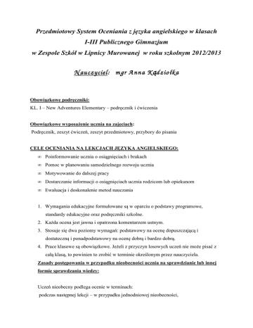 Przedmiotowy System Oceniania z języka angielskiego w klasach I-III Publicznego Gimnazjum w Zespole Szkół w Lipnicy Murowanej w roku szkolnym 2012/2013 N auczyciel: auczyciel : m gr A nna K ądziołka Obowiązkowe podręczniki: KL. I – New Adventures Elementary – podręcznik i ćwiczenia Obowiązkowe wyposażenie ucznia na zajęciach: Podręcznik, zeszyt ćwiczeń, zeszyt przedmiotowy, przybory do pisania CELE OCENIANIA NA LEKCJACH JĘZYKA ANGIELSKIEGO: • Poinformowanie ucznia o osiągnięciach i brakach • Pomoc w planowaniu samodzielnego rozwoju ucznia • Motywowanie do dalszej pracy • Dostarczanie informacji o osiągnięciach ucznia rodzicom lub opiekunom • Ewaluacja i doskonalenie metod nauczania 1. Wymagania edukacyjne formułowane są w oparciu o podstawy programowe, standardy edukacyjne oraz podręczniki szkolne. 2. Każda ocena jest jawna i opatrzona komentarzem ustnym. 3. Stosuje się dwa poziomy wymagań: podstawowy na ocenę dopuszczającą i dostateczną i ponadpodstawowy na ocenę dobrą i bardzo dobrą. 4. Prace klasowe są obowiązkowe. Jeżeli z przyczyn losowych uczeń nie może pisać z całą klasą, to powinien to zrobić w terminie określonym przez nauczyciela. Zasady postępowania w przypadku nieobecności ucznia na sprawdzianie lub innej formie sprawdzania wiedzy: Uczeń nieobecny podlega ocenie w terminach: podczas następnej lekcji – w przypadku jednodniowej nieobecności, do 7 dni po powrocie – w przypadku nieobecności nie przekraczającej tygodnia, do 14 dni po powrocie w przypadku dłuższych nieobecności. W przypadku nieusprawiedliwionej nieobecności w umówionym terminie uczeń otrzymuje ocenę niedostateczną. 5. Nauczyciel informuje ucznia o ilości sprawdzianów pisemnych w semestrze, zakresie materiału, przykładowych zadaniach i poleceniach. Każda praca powinna być poprawiona przez nauczyciela do dwóch tygodni i omówiona na lekcji. 6. Nauczyciel dokonuje podsumowania i analizy popełnionych błędów, stwarzając uczniom możliwość poprawy. Wszystkie prace gromadzone są w teczce przez nauczyciela i przechowywane przez nauczyciela, skąd mogą być udostępniane do kontroli przez rodziców. 7. Uczeń zobowiązany jest do systematycznego prowadzenia zeszytu przedmiotowego i zeszytu ćwiczeń oraz przynoszenia podręczników. 8. Dwa razy w semestrze uczeń może zgłosić nieprzygotowanie do lekcji bez żadnych sankcji. Nie dotyczy to wcześniej zapowiedzianych przez nauczyciela prac klasowych, kartkówek itp. 9. Na ocenę końcową składają się oceny cząstkowe za: aktywność, wypowiedzi ustne, prace pisemne, sprawdziany klasowe, czytanie, mówienie, zadania praktyczne. 10. Poniższe kryteria procentowe dotyczą prac pisemnych, sprawdzianów i kartkówek: 90-100% bardzo dobry 75-89% dobry 51-74% dostateczny 34-50% dopuszczający 33% i niżej- niedostateczny Obszary oceniania: Ocenianiu podlegają: Wiadomości Umiejętności, Stosunek do przedmiotu, Kompletność materiałów, Aktywność Sposoby sprawdzania wiedzy i umiejętności uczniów: Obowiązuje skala ocen od 1 do 6. Uczeń otrzymuje oceny za: Sprawdziany lub testy – po zakończeniu każdego modułu Kartkówki – z trzech ostatnich lekcji lub wyznaczonej partii materiału Odpowiedzi ustne - z trzech ostatnich lekcji lub wyznaczonej partii materiału Zadania domowe obowiązkowe Zadania domowe nadobowiązkowe dla chętnych Zeszyt przedmiotowy Zeszyt ćwiczeń Aktywność na zajęciach – system znaków + / - ( 5 znaków + to ocena bdb, 3 znaki – to ndst) Kryteria oceniania z języków obcych: A. STOPIEŃ CELUJĄCY OTRZYMUJE UCZEŃ, KTÓRY: • Posiadł wiedzę i umiejętności znacznie wykraczające poza program nauczania • Samodzielnie i twórczo rozwija własne uzdolnienia • Biegle posługuje się zdobytymi wiadomościami w rozwiązywaniu problemów teoretycznych lub praktycznych z programu nauczania danej klasy, proponuje rozwiązania nietypowe, rozwiązuje także zadania wykraczające poza program nauczania danej klasy. • Osiąga sukcesy w konkursach i olimpiadach przedmiotowych o zasięgu przynajmniej międzyszkolnym. B. STOPIEŃ BARDZO DOBRY OTRZYMUJE UCZEŃ, KTÓRY: • Posiada pełen zasób wiadomości i umiejętności przewidzianych programem nauczania • Sprawnie posługuje się zdobytymi wiadomościami, rozwiązuje samodzielnie problemy teoretyczne i praktyczne, potrafi zastosować posiadaną wiedzę do rozwiązywania zadań i problemów w nowych sytuacjach. • Potrafi samodzielnie przygotować projekt • Aktywnie uczestniczy w lekcji C. STOPIEŃ DOBRY OTRZYMUJE UCZEŃ, KTÓRY: • Posiada wiadomości i umiejętności średnio trudne do opanowania, użyteczne nie tylko w życiu codziennym, umożliwiające kontynuowanie nauki powyżej szczebla szkoły podstawowej. • Zna i rozumie materiał nauczania, a opanowane umiejętności stosuje w innych typowych sytuacjach. • Samodzielnie rozwiązuje typowe zadania teoretyczne lub praktyczne • Aktywnie uczestniczy w lekcji • Korzysta z podstawowych źródeł informacji (biblioteka, media) D. STOPIEŃ DOSTATECZNY OTRZYMUJE UCZEŃ, KTÓRY: • Posiada taki zasób wiadomości i umiejętności, które są stosunkowo łatwe do opanowania, użyteczne w życiu codziennym i absolutnie konieczne do dalszej nauki • Zna podstawową terminologię z danego przedmiotu nauczania, rozumie ją, nauczane treści tłumaczy „własnymi słowami”. • Rozwiązuje typowe zadania teoretyczne lub praktyczne o średnim stopniu trudności • Potrafi korzystać z biblioteki szkolnej i podstawowych słowników E. STOPIEŃ DOPUSZCZAJĄCY OTRZYMUJE UCZEŃ, KTÓRY: • Posiada taki zasób najprostszych (elementarnych) wiadomości i umiejętności, które umożliwiają mu świadome korzystanie z lekcji oraz dają szansę na osiągnięcie wyższych wymagań • Zna podstawową terminologię z danego zakresu tematycznego • Rozwiązuje zadania teoretyczne i praktyczne typowe, o niewielkim stopniu trudności. F. STOPIEŃ