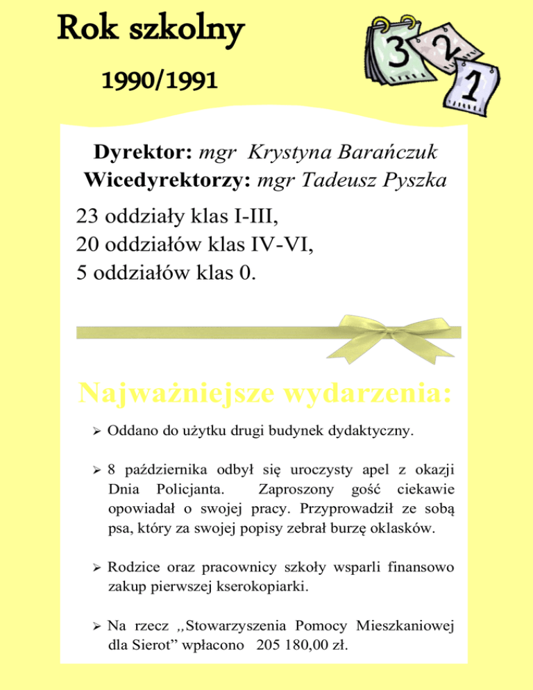 Rok szkolny 1990/1991 Dyrektor: mgr Krystyna Barańczuk Wicedyrektorzy: mgr Tadeusz Pyszka 23 oddziały klas I-III, 20 oddziałów klas IV-VI, 5 oddziałów klas 0. Najważniejsze wydarzenia: Oddano do użytku drugi budynek dydaktyczny. 8 października odbył się uroczysty apel z okazji Dnia Policjanta. Zaproszony gość ciekawie opowiadał o swojej pracy. Przyprowadził ze sobą psa, który za swojej popisy zebrał burzę oklasków. Rodzice oraz pracownicy szkoły wsparli finansowo zakup pierwszej kserokopiarki. Na rzecz ,,Stowarzyszenia Pomocy Mieszkaniowej dla Sierot” wpłacono 205 180,00 zł.