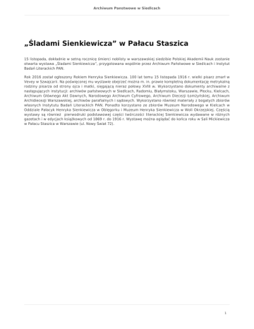Archiwum Panstwowe w Siedlcach „Śladami Sienkiewicza” w Pałacu Staszica 15 listopada, dokładnie w setną rocznicę śmierci noblisty w warszawskiej siedzibie Polskiej Akademii Nauk zostanie otwarta wystawa „Śladami Sienkiewicza”, przygotowana wspólnie przez Archiwum Państwowe w Siedlcach i Instytut Badań Literackich PAN. Rok 2016 został ogłoszony Rokiem Henryka Sienkiewicza. 100 lat temu 15 listopada 1916 r. wielki pisarz zmarł w Vevey w Szwajcarii. Na poświęconej mu wystawie obejrzeć można m. in. prawie kompletną dokumentację metrykalną rodziny pisarza od strony ojca i matki, sięgającą nieraz połowy XVIII w. Wykorzystano dokumenty archiwalne z następujących instytucji: archiwów państwowych w Siedlcach, Radomiu, Białymstoku, Warszawie, Płocku, Kielcach, Archiwum Głównego Akt Dawnych, Narodowego Archiwum Cyfrowego, Archiwum Diecezji Łomżyńskiej, Archiwum Archidiecezji Warszawskiej, archiwów parafialnych i sądowych. Wykorzystano również materiały z bogatych zbiorów własnych Instytutu Badań Literackich PAN. Ponadto korzystano ze zbiorów Muzeum Narodowego w Kielcach w Oddziale Pałacyk Henryka Sienkiewicza w Oblęgorku i Muzeum Henryka Sienkiewicza w Woli Okrzejskiej. Częścią wystawy są również pierwodruki podstawowej części twórczości literackiej Sienkiewicza wydawane w różnych gazetach i w edycjach książkowych od 1869 r. do 1916 r. Wystawę można oglądać do końca roku w Sali Mickiewicza w Pałacu Staszica w Warszawie (ul. Nowy Świat 72). 1 Archiwum Panstwowe w Siedlcach 2 Archiwum Panstwowe w Siedlcach 3
