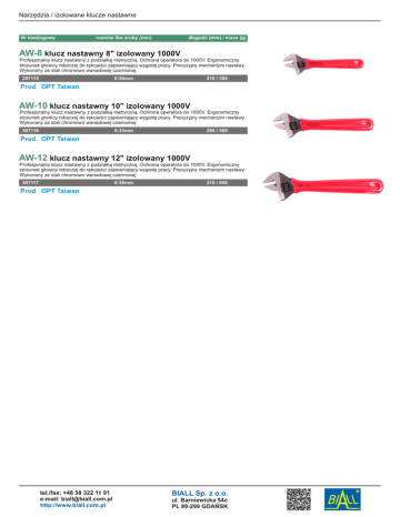Narzędzia / izolowane klucze nastawne Nr katalogowy rozmiar łba śruby (mm) długość (mm) / masa (g) AW-8 klucz nastawny 8" izolowany 1000V Profesjonalny klucz nastawny z podziałką metryczną. Ochrona operatora do 1000V. Ergonomiczny stosunek głowicy roboczej do rękojeści zapewniający wygodę pracy. Precyzyjny mechanizm nastawy. Wykonany ze stali chromowo wanadowej czernionej. 307115 0-30mm 210 / 300 Prod. OPT Taiwan AW-10 klucz nastawny 10" izolowany 1000V Profesjonalny klucz nastawny z podziałką metryczną. Ochrona operatora do 1000V. Ergonomiczny stosunek głowicy roboczej do rękojeści zapewniający wygodę pracy. Precyzyjny mechanizm nastawy. Wykonany ze stali chromowo wanadowej czernionej. 307116 0-33mm 260 / 560 Prod. OPT Taiwan AW-12 klucz nastawny 12" izolowany 1000V Profesjonalny klucz nastawny z podziałką metryczną. Ochrona operatora do 1000V. Ergonomiczny stosunek głowicy roboczej do rękojeści zapewniający wygodę pracy. Precyzyjny mechanizm nastawy. Wykonany ze stali chromowo wanadowej czernionej. 0-38mm 307117 310 / 850 Prod. OPT Taiwan tel./fax: +48 58 322 11 91 e-mail: [email protected] http://www.biall.com.pl BIALL Sp. z o.o. ul. Barniewicka 54c PL 80-299 GDAŃSK