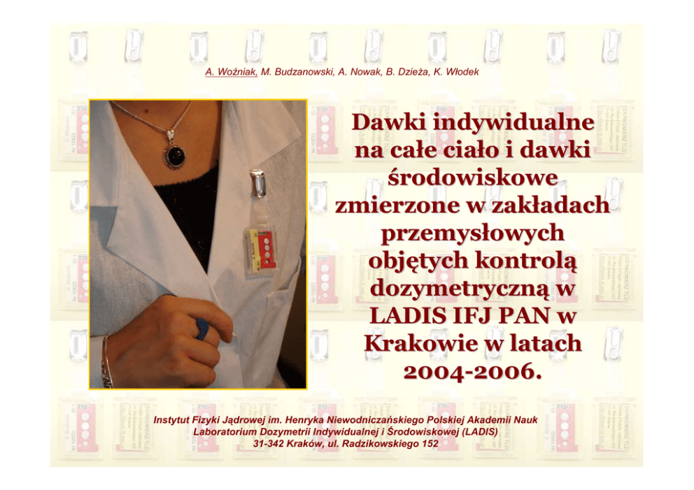 A. Woźniak, M. Budzanowski, A. Nowak, B. DzieŜa, K. Włodek Dawki indywidualne na całe ciało i dawki środowiskowe zmierzone w zakładach przemysłowych objętych kontrolą dozymetryczną w LADIS IFJ PAN w Krakowie w latach 2004-2006. Instytut Fizyki Jądrowej im. Henryka Niewodniczańskiego Polskiej Akademii Nauk Laboratorium Dozymetrii Indywidualnej i Środowiskowej (LADIS) 31-342 Kraków, ul. Radzikowskiego 152 LADIS IFJ PAN • 2001 – utworzenie Laboratorium Dozymetrii Indywidualnej i Środowiskowej (LADIS) • grudzień 2002 r. – uzyskanie akredytacji PCA (AP-049) • 2003 r. – pierwszy automatyczny czytnik DOSACUS RADOS • styczeń 2006 r. – drugi automatyczny czytnik DOSACUS RADOS • wrzesień 2006 r. – trzeci automatyczny czytnik DOSACUS RADOS Zespó Zespół LADIS Lokalizacja LADIS DOZYMETRIA TERMOLUMINESCENCYJNA (TLD) Metoda dozymetrii termoluminescencyjnej (TLD) opiera się na pomiarze ilości światła emitowanego przez podgrzany detektor TL proporcjonalnego do dawki otrzymanej od promieniowania (rtg, gamma, beta, alfa czy neutronów). Zjawisko termoluminescencji znane jest juŜ od XVII w. (Robert Boyle opisał świecenie diamentu), pierwszy raz zostało wykorzystane w dozymetrii promieniowania jonizującego podczas testów jądrowych w 1950r. W Polsce metoda to wykorzystywana jest do rutynowych pomiarów dozymetrycznych od lat 60-tych XX w. (IFJ PAN, prof. Tadeusz Niewiadomski, detektory TL na bazie LiF:Cu,Ag i CaF2:Mn). Świecenie detektora TL z LiF:Mg, Ti w czytniku TL. Detektory TL ZALETY METODY TLD • • • • • szeroki zakres dawek od 30 µSv do kilku Sv niskie koszty usługi moŜliwość wielokrotnego uŜycia detektorów szybkość odczytu duŜa dokładność pomiaru (niepewność pomiarowa w granicach kilku procent) • zakres mierzonych energii fotonów 15 keV - 3,0 MeV • moŜliwość sterylizacji dawkomierzy PI-01 metodami chemicznymi • odczyty w cyklu 1-, 2- miesięcznym lub kwartalnym RODZAJE DAWKOMIERZY TLD Dawkomierze indywidualne na całe ciało DI-02 i na dłonie PI-01 W kontroli dawek indywidualnych wyznacza się tzw. indywidualny równowaŜnik dawki na głębokości „d”, który przybliŜa rzeczywiste dawki na narządy: •dla promieniowania bardziej przenikliwego d=10mm Hp(10) indywidualny równowaŜnik dawki głębokiej [mSv] •dla promieniowania mniej przenikliwego d=0,07mm Hp(0,07) indywidualny równowaŜnik dawki na skórę [mSv] Pomiar: Hp(10), Hp(0,07) Zakres dawek: 0,1 mSv - 1 Sv Zakres energetyczny: 15keV – 3,0 MeV Okres pomiaru: od 1 do 3 miesięcy • W dawkomierzach indywidualnych na całe ciało lub dłonie stosuje się detektory typu MTS-N (LiF:MgTi). RODZAJE DAWKOMIERZY TLD Dawkomierze ALBEDO Stosujemy dawkomierze typu ALBEDO z parą detektorów MTS-6 i MTS-7. Pomiar: Zakres dawek: Okres pomiaru: Hp(10), Hp(0,07) 0,1 mSv - 1 Sv od 1 do 3 miesięcy Dawkomierze środowiskowe DS-04 • Wielkości stosowane w dozymetrii środowiskowej: - kerma w powietrzu Ka [mGy], - przestrzenny równowaŜnik dawki H*(10) [mSv] Pomiar: Zakres dawek: Kair, H*(10) 0,03 mGy- 1 Gy 0,03 mSv - 1 Sv Zakres energetyczny: 15keV – 3,0 MeV Okres pomiaru: od 1 do 3 miesięcy •Do kontroli dawek w środowisku uŜywane są wysokoczułe detektory MCP-N (LiF:Mg,Cu,P). APARATURA Automatyczny czytnik DOSACUS RADOS RE-1 Automatyczny czytnik DOSACUS RADOS RE-2000 Laboratoryjny czytnik TLD RA-94 (Microlab) Wyniki pomiarów dawek – zakłady przemysłowe Dawkomierze środowiskowe Dawkomierze na całe ciało: – Dawkomierze na całe ciało - ogół – Dawkomierze indywidualne albedo – Dawkomierze indywidualne DI-02 Maksymalne zmierzone dawki Dawki na całe ciało: przemysł a medycyna Zakłady przemysłowe – dawki środowiskowe procent liczby pomiarów Dawkomierze środowiskowe - DS-04 70 60 50 40 30 20 10 0 65,63 31,96 poniŜej 0,2 od =0,2 do 1 1,52 0,89 od =1 do 5 =5 i powyŜej kerma [mGy/kwartał] Zakłady przemysłowe – dawki na całe ciało procent liczby pomiarów Dawkomierze indywidualne na całe ciało (DI-02 + Albedo) 70 60 50 40 30 20 10 0 66,60 21,77 8,56 poniŜej 0,1 od =0,1 do 0,25 2,71 od =0,25 do od =1 do 5 1 dawka [mSv/kwartał] 0,36 =5 i powyŜej Zakłady przemysłowe – dawki na całe ciało 70 60 50 40 30 20 10 0 61,91 35,03 poniŜej 0,1 od =0,1 do 0,25 2,17 0,90 0,00 od =0,25 do 1 od =1 do 5 =5 i powyŜej dawka [mSv/kwartał] Dawkomierze indywidualne na całe ciało - DI-02 procent liczby pomiarów procent liczby pomiarów Dawkomierze indywidualne na całe ciało - Albedo 80 70 60 50 40 30 20 10 0 67,49 19,27 9,76 poniŜej 0,1 od =0,1 do 0,25 od =0,25 do 1 3,05 0,42 od =1 do 5 =5 i powyŜej dawka [mSv/kwartał] DAWKI MAKSYMALNE Dawkomierze indywidualne na całe ciało (DI-02) najwyŜsze zmierzone dawki dawka [mSv/kwartał] 400 342,40 350 300 248,39 250 200 150 100 50 0 108,80 20,70 38,10 40,80 45,40 74,48 Dawki indywidualne – przemysł a medycyna 80 70 60 50 40 30 20 10 0 Zakłady przemysłowe 67,49 19,27 9,76 poniŜej 0,1 od =0,1 do 0,25 od =0,25 do 1 3,05 0,42 od =1 do 5 =5 i powyŜej dawka [mSv/kwartał] Placówki medyczne (ogół) - dawkomierze indywidualne i pierścionkowe Placówki medyczne % liczby odczytów procent liczby pomiarów Dawkomierze indywidualne na całe ciało - DI-02 100 80 60 40 20 0 82,68 23,46 poniŜej 0,1 28,69 od =0,1 do 0,25 19,23 15,61 13,0112,09 4,20 od =0,25 do 1 0,94 od =1 do 5 dawka [mSv/kwartał] PI DI 0,09 =5 i pow yŜej PODSUMOWANIE Blisko 99% zmierzonych wyników dawek na całe ciało nie przekracza rocznego limitu dawek dla osób pracujących w naraŜeniu na promieniowanie jonizujące, co świadczy o dobrych i poprawnie wdroŜonych systemach kontroli jakości. Pojedyncze przypadki przekroczeń rocznego limitu dawek najczęściej są wynikiem: niezgodnego z instrukcją uŜytkowania dawkomierzy pozostawienie dawkomierzy w pobliŜu źródła promieniowania nieprawidłowe umieszczenie w stosunku do źródła promieniowania (DS). ZAPRASZAMY http://dawki.ifj.edu.pl