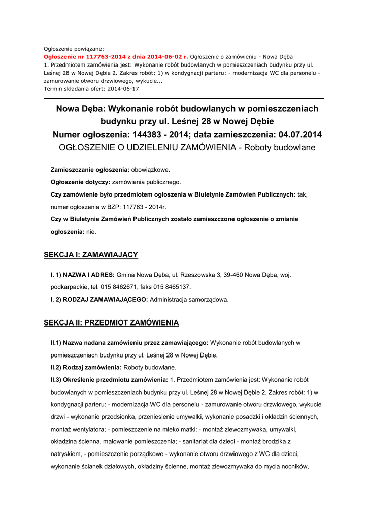 Ogłoszenie powiązane: Ogłoszenie nr 117763-2014 z dnia 2014-06-02 r. Ogłoszenie o zamówieniu - Nowa Dęba 1. Przedmiotem zamówienia jest: Wykonanie robót budowlanych w pomieszczeniach budynku przy ul. Leśnej 28 w Nowej Dębie 2. Zakres robót: 1) w kondygnacji parteru: - modernizacja WC dla personelu zamurowanie otworu drzwiowego, wykucie... Termin składania ofert: 2014-06-17 Nowa Dęba: Wykonanie robót budowlanych w pomieszczeniach budynku przy ul. Leśnej 28 w Nowej Dębie Numer ogłoszenia: 144383 - 2014; data zamieszczenia: 04.07.2014 OGŁOSZENIE O UDZIELENIU ZAMÓWIENIA - Roboty budowlane Zamieszczanie ogłoszenia: obowiązkowe. Ogłoszenie dotyczy: zamówienia publicznego. Czy zamówienie było przedmiotem ogłoszenia w Biuletynie Zamówień Publicznych: tak, numer ogłoszenia w BZP: 117763 - 2014r. Czy w Biuletynie Zamówień Publicznych zostało zamieszczone ogłoszenie o zmianie ogłoszenia: nie. SEKCJA I: ZAMAWIAJĄCY I. 1) NAZWA I ADRES: Gmina Nowa Dęba, ul. Rzeszowska 3, 39-460 Nowa Dęba, woj. podkarpackie, tel. 015 8462671, faks 015 8465137. I. 2) RODZAJ ZAMAWIAJĄCEGO: Administracja samorządowa. SEKCJA II: PRZEDMIOT ZAMÓWIENIA II.1) Nazwa nadana zamówieniu przez zamawiającego: Wykonanie robót budowlanych w pomieszczeniach budynku przy ul. Leśnej 28 w Nowej Dębie. II.2) Rodzaj zamówienia: Roboty budowlane. II.3) Określenie przedmiotu zamówienia: 1. Przedmiotem zamówienia jest: Wykonanie robót budowlanych w pomieszczeniach budynku przy ul. Leśnej 28 w Nowej Dębie 2. Zakres robót: 1) w kondygnacji parteru: - modernizacja WC dla personelu - zamurowanie otworu drzwiowego, wykucie drzwi - wykonanie przedsionka, przeniesienie umywalki, wykonanie posadzki i okładzin ściennych, montaż wentylatora; - pomieszczenie na mleko matki: - montaż zlewozmywaka, umywalki, okładzina ścienna, malowanie pomieszczenia; - sanitariat dla dzieci - montaż brodzika z natryskiem, - pomieszczenie porządkowe - wykonanie otworu drzwiowego z WC dla dzieci, wykonanie ścianek działowych, okładziny ścienne, montaż zlewozmywaka do mycia nocników, przeniesienie istniejącego hydrantu - wejście - wyburzenie ścianki pomiędzy sienią a wózkownią, poszerzenie drzwi do szatni dzieci; - w całości kondygnacji - wymiana i wykonanie posadzek rulonowe typu Tarket OPTIMA i posadzki z płytek ceramicznych; wymiana skrzydeł drzwiowych z ościeżnicami; wy-miana opraw oświetleniowych, gniazd wtykowych i włączników światła 2) w kondygnacji piętra: - modernizacja szatni dla personelu: - wymian ścianki z luksferów na gazobetonową, tynkowanie, malowanie pomieszczenia - sanitariat dla dzieci - montaż brodzika z natryskiem, wymiana muszli ustępowych z wykonaniem przepierzeń, wymiana posadzki i okładzin ściennych. wyburzenie ścianki - pomieszczenie porządkowe - wykonanie ścianek działowych, montaż zlewozmywaka do mycia nocników, posadzka, okładzina ścienna - sala dzieci - wykonanie ścianki działowej z drzwiami przesuwnymi, rozbiórka istniejącej posadzki parkietowej, wykonanie wylewki i ułożenie wykładziny typu Tarkett OPTIMA - w całości kondygnacji - wymiana skrzydeł drzwiowych z ościeżnicami; wymiana opraw oświetleniowych, gniazd wtykowych i włączników światła 3) winda gastronomiczna (kuchenna) - demontaż windy istniejącej i montaż nowej windy w istniejącym szybie. Winda gastronomiczna (kuchenna), trójprzystankowa, 600 x 600 x 1000; dzielona na część: czystą i brudną z półkami pośrednimi. Szyb windy ze stali nierdzewnej, instrukcja obsługi w języku polskim. Zamówienie obejmuje demontaż windy istniejącej, odnowienie szybu, montaż i rozruch kompletnej windy gastronomicznej (kuchennej). 3. Koszty dostawy i montażu wszelkich urządzeń i instalacji muszą zawierać całość kosztów związanych z realizacją, w tym wykonanie projektów wykonawczych w uzgodnieniu z inwestorem, jeśli takie będą niezbędne do należytego wykonania całości zadania oraz uzyskania certyfikatów, dopuszczenia do użytkowania oraz koszty rozruchu, instruktaży, szkoleń oraz gwarancji. 4. Wbudowane materiały winny posiadać atesty, certyfikaty, deklaracje zgodności. Na każde żądanie Zamawiającego lub inspektora nadzoru Wykonawca obowiązany jest okazać w stosunku do wskazanych materiałów: certyfikat zgodności z Polską normą lub aprobatę techniczną. 5. Wymagany okres rękojmi i gwarancji na wykonane roboty ( materiały i robociznę) wynosi 60 miesięcy od dnia odebrania przez Zamawiającego robót budowlanych i podpisania (bez uwag) protokołu końcowego. 6. Zakres robót zawierają przedmiary robót stanowiące załącznik nr 3 SIWZ oraz dokumentacja techniczna stanowiąca załącznik nr 5 do SIWZ. Dokumentem podstawowym przy realizacji robót jest projekt budowlano - wykonawczy. Przedmiary są elementem uzupełniającym, który będzie brany pod uwagę jedynie w przypadku braku elementów robót w projekcie. 7. Dokumentacja techniczna dostępna jest do wglądu w Urzędzie Miasta i Gminy Nowa Dęba, ul. Rzeszowska 3 pok. 302 w godzinach od 9:00 - 15:00. lub na stronie internetowej Zamawiającego http://www.nowadeba.pl/przetargi/przetargi/ Zał nr 5 do SIWZ 8. Uwaga : Zamawiający zgadza się na zastosowanie innych elementów niż przyjęte w opisie zamówienia pod warunkiem zastosowania kompletnych systemów o parametrach nie gorszych niż przyjęte w opisie zamówienia. Podane w SIWZ gotowe wyroby, urządzenia oraz wyposażenie z podaniem nazwy pro-ducenta stanowią wyłącznie przykład i mają na celu jedynie określenie parametrów i cech produktów wymienionych, z zachowaniem jej wymogów w zakresie parametrów technicznych i jakości. Ciężar udowodnienia zachowania parametrów wymaganych przez zamawiającego leży po stronie Wykonawcy.. II.4) Wspólny Słownik Zamówień (CPV): 45.45.30.00-7, 45.33.20.00-3, 45.31.00.00-3. SEKCJA III: PROCEDURA III.1) TRYB UDZIELENIA ZAMÓWIENIA: Przetarg nieograniczony III.2) INFORMACJE ADMI