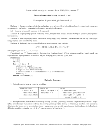 Lista zadań na zajęcia, semestr letni 2013/2014, zestaw V Dynamiczne struktury danych – cd. Przemysław Krysztowiak, [email protected] Zadanie 1. Zaproponuj pseudokody realizujące operacje na liście jednokierunkowej: wstawienie elementu na początek, na koniec, znalezienie elementu, usunięcie elementu. (a) Oszacuj złożoność czasową tych operacji. Zadanie 2. Zaproponuj sposób realizacji stosu, kolejki oraz kolejki priorytetowej za pomocą listy jednokierunkowej. Zadanie 3. Zakoduj algorytmem Huffmana następujący ciąg znaków: „ala ma kota kot ma alę” (uwzględniając spację jako dodatkowy znak). Zadanie 4. Zakoduj algorytmem Huffmana następujący ciąg znaków: „F(0)=0;F(1)=1;F(n)=F(n–1)+F(n–2)” (uwzględniając znaki (, ), =, −,+,;). Pseudokody za [T. Cormen et al., Introduction to algorithms]. C jest zbiorem znaków, każdy znak ma częstotliwość występowania w tekście. Q jest kolejką priorytetową typu „min”. HUFFMAN(C) n := |C|; Q := C; for i := 1 to n − 1 utwórz nowy węzeł z; z.left := x := ExtractMin(Q); z.right := x := ExtractMin(Q); z.czestotliwosc = x.czestotliwosc + y.czestotliwosc; Insert(Q, z); return ExtractMin(Q); Zadanie domowe 1. Zaimplementuj stos w oparciu o tablicę. STACK-EMPTY(S) if top[S] = 0 then return TRUE else return FALSE PUSH(S, x) top[S] := top[S] + 1 S[top[S]] := x POP(S) if STACK-EMPTY(S) then error „przepełnienie” else top[S] := top[S] - 1 return S[top[S] + 1] 2. Zaimplementuj kalkulator odwrotnej notacji polskiej (używając własnej implementacji stosu). Algorytm, przechodząc wyrażenie od lewej do prawej: jeśli napotyka liczbę, to wrzuca ją na stos; jeśli napotyka działanie, to bierze dwie wartości ze stosu i wrzuca na stos wynik napotkanego działania na tych liczbach. (Kolejne znaki wyrażenia, np. „3 3 +”, można czytać z klawiatury). Wyrażam zgodę na drukowanie przez studentów i pracowników WMiI UMK treści zawartej w niniejszym pliku.