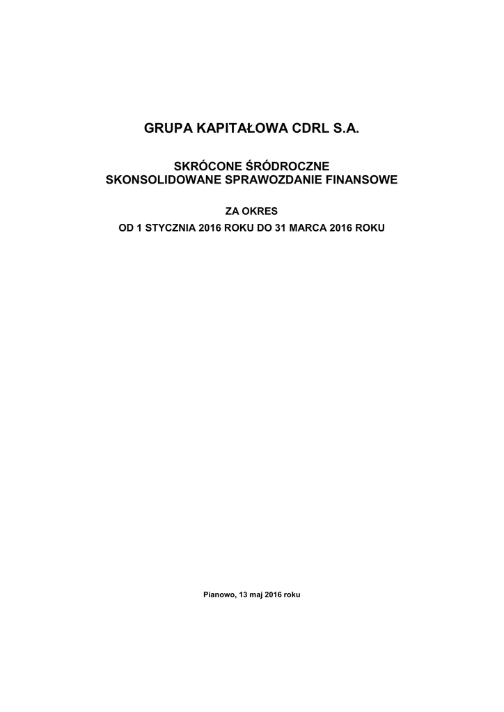 GRUPA KAPITAŁOWA CDRL S.A. SKRÓCONE ŚRÓDROCZNE SKONSOLIDOWANE SPRAWOZDANIE FINANSOWE ZA OKRES OD 1 STYCZNIA 2016 ROKU DO 31 MARCA 2016 ROKU Pianowo, 13 maj 2016 roku Nazwa Spółki: Grupa Kapitałowa CDRL S.A. Poziom zaokrągleń: wszystkie kwoty wyrażone są w tysiącach złotych polskich (o ile nie wskazano inaczej) Okres objęty sprawozdaniem finansowym: 01.01.2016 – 31.03.2016 Waluta sprawozdawcza: złoty polski (PLN) SPIS TREŚCI WYBRANE SKONSOLIDOWANE DANE FINANSOWE GRUPY KAPITAŁOWEJ CDRL S.A. ............................... 5 SKONSOLIDOWANE SPRAWOZDANIE Z SYTUACJI FINANSOWEJ .................................................................. 6 SKONSOLIDOWANY RACHUNEK ZYSKÓW I STRAT .......................................................................................... 8 SKONSOLIDOWANY ZYSK (STRATA) NETTO NA JEDNĄ AKCJĘ ZWYKŁĄ (PLN) ............................................ 8 SKONSOLIDOWANE SPRAWOZDANIE Z CAŁKOWITYCH DOCHODÓW ........................................................... 9 SKONSOLIDOWANE ZESTAWIENIE ZMIAN W KAPITALE WŁASNYM ............................................................. 10 SKONSOLIDOWANE SPRAWOZDANIE Z PRZEPŁYWÓW PIENIĘŻNYCH ....................................................... 12 WYBRANE JEDNOSTKOWE DANE FINANSOWE CDRL S.A. ............................................................................ 13 SPRAWOZDANIE Z SYTUACJI FINANSOWEJ CDRL S.A. ................................................................................. 14 RACHUNEK ZYSKÓW I STRAT CDRL S.A. ......................................................................................................... 16 ZYSK (STRATA) NETTO CDRL S.A. NA JEDNĄ AKCJĘ ZWYKŁĄ (PLN) .......................................................... 17 ZESTAWIENIE ZMIAN W KAPITALE WŁASNYM CDRL S.A. .............................................................................. 18 SPRAWOZDANIE Z PRZEPŁYWÓW PIENIĘŻNYCH CDRL S.A. ........................................................................ 20 DODATKOWE INFORMACJE I OBJAŚNIENIA DO SKRÓCONEGO SKONSOLIDOWANEGO SPRAWOZDANIA FINANSOWEGO SPORZĄDZONEGO ZA III KWARTAŁ 2016 ROKU ................................................................. 21 1. Charakterystyka Grupy Kapitałowej CDRL S.A. ...................................................................................... 21 2. Podstawa sporządzenia oraz zasady rachunkowości ............................................................................. 22 3. Dokonania Grupy Kapitałowej CDRL S.A................................................................................................ 23 4. Czynniki i zdarzenia, w szczególności o nietypowym charakterze, mające znaczący wpływ na osiągnięte skonsolidowane wyniki finansowe .................................................................................................................... 24 5. Objaśnienia dotyczące sezonowości lub cykliczności działalności Grupy Kapitałowej CDRL S.A. w okresie objętym sprawozdaniem....................................................................................................................... 24 6. Informacje o odpisach aktualizujących wartość zapasów do wartości netto możliwej do uzyskania i odwróceniu odpisów z tego tytułu ..................................................................................................................... 25 7. Informacje o odpisach aktualizujących z tytułu utraty wartości aktywów finansowych, rzeczowych aktywów trwałych, wartości niematerialnych i prawnych lub innych aktywów oraz odwróceniu takich odpisów 25 8. Informacje o utworzeniu, zwiększeniu, wykorzystaniu i rozwiązaniu rezerw ........................................... 25 9. Informacje o rezerwach i aktywach z tytułu odroczonego podatku dochodowego .................................. 25 10. Informacje o istotnych transakcjach nabycia i sprzedaży rzeczowych aktywów trwałych........................ 25 11. Informacje o istotnym zobowiązaniu z tytułu dokonania zakupu rzeczowych aktywów trwałych ............. 25 12. Informacje o istotnych rozliczeniach z tytułu spraw sądowych ................................................................ 25 13. Wskazanie korekt błędów poprzednich okresów ..................................................................................... 25 14. Informacje na temat zmian sytuacji gospodarczej i warunków prowadzenia działalności, które mają istotny wpływ na wartość godziwą aktywów finansowych i zobowiązań finansowych Grupy Kapitałowej ......... 25 15. Informacje o niespłaceniu kredytu lub pożyczki lub naruszeniu istotnych postanowień umowy kredytu lub pożyczki ............................................................................................................................................................ 25 16. Informacje o zmianie sposobu (metody) ustalania wartości godziwej instrumentów finansowych .......... 26 17. Informacja dotycząca zmiany klasyfikacji aktywów finansowych w wyniku zmiany celu lub wykorzystania tych aktywów .................................................................................................................................................... 26 18. Informacje dotyczące emisji, wykupu i spłaty nie udziałowych i kapitałowych papierów wartościowych . 23 19. Informacje dotyczące wypłaconej (lub zadeklarowanej) dywidendy, łącznie i w przeliczeniu na jedną akcję, z podziałem na akcje zwykłe i uprzywilejowane ..................................................................................... 26 20. Podział na segmenty działalności – przychody i wyniki przypadające na poszczególne segmenty ........ 26 21. Zdarzenia, które wystąpiły po dniu bilansowym, nieujęte w sprawozdaniu finansowym a mogące w znaczący sposób wpłynąć na przyszłe wyniki finansowe Grupy Kapitałowej CDRL S.A. ................................. 23 Nazw