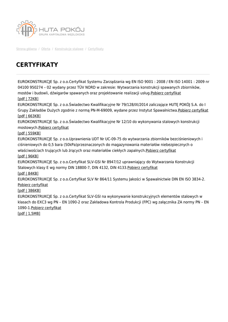 Strona główna / Oferta / Konstrukcje stalowe / Certyfikaty CERTYFIKATY EUROKONSTRUKCJE Sp. z o.o.Certyfikat Systemu Zarządzania wg EN ISO 9001 : 2008 / EN ISO 14001 : 2009 nr 04100 950274 – 02 wydany przez TÜV NORD w zakresie: Wytwarzania konstrukcji spawanych zbiorników, mostów i budowli, dźwigarów spawanych oraz projektowanie realizacji usług.Pobierz certyfikat [pdf | 72KB] EUROKONSTRUKCJE Sp. z o.o.Świadectwo Kwalifikacyjne Nr 79/128/IX/2014 zaliczające HUTĘ POKÓJ S.A. do I Grupy Zakładów Dużych zgodnie z normą PN-M-69009, wydane przez Instytut Spawalnictwa.Pobierz certyfikat [pdf | 663KB] EUROKONSTRUKCJE Sp. z o.o.Świadectwo Kwalifikacyjne Nr 12/10 do wykonywania stalowych konstrukcji mostowych.Pobierz certyfikat [pdf | 559KB] EUROKONSTRUKCJE Sp. z o.o.Uprawnienia UDT Nr UC-09-75 do wytwarzania zbiorników bezciśnieniowych i ciśnieniowych do 0,5 bara (50kPa)przeznaczonych do magazynowania materiałów niebezpiecznych o właściwościach trujących lub żrących oraz materiałów ciekłych zapalnych.Pobierz certyfikat [pdf | 96KB] EUROKONSTRUKCJE Sp. z o.o.Certyfikat SLV-GSI Nr 8947/12 uprawniający do Wytwarzania Konstrukcji Stalowych klasy E wg normy DIN 18800-7, DIN 4132, DIN 4133.Pobierz certyfikat [pdf | 84KB] EUROKONSTRUKCJE Sp. z o.o.Certyfikat SLV Nr 864/11 Systemu Jakości w Spawalnictwie DIN EN ISO 3834-2. Pobierz certyfikat [pdf | 386KB] EUROKONSTRUKCJE Sp. z o.o.Certyfikat SLV-GSI na wykonywanie konstrukcyjnych elementów stalowych w klasach do EXC3 wg PN – EN 1090-2 oraz Zakładowa Kontrola Produkcji (FPC) wg załącznika ZA normy PN – EN 1090-1.Pobierz certyfikat [pdf | 1,5MB]