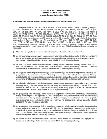 UCHWAŁA NR XXIV/168/2008 RADY GMINY BRÓJCE z dnia 24 października 2008r w sprawie: określenia stawek podatku od środków transportowych. Na podstawie art.18 ust.2 pkt 8 ustawy z dnia 8 marca 1990 r. o samorządzie gminnym (t.j. Dz.U z 2001r. Nr.142, poz.1591; z 2002r. Nr 23, poz. 220, Nr 62, poz. 558, nr 113, poz. 984, Nr 153 poz.1271 i Nr 214, poz. 1806; z 2003 r. Nr 80, poz. 717, Nr 162, poz. 1568; z 2004r. Nr 102 poz.1055, Nr 116 poz.1203; z 2005r. Nr 172, poz.1441, Nr 175, poz. 1457; z 2006r. Nr 17, poz. 128, Nr 181, poz. 1337; z 2007r. Nr 48, poz. 327, Nr 138, poz. 974, Nr 173, poz. 1218) oraz na podstawie art.10 ustawy z dnia 12 stycznia 1991 r. o podatkach i opłatach lokalnych; (t.j. Dz.U. z 2006 r. Nr 121, poz. 844, Nr 220, poz. 1601, Nr 225, poz. 1635, Nr 245, poz. 1775, Nr 249, poz. 1828, Nr 251, poz. 1847; z 2008r. Nr 93, poz. 585, Nr 116, poz. 730) oraz obwieszczenia Ministra Finansów z dnia 29 lipca 2008r. w sprawie górnych granic stawek kwotowych podatków i opłat lokalnych (MP z 2008r Nr 59, poz. 531) Rada Gminy Brójce uchwala, co następuje § 1.Określa się wysokość rocznych stawek podatku od środków transportowych : 1) od samochodów cięŜarowych o dopuszczalnej masie całkowitej powyŜej 3,5 tony i poniŜej 12 ton, w zaleŜności od wieku pojazdu, dopuszczalnej masy całkowitej oraz jego wpływu na środowisko, stawki podatku określa załącznik Nr 1 do niniejszej uchwały. 2) od samochodów cięŜarowych o dopuszczalnej masie całkowitej równej lub wyŜszej niŜ 12 ton, w zaleŜności od liczby osi, dopuszczalnej masy całkowitej pojazdu i rodzaju zawieszenia, stawki podatku określa załącznik Nr 2 do niniejszej uchwały. 3) od ciągnika siodłowego i balastowego przystosowanego do uŜywania łącznie z naczepą lub przyczepą o dopuszczalnej masie całkowitej zespołu pojazdów od 3,5 tony i poniŜej 12 ton, w zaleŜności od wieku pojazdu, dopuszczalnej masy całkowitej, nacisku na siodło oraz jego wpływu na środowisko, stawki podatku określa załącznik Nr 3 do niniejszej uchwały.” 4) od ciągnika siodłowego lub balastowego przystosowanego do uŜywania łącznie z naczepą lub przyczepą o dopuszczalnej masie całkowitej pojazdów równej lub wyŜszej niŜ 12 ton, w zaleŜności od liczby osi, dopuszczalnej masy całkowitej pojazdu i rodzaju zawieszenia, stawki podatku określa załącznik Nr 4 do niniejszej uchwały. 5) od przyczepy lub naczepy, które łącznie z pojazdem silnikowym posiadają dopuszczalną masę całkowitą od 7 ton i poniŜej 12 ton, z wyjątkiem związanych wyłączenie z działalnością rolniczą prowadzoną przez podatnika podatku rolnego, w zaleŜności od wieku pojazdu, dopuszczalnej masy całkowitej oraz jego wpływu na środowisko, stawki podatku określa załącznik Nr 5 do niniejszej uchwały. 6) od przyczepy lub naczepy, które łącznie z pojazdem silnikowym posiadają dopuszczalną masę całkowitą równą lub wyŜszą niŜ 12 ton, z wyjątkiem związanych wyłącznie z działalnością rolniczą prowadzoną przez podatnika podatku rolnego, w zaleŜności od liczby osi, dopuszczalnej masy całkowitej zespołu pojazdów i rodzaju zawieszenia, stawki podatku określa załącznik Nr 6 do niniejszej uchwały. 7) od autobusów, w zaleŜności od wieku pojazdu, ilości miejsc do siedzenia oraz wpływu na środowisko, stawki podatku określa załącznik Nr 7 do niniejszej uchwały. § 2. Traci moc Uchwała Nr XIV/94/2007 Rady Gminy Brójce z dnia 22 listopada 2007r. w sprawie określenia stawek podatku od środków transportowych. § 3. Wykonanie uchwały powierza się Wójtowi Gminy. § 4. Uchwała podlega publikacji w Dzienniku Urzędowym Województwa Łódzkiego i wchodzi w Ŝycie po upływie 14 dni od dnia ogłoszenia z mocą obowiązującą od 01 stycznia 2009 roku. Załącznik Nr 1 do uchwały Nr XXIV/168/2008 Rady Gminy Brójce z dnia 24 października 2008r. Wiek pojazdu i dopuszczalna masa całkowita w tonach Stawki podatku /w złotych/ Spełnia normy czystości spalin EURO lub posiada katalizator Pozostałe do 30 lat włącznie powyŜej 3,5 do 5,5 włącznie 577 632 powyŜej 5,5 do 9 włącznie 802 857 powyŜej 9 i poniŜej 12 t 986 1.039 powyŜej 30 lat powyŜej 3,5 do 5,5 włącznie 632 685 powyŜej 5,5 do 9 włącznie 857 932 1.039 1.093 powyŜej 9 i poniŜej 12 t Załącznik Nr 2 do uchwały Nr XXIV/168/2008 Rady Gminy Brójce z dnia 24 października 2008r. Liczba osi i dopuszczalna masa Stawki podatku / w złotych/ całkowita w tonach nie oś jezdna/osie jezdne/ z zawieszeniem mniej mniej niŜ pneumatycznym lub zawieszeniem Inne systemy zawieszenia osi niŜ uznanym za równowaŜne jezdnych Dwie osie 12 13 1.060 1.115 13 14 1.168 1.222 14 15 1.285 1.340 1.393 1.447 15 Trzy osie 12 17 1.393 1.447 17 19 1.500 1.555 19 21 1.618 1.672 21 23 1.725 1.778 23 25 1.832 1.886 1.951 2.004 25 Cztery osie i więcej 12 25 1.832 1.886 25 27 1.951 2.004 27 29 2.058 2.111 29 31 2.165 2.637 2.273 2.637 31 Załącznik Nr 3 do uchwały Nr XXIV/168/2008 Rady Gminy Brójce z dnia 24 października 2008r. Wiek pojazdu, nacisk na siodło i dopuszczalna masa całkowita w tonach Stawki podatku / w złotych/ Spełnia normy czystości spalin EURO lub posiada katalizator pozostałe do 30 lat włącznie i kaŜdym nacisku na siodło od 3,5 i poniŜej 12 1.448 1.500 powyŜej 30 lat i kaŜdym nacisku na siodło od 3,5 i poniŜej 12 1.500 1.543 Załącznik Nr 4 do uchwały Nr XXIV/168/2008 Rady Gminy Brójce z dnia 24 października 2008r. Liczba osi i dopuszczalna masa całkowita zespołu pojazdów: ciągnik siodłowy + naczepa ciągnik balastowy + przyczepa w t. nie mniej niŜ mniej niŜ Stawki podatku / w złotych/ oś jezdna /osie jezdne/ z zawieszeniem pneumatycznym lub zawieszeniem uznanym za równowaŜne Inne systemy zawieszenia osi jezdnych Dwie osie 12 18 1.500 1.555 18 25 1.555 1.672 25 31 1.672 1.778 1.778 2.075 31 Trzy osie 12 40 40 1.778 1.886 2.337 2.685 Załącznik Nr 5 do uchwały Nr XXIV/168/2008 Rady Gminy Brójce 