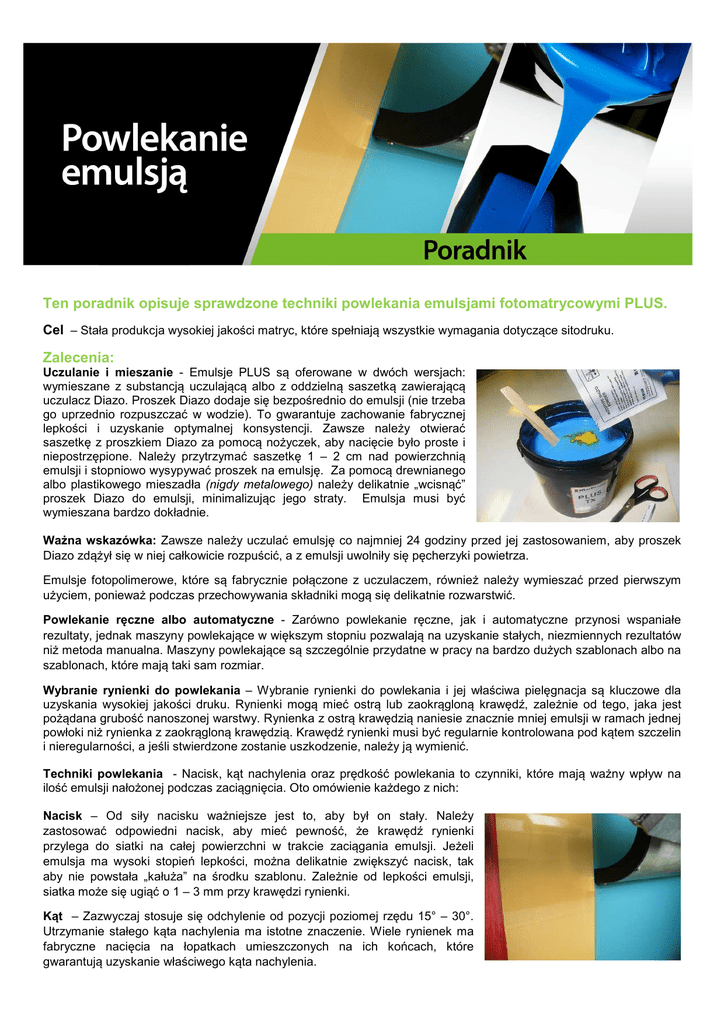 Ten poradnik opisuje sprawdzone techniki powlekania emulsjami fotomatrycowymi PLUS. Cel – Stała produkcja wysokiej jakości matryc, które spełniają wszystkie wymagania dotyczące sitodruku. Zalecenia: Uczulanie i mieszanie - Emulsje PLUS są oferowane w dwóch wersjach: wymieszane z substancją uczulającą albo z oddzielną saszetką zawierającą uczulacz Diazo. Proszek Diazo dodaje się bezpośrednio do emulsji (nie trzeba go uprzednio rozpuszczać w wodzie). To gwarantuje zachowanie fabrycznej lepkości i uzyskanie optymalnej konsystencji. Zawsze należy otwierać saszetkę z proszkiem Diazo za pomocą nożyczek, aby nacięcie było proste i niepostrzępione. Należy przytrzymać saszetkę 1 – 2 cm nad powierzchnią emulsji i stopniowo wysypywać proszek na emulsję. Za pomocą drewnianego albo plastikowego mieszadła (nigdy metalowego) należy delikatnie „wcisnąć” proszek Diazo do emulsji, minimalizując jego straty. Emulsja musi być wymieszana bardzo dokładnie. Ważna wskazówka: Zawsze należy uczulać emulsję co najmniej 24 godziny przed jej zastosowaniem, aby proszek Diazo zdążył się w niej całkowicie rozpuścić, a z emulsji uwolniły się pęcherzyki powietrza. Emulsje fotopolimerowe, które są fabrycznie połączone z uczulaczem, również należy wymieszać przed pierwszym użyciem, ponieważ podczas przechowywania składniki mogą się delikatnie rozwarstwić. Powlekanie ręczne albo automatyczne - Zarówno powlekanie ręczne, jak i automatyczne przynosi wspaniałe rezultaty, jednak maszyny powlekające w większym stopniu pozwalają na uzyskanie stałych, niezmiennych rezultatów niż metoda manualna. Maszyny powlekające są szczególnie przydatne w pracy na bardzo dużych szablonach albo na szablonach, które mają taki sam rozmiar. Wybranie rynienki do powlekania – Wybranie rynienki do powlekania i jej właściwa pielęgnacja są kluczowe dla uzyskania wysokiej jakości druku. Rynienki mogą mieć ostrą lub zaokrągloną krawędź, zależnie od tego, jaka jest pożądana grubość nanoszonej warstwy. Rynienka z ostrą krawędzią naniesie znacznie mniej emulsji w ramach jednej powłoki niż rynienka z zaokrągloną krawędzią. Krawędź rynienki musi być regularnie kontrolowana pod kątem szczelin i nieregularności, a jeśli stwierdzone zostanie uszkodzenie, należy ją wymienić. Techniki powlekania - Nacisk, kąt nachylenia oraz prędkość powlekania to czynniki, które mają ważny wpływ na ilość emulsji nałożonej podczas zaciągnięcia. Oto omówienie każdego z nich: Nacisk – Od siły nacisku ważniejsze jest to, aby był on stały. Należy zastosować odpowiedni nacisk, aby mieć pewność, że krawędź rynienki przylega do siatki na całej powierzchni w trakcie zaciągania emulsji. Jeżeli emulsja ma wysoki stopień lepkości, można delikatnie zwiększyć nacisk, tak aby nie powstała „kałuża” na środku szablonu. Zależnie od lepkości emulsji, siatka może się ugiąć o 1 – 3 mm przy krawędzi rynienki. Kąt – Zazwyczaj stosuje się odchylenie od pozycji poziomej rzędu 15° – 30°. Utrzymanie stałego kąta nachylenia ma istotne znaczenie. Wiele rynienek ma fabryczne nacięcia na łopatkach umieszczonych na ich końcach, które gwarantują uzyskanie właściwego kąta nachylenia. Prędkość – Zawsze należy nakładać powłokę najwolniej, jak to możliwe. To pomoże zminimalizować ilość powietrza uwięzionego w otworach siatki. Im twardsza jest siatka i im gęstsza jest emulsja, tym wolniej należy nakładać powłokę. Podczas ręcznego zaciągania należy uważać, aby nie pozostawić na siatce linii spowodowanych nagłym drgnięciem ręki. Rysunek obok przedstawia bąbelki powietrza uwięzione przy siatce podczas nakładania powłoki. Należy przestrzegać ogólnej zasady, która mówi, że prędkość nakładania powłoki powinna wynosić od 80 do 300 cm na minutę, zależnie od lepkości emulsji. Ważna wskazówka: Nawet niewielkie różnice w ilości emulsji w rynience mogą mieć znaczący wpływ na gęstość powłoki. Dlatego w sytuacjach, gdy gęstość powłoki ma kluczowe znaczenie (na przykład w czterokolorowych wydrukach półtonowych) należy dopilnować, aby koryta zawsze były wypełnione do tej samej wysokości przy każdym szablonie z danego zestawu. Zawsze należy wycierać krawędź powłoki natychmiast po zakończeniu zaciągania. Zasady nakładania powłoki - Liczba nakładanych powłok i sposób ich nakładania to najlepszy sposób na kontrolowanie wskaźników matrycy Rz i EOM. W większości sitodruków dąży się do uzyskania szablonu, który będzie miał cienką, płaską warstwę matrycy po stronie druku oraz cienką, w pełni utwardzoną warstwę emulsji po stronie rakla. Budowa matrycy zależy przede wszystkim od zastosowania wielu mokrych powłok po stronie rakla, natomiast gładkość matrycy jest rezultatem nakładania cienkich warstw emulsji po stronie druku. Typowa metoda ręcznego zaciągania emulsji polega na nałożeniu jednej albo dwóch podstawowych powłok emulsji po stronie druku, które „wypełnią” siatkę, a zaraz potem na nałożeniu jednej albo dwóch powłok po stronie rakla. Dzięki temu mokra emulsja zostanie przeciśnięta przez siatkę na stronę druku, a po stronie rakla pozostanie tylko cienka, uszczelniająca warstwa. Maszyny powlekające umożliwiają zaciągnięcie emulsji po obu stronach jednocześnie, dlatego ta metoda jest bardzo wydajna. Należy jednak pamiętać, że ostatnia podstawowa powłoka zawsze musi być nałożona po stronie rakla. Oczywiście istnieje wiele odmian tej metody, które zależą od wielkości ramki, numeru sita, wymagań dotyczących obrazu itd. Ogólne zalecenie jest jednak takie, aby zaczynać po stronie druku, a kończyć po stronie rakla. Dodatkowe powleczenie - Wszystkie emulsje tracą objętość podczas wysychania na skutek wyparowywania wody, przez co kurczą się wokół włókien siatki i pozostawiaj