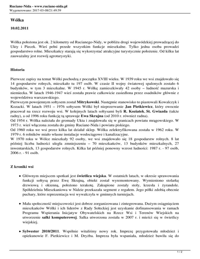 Ruciane-Nida - www.ruciane-nida.pl Wygenerowano: 2017-03-08/21:49:59 Wólka 10.02.2011 Wólka położona jest ok. 2 kilometry od Rucianego-Nidy, w pobliżu drogi wojewódzkiej prowadzącej do Ukty i Piecek. Wieś pełni przede wszystkim funkcje mieszkalne. Tylko jedna osoba prowadzi gospodarstwo rolne. Mieszkańcy starają się wykorzystać atrakcyjne turystycznie położenie. Od kilku lat zauważalny jest rozwój agroturystyki. Historia Pierwsze zapisy na temat Wólki pochodzą z początku XVIII wieku. W 1939 roku we wsi znajdowało się 14 gospodarstw rolnych, mieszkało tu 197 osób. W czasie II wojny światowej spalonych zostało 6 budynków, w tym 3 mieszkalne. W 1945 r. Wólkę zamieszkiwały 42 osoby – ludność mazurska i niemiecka. W latach 1946-1947 wieś została prawie całkowicie zasiedlona przez osadników głównie z województwa warszawskiego. Pierwszym powojennym sołtysem został Mitrykowski. Następnie stanowisko to piastowali Kowalczyk i Kozacki. W latach 1951 – 1976 sołtysem Wólki był nieprzerwanie Jan Pietkiewicz, który owocnie pracował na rzecz rozwoju wsi. W kolejnych latach sołtysami byli R. Koziatek, St. Gwiazda (także radny), a od 1996 roku funkcję tą sprawuje Ewa Skrajna (od 2010 r. również radna). Od 1954 r. Wólka należała do gromady Ukta i znajdowała się w granicach powiatu mrągowskiego. W 1973 r. wieś włączona została do gminy Ruciane-Nida i powiatu piskiego. Od 1960 roku we wsi przez kilka lat działał sklep. Wólka zelektryfikowana została w 1962 roku. W 1979 r. 6 rolników miało własne instalacje wodociągowe i kanalizacyjne. W 1970 roku w Wólce mieszkały 92 osoby, we wsi znajdowało się 18 gospodarstw rolnych. 8 lat później liczba ludności uległa zmniejszeniu – 70 mieszkańców, 13 budynków mieszkalnych, 27 inwentarskich, 13 gospodarstw rolnych. Kilka lat później ponowny wzrost ludności: 1987 r. - 97 osób, 2006 r. - 91 osób. Z kroniki wsi Głównym miejscem spotkań jest świetlica wiejska. W ostatnich latach, w okresie sprawowania funkcji sołtysą przez Ewę Skrajną, obiekt został wyremontowany. Wymieniono stolarkę drzwiową i okienną, położono terakotę. Zakupione zostały stoły, krzesła i żyrandole. Spółdzielnia Mieszkaniowa w Nidzie przekazała segment z regałem. Jego półki zdobią obecnie puchary, które reprezentacja wsi wywalczyła w gminnych turniejach. Mała społeczność miejscowości jest dobrze zorganizowana i zintegrowana. Dużym osiągnięciem mieszkańców Wólki i ich liderów z Rady Sołeckiej jest uzyskanie dofinansowania w ramach Programu Wspierania Inicjatyw Obywatelskich na Rzecz Wsi i Terenów Wiejskich na utworzenie salki komputerowej. Salka utworzona została w 2007 r. i mieści się w świetlicy wiejskiej. Sylwester 2010/2011. Wspólnie witaliśmy nowy rok. Imprezę przygotowała młodzież i opiekunowie F. Pietkiewicz i M. Dryżba. Impreza była wspaniała, młodzież bawiła się do 1/2 Ruciane-Nida - www.ruciane-nida.pl Wygenerowano: 2017-03-08/21:49:59 „białego rana”. O północy tradycyjna lampka szampana, życzenia i salwa petard. Paczki świąteczne. Dzieci w wieku szkolnym otrzymały paczki świąteczne, sfinansowane przez Urząd Miasta i Gminy. W marcu zorganizowany został Dzień Kobiet, na który przybyła większość kobiet ze miejscowości. Wszystkie spotkały się z uśmiechami na twarzy, żartowały, wspominały dawne czasy. 19 marca 2011 r. jedna osoba z mieszkańców pod opieką rodziców wyprawiła 11 urodziny. Był tort, szampan bezalkoholowy i gromkie 100 lat. Święcenie pokarmu. Kwieciień. Jak co roku wieś odwiedził ks. Stanisław Ławrynowicz, aby poświęcić wielkanocne pokarmy. W lipcu 2011 r. powstał mały ogródek jordanowski. W skład placu zabaw weszła wiatka ze stołem i dwoma ławkami. Będzie służyła również dzieciom, czekającym na przyjazd autobusu szkolnego. Opracowano na podstawie Kroniki wsi Wólka 2/2 Powered by TCPDF (www.tcpdf.org)