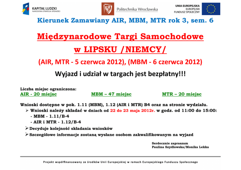 Kierunek Zamawiany AIR, MBM, MTR rok 3, sem. 6 Międzynarodowe Targi Samochodowe w LIPSKU /NIEMCY/ (AIR, MTR - 5 czerwca 2012), (MBM - 6 czerwca 2012) Wyjazd i udział w targach jest bezpłatny!!! Liczba miejsc ograniczona: AIR - 20 miejsc MBM – 47 miejsc MTR – 20 miejsc Wnioski dostępne w pok. 1.11 (MBM), 1.12 (AIR i MTR) B4 oraz na stronie wydziału. Wnioski należy składać w dniach od 22 do 23 maja 2012r. w godz. od 11:00 do 15:00: - MBM - 1.11/B-4 - AIR i MTR - 1.12/B-4 Decyduje kolejność składania wniosków Szczegółowe informacje zostaną wysłane osobom zakwalifikowanym na wyjazd Serdecznie zapraszam Paulina Szydłowska/Monika Lekka