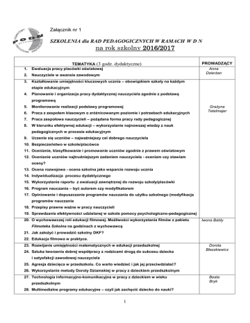 Załącznik nr 1 SZKOLENIA dla RAD PEDAGOGICZNYCH W RAMACH W D N na rok szkolny 2016/2017 TEMATYKA (3 godz. dydaktyczne) 1. Ewaluacja pracy placówki oświatowej 2. Nauczyciele w awansie zawodowym 3. Kształtowanie umiejętności kluczowych ucznia – obowiązkiem szkoły na każdym PROWADZĄCY Anna Dzierżan etapie edukacyjnym 4. Planowanie i organizacja pracy dydaktycznej nauczyciela zgodnie z podstawą programową 5. Monitorowanie realizacji podstawy programowej 6. Praca z zespołem klasowym o zróżnicowanym poziomie i potrzebach edukacyjnych 7. Praca zespołowa nauczycieli – pożądana forma pracy rady pedagogicznej 8. W kierunku efektywnej edukacji – wykorzystanie najnowszej wiedzy z nauk Grażyna Tetelmajer pedagogicznych w procesie edukacyjnym 9. Uczenie się uczniów – najważniejszy cel dobrego nauczyciela 10. Bezpieczeństwo w szkole/placówce 11. Ocenianie, klasyfikowanie i promowanie uczniów zgodnie z prawem oświatowym 12. Ocenianie uczniów najtrudniejszym zadaniem nauczyciela - oceniam czy stawiam oceny? 13. Ocena rozwojowa - ocena szkolna jako wsparcie rozwoju ucznia 14. Indywidualizacja procesu dydaktycznego 15. Wykorzystanie raportu z ewaluacji zewnętrznej do rozwoju szkoły/placówki 16. Program nauczania – być autorem czy modyfikatorem 17. Opiniowanie i dopuszczanie programów nauczania do użytku szkolnego (modyfikacja programów nauczania 18. Przepisy prawne ważne w pracy nauczycieli 19. Sprawdzanie efektywności udzielanej w szkole pomocy psychologiczno-pedagogicznej 20. O wychowawczej roli edukacji filmowej. Możliwości wykorzystania filmów z pakietu Iwona Baldy Filmoteka Szkolna na godzinach z wychowawcą 21. Jak założyć i prowadzić szkolny DKF? 22. Edukacja filmowa w praktyce. 23. Rozwijanie umiejętności matematycznych w edukacji przedszkolnej 24. Sztuka tworzenia dobrej współpracy z rodzicami drogą do sukcesu dziecka Dorota Błaszkiewicz i satysfakcji zawodowej nauczyciela 25. Agresja dziecięca w przedszkolu. Co warto wiedzieć i jak jej przeciwdziałać? 26. Wykorzystanie metody Doroty Dziamskiej w pracy z dzieckiem przedszkolnym 27. Technologia informacyjno-komunikacyjna w pracy z dzieckiem w wieku przedszkolnym 28. Multimedialne programy edukacyjne – czyli jak zachęcić dziecko do nauki? 1 Beata Bryk 29. Korelacja międzyprzedmiotowa z zakresu bloku mateamtyczno-przyrodniczego Agnieszka Grabas 30. WebQuest jako atrakcyjna odmiana metody projektów w nauczaniu na wszystkich Zofia Gońda-Ciupa poziomach 31. Jak wykorzystać Internet w nauczaniu? 32. Doradztwo zawodowe w pracy wychowawcy i nauczaniu przedmiotowym 33. Ocenianie kształtujące w edukacji wczesnoszkolnej – praktyczne rozwiązania Regina Hadryś 34. Nauka czytania przez zabawę 35. Odpowiedzialność etyczna i prawna nauczyciela 36. Komunikacja interpersonalna Małgorzata Janik-Jankowska 37. Jak odróżnić „Autyzm” od „Aspergera”? 38. Dieta jako istotny element terapii autyzmu 39. AAC- wspomagające i alternatywne metody porozumiewania się 40. Wspieranie ucznia przeżywającego żałobę 41. Bezpieczne dziecko – problematyka zagrożeń ze strony dorosłych 42. Jak realizować treści edukacji zdrowotnej zawarte w podstawie programowej Dariusz Jaśkiewicz 43. Erasmus+ w pigułce. Akcja KA1. Jak napisać projekt? 44. Erasmus+ w pigułce. Akcja KA2. Jak napisać projekt? Patrycja Kozera 45. Nauczyciel w roli coacha 46. Tworzenie materiałów multimedialnych i ich wykorzystanie na lekcji 47. Jak realizować projekty współpracy międzynarodowej w ramach programu eTwinning? 48. Ocenianie kształtujące formą motywowania uczniów 49. Techniki uczenia się i metody motywowania do nauki Beata Kwiatoń-Czernik 50. Edukacja i wychowanie ucznia ze specjalnymi potrzebami edukacyjnymi (w tym z niepełnosprawnością) w przedszkolu i szkole 51. Dysleksja rozwojowa – symptomy, edukacja i terapia 52. Uczeń z ADHD, ADD – wychowywać czy leczyć? Aleksandra Lignarska 53. Praca z uczniem trudnym i agresywnym 54. Współpraca nauczycieli z rodzicami 55. Rozwój mowy dziecka – wady i zaburzenia, profilaktyka 56. Centralne zaburzenia przetwarzania słuchowego- symptomy, terapia 57. Interpretacja opinii i orzeczenia poradni psychologiczno-pedagogicznej 58. Motywacja uczniów do nauki 59. Rola wychowawcy klasowego 60. Jak rozmawiać z rodzicami? Teresa Miś 61. Współpraca nauczyciela z rodzicami 62. Jak radzić sobie z zachowaniami agresywnymi uczniów? 63. Jak radzić sobie ze stresem? 64. Wypalenie zawodowe nauczycieli 65. Praca w szkolnym zespole zadaniowym 66. Metody i formy pracy z dzieckiem uzdolnionym 2 67. Rozwijanie kompetencji czytelniczych oraz upowszechnienie czytelnictwa wśród dzieci Lidia Mucha i młodzieży 68. Wywiadówka – propozycje ciekawych spotkań z rodzicami 69. Najczęstsze wady wymowy u dzieci w młodszym wieku szkolnym – ich przyczyny oraz sposoby wsparcia ucznia z problemami logopedycznymi Joanna Napierała 70. Pomoc psychologiczno-pedagogiczna w przedszkolu 71. Komunikacja interpersonalna jako jedna z najważniejszych umiejętności w pracy Alina Oczowińska nauczyciela 72. Komunikacja w relacji nauczyciel-uczeń a występowanie sytuacji kryzysowych w szkole 73. Bariery komunikacyjne na linii nauczyciel-uczeń, nauczyciel-rodzic. Jak je pokonywać? 74. Praca zespołowa nauczycieli podstawą rozwoju szkoły 75. Skuteczne działanie zespołowe nauczycieli a kształtowanie kompetencji uczniów w działaniu zespołowym 76. Budowanie zespołu nauczycieli z pasją – rozwijanie kultury współpracy i wzajemnego uczenia się 77. Trening kreatywności nauczycieli/uczniów szkoły/przedszkola 78. Jak rozwijać koncentrację uczniów? – przykłady dobrych praktyk 79. Zapalniki motywacji – jak sprawić, aby uczniom się chciało, tak jak im się nie chce...? 80. Jak prowadzić lekcję, by sprzyjała uczeniu się uczniów? – refleksyjny praktyk 81. Jak organizować i realizować zajęcia edukacyjne i działania wspierające ucznia z niepełn