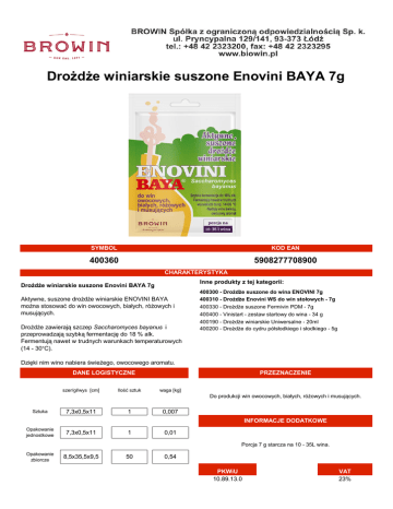 Drożdże winiarskie suszone Enovini BAYA 7g SYMBOL KOD EAN 400360 5908277708900 CHARAKTERYSTYKA Inne produkty z tej kategorii: Drożdże winiarskie suszone Enovini BAYA 7g Aktywne, suszone drożdże winiarskie ENOVINI BAYA można stosować do win owocowych, białych, różowych i musujących. Drożdże zawierają szczep Saccharomyces bayanus i przeprowadzają szybką fermentację do 18 % alk. Fermentują nawet w trudnych warunkach temperaturowych (14 - 30°C). 400300 - Drożdże suszone do wina ENOVINI 7g 400310 - Drożdże Enovini WS do win stołowych - 7g 400330 - Drożdże suszone Fermivin PDM - 7g 400400 - Vinistart - zestaw startowy do wina - 34 g 400190 - Drożdże winiarskie Uniwersalne - 20ml 400200 - Drożdże do cydru półsłodkiego i słodkiego - 5g Dzięki nim wino nabiera świeżego, owocowego aromatu. DANE LOGISTYCZNE szer/gł/wys [cm] Ilość sztuk PRZEZNACZENIE waga [kg] Do produkcji win owocowych, białych, różowych i musujących. Sztuka 7,3x0,5x11 1 0,007 INFORMACJE DODATKOWE Opakowanie jednostkowe 7,3x0,5x11 1 0,01 Porcja 7 g starcza na 10 - 35L wina. Opakowanie zbiorcze 8,5x35,5x9,5 50 0,54 PKWiU 10.89.13.0 VAT 23%