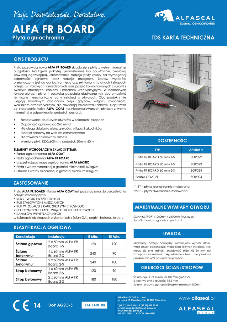. OPIS PRODUKTU Płyta przeciwogniowa ALFA FR BOARD składa się z płyty z wełny mineralnej o gęstości 160 kg/m3 pokrytej jednostronnie lub obustronnie, akrylową powłoką pęczniejącą. Zastosowanie rodzaju płyty zależy od wymaganej odporności ogniowej oraz rodzaju przegrody. Zestaw wyrobów przeznaczony jest do ogniochronnego uszczelniania w ścianach i stropach przejść rur stalowych i miedzianych oraz przejść kombinowanych z rurami z tworzyw sztucznych, kablami i kanałami wentylacyjnymi. W normalnych temperaturach płyta i powłoka pozostają elastyczne tak aby umożliwić termiczne i mechaniczne ruchy instalacji w otworach. Oba produkty nie ulegają szkodliwym działaniom oleju, grzybów, wilgoci, szkodnikom, warunkom atmosferycznym. Nie zawierają chlorowca i azbestu. Dopuszcza się stosowanie farby ALFA COAT na niepomalowanych płytach z wełny mineralnej o odpowiedniej grubości i gęstości. • • • • • • Zastosowanie do dużych otworów w ścianach i stropach Odporność ogniowa do 240 minut Nie ulega działaniu oleju, grzybów, wilgoci i szkodników Produkt odporny na warunki atmosferyczne Nie zawiera chlorowca i azbestu Wymiary płyt: 1200x600mm; grubości: 50mm, 60mm . DOSTĘPNOŚĆ ELEMENTY WCHODZĄCE W SKŁAD SYSTEMU: • Farba ogniochronna ALFA COAT • Płyta ogniochronna ALFA FR BOARD • Uszczelniająca masa ogniochronna ALFA MASTIC • Płyta z wełny mineralnej o gęstości minimalnej 160kg/m3 • Otulina z wełny mineralnej o gęstości minimum 80kg/m3 TYP ZASTOSOWANIE Płyta ALFA FR BOARD i Farba ALFA COAT jest przeznaczona do uszczelniania przejść instalacyjnych: • RUR Z TWORZYW SZTUCZNYCH • RUR STALOWYCH I MIEDZIANYCH • RUR W IZOLACJI Z KAUCZUKU SYNTETYCZNEGO • POJEDYNCZYCH KABLI, WIĄZEK I KORYT KABLOWYCH • KANAŁÓW WENTYLACYJNYCH w ścianach lub stropach wykonanych z ścian G/K, cegły, betonu, żelbetu. Artykuł nr Płyta FR BOARD 50 mm 1-S SOP022 Płyta FR BOARD 60 mm 1-S SOP023 Płyta FR BOARD 60 mm 2-S SOP024 FARBA COAT 8L SOP004 “1-S” – płyta jednostronnie malowana “2-S” – płyta dwustronnie malowana MAKSYMALNE WYMIARY OTWORU ŚCIANY/STROPY: 1200mm x 2400mm (wys./szer.). Sposób montażu zgodnie z rysunkami. KLASYFIKACJA OGNIOWA Konstrukcja Instalacja Ściana gipsowa 2 x 50mm ALFA FR Board 1-S Ściana beton/mur Ściana beton/mur Strop betonowy Strop betonowy 1 x 60mm ALFA FR Board 2-S 2 x 60mm ALFA FR Board 2-S 1 x 60mm ALFA FR Board 2-S 2 x 60mm ALFA FR Board 2-S E Min. EI Min. 120 120 240 90 240 180 120 90 180 180 UWAGA Minimalny odstęp pomiędzy instalacjami wynosi 20cm. Przez otwór przechodzić może kilka różnych instalacji. Nie mogą się one jednak znajdować bliżej niż 30 mm od krawędzi uszczelnienia. Wypełnienie otworu nie powinno przekraczać 60% powierzchni przejścia. GRUBOŚCI ŚCIAN/STROPÓW Ściany typu G/K minimum 100 mm grubości 2 warstwy płyt o grubości 12,5 mm Ściany i stropy o gęstości 650kg/m3 minimum 150mm SPOSÓB MONTAŻU 1. Przed montażem należy upewnić się, że powierzchnia otworu jest wolna od wszelkich zabrudzeń. 2. Typ i ilość płyty ogniochronnej zależy od rodzaju przejścia, instalacji i odporności ogniowej. Typ płyty z wełny mineralnej dobierz zgodnie z rysunkami. 3. Przy montażu płyt w ścianach G/K płyta pomalowaną stroną powinna być zamontowana równo z licem ściany. 4. Przy montowaniu pojedynczej warstwy płyt w ścianie lub konstrukcji betonowej, płyty mogą być położone albo z jednej strony, albo w środku. 5. Przy montażu w stropie, płytę należy zamontować równo z licem stropu od spodu. 6. Zmierz otwór i dotnij płytę z wełny mineralnej. 7.Wszystkie krawędzie płyt, mogą być pokryte za pomocą ALFA COAT lub ALFA MASTIC przed zamontowaniem. Zapewni to skuteczne zamocowanie uszczelnienia i zapewni pełną dymoszczelność. 8. Włóż odpowiednią ilość i grubość płyt do otworu zgodnie z rysunkami w instrukcji montażu. W przypadku stosowania niepomalowanych płyt z wełny mineralnej, po włożeniu, pomaluj płytę tak żeby nie było prześwitów wełny mineralnej. Ilość malowań płyty z wełny mineralnej to minimum 2 razy. 9. Wszelkie nieszczelności muszą zostać wypełnione za pomocą ALFA MASTIC z dwóch stron. 10. Płyty ALFA FR BOARD mogą zostać pomalowana większością farb emulsyjnych lub ftalowych. 11. Przy uszczelnianiu ścian szachtów, wykonanych z ścian G/K uszczelnienie wykonaj tylko z jednej strony. Płyta od strony pomalowanej powinna być wystawiona w stronę przewidywanego źródła pożaru. ŚCIANA: STROP: Wymierzyć otwór. Dociąć i dopasować płytę. Wymierzyć otwór. Dociąć i dopasować płytę. Wypełnić nieszczelności. Wypełnić nieszczelności. ZGODNOŚĆ Europejska Aprobata Techniczna ETA 14/0188 Certyfikat zgodności 0843-CPR-0179 Badania ogniowe zgodnie z normą EN 13501