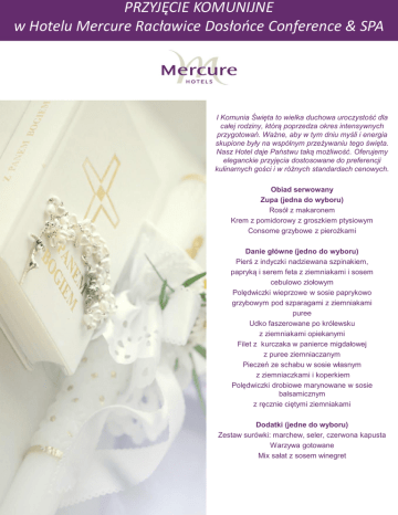 PRZYJĘCIE KOMUNIJNE w Hotelu Mercure Racławice Dosłońce Conference & SPA I Komunia Święta to wielka duchowa uroczystość dla całej rodziny, którą poprzedza okres intensywnych przygotowań. Ważne, aby w tym dniu myśli i energia skupione były na wspólnym przeżywaniu tego święta. Nasz Hotel daje Państwu taką możliwość. Oferujemy eleganckie przyjęcia dostosowane do preferencji kulinarnych gości i w różnych standardach cenowych. Obiad serwowany Zupa (jedna do wyboru) Rosół z makaronem Krem z pomidorowy z groszkiem ptysiowym Consome grzybowe z pierożkami Danie główne (jedno do wyboru) Pierś z indyczki nadziewana szpinakiem, papryką i serem feta z ziemniakami i sosem cebulowo ziołowym Polędwiczki wieprzowe w sosie paprykowo grzybowym pod szparagami z ziemniakami puree Udko faszerowane po królewsku z ziemniakami opiekanymi Filet z kurczaka w panierce migdałowej z puree ziemniaczanym Pieczeń ze schabu w sosie własnym z ziemniaczkami i koperkiem Polędwiczki drobiowe marynowane w sosie balsamicznym z ręcznie ciętymi ziemniakami Dodatki (jedne do wyboru) Zestaw surówki: marchew, seler, czerwona kapusta Warzywa gotowane Mix sałat z sosem winegret PRZYJĘCIE KOMUNIJNE w Hotelu Mercure Racławice Dosłońce Conference & SPA Deser (jeden do wyboru) Sernik w sosie czekoladowym z karmelizowanymi truskawkami Lody smażone z wiórkami kokosowymi z dodatkiem sosu z owoców leśnych Trio lodowe z sosem (czekoladowym, karmelowym, malinowym) Panna Cotta Tiramisu w pucharku Danie gorące (jedno do wyboru) Boef a’la strogonow Wołowina po burgundzku Blankiet z indyka Napoje Kawa, herbata, woda, sok 1l/os Koszt Menu wynosi 110 PLN za osobę Cena zawiera: - uroczyste nakrycie stołu - profesjonalną obsługę kelnerską * Wszystkie dzieci zachęcamy do skorzystania z placu zabaw oraz pokoju zabaw dziecięcych. Ponadto proponujemy: - zimną płytę od 20 PLN za osobę - ciasta i owoce w cenie 10 PLN za osobę - sok w cenie 10 PLN / litr, napoje gazowane 3 PLN/szt. - tort komunijny w cenie 250zł - wino białe lub czerwone w cenie 45 PLN za butelkę lub wino musujące w cenie 60 PLN za butelkę Dzieci: - do lat 4 – bezpłatnie - od 4- 7 lat – 50% ceny Hotel Mercure Dosłońce Conference & SPA Dosłońce 56, 32-222 Racławice pow. Miechów / k. Krakowa