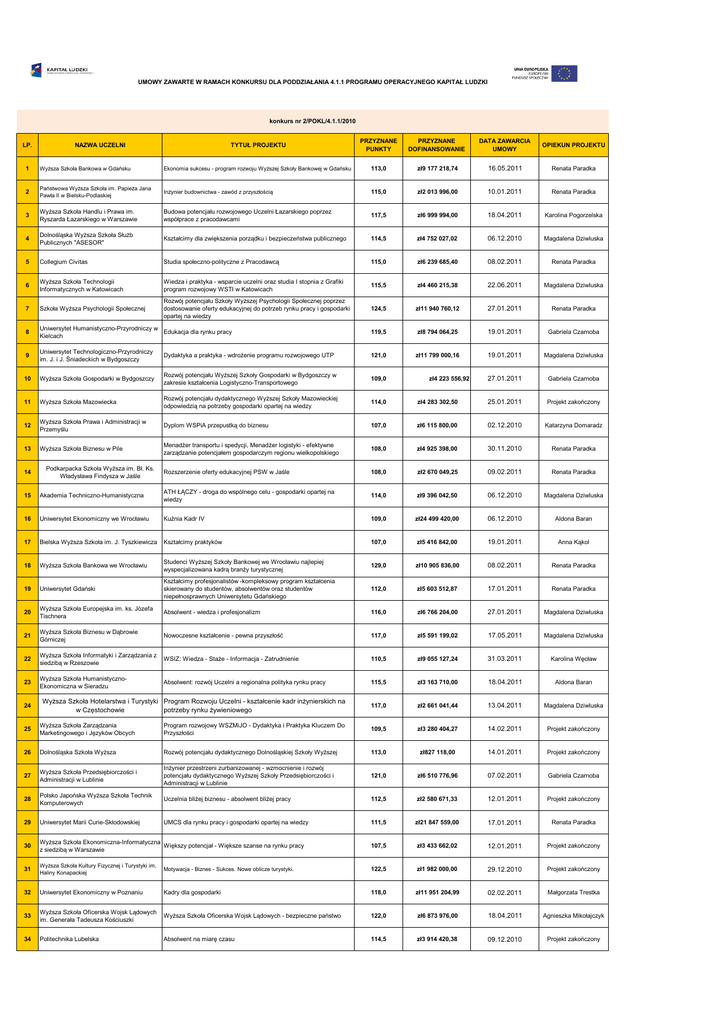 UMOWY ZAWARTE W RAMACH KONKURSU DLA PODDZIAŁANIA 4.1.1 PROGRAMU OPERACYJNEGO KAPITAŁ LUDZKI konkurs nr 2/POKL/4.1.1/2010 LP. NAZWA UCZELNI TYTUŁ PROJEKTU PRZYZNANE PUNKTY PRZYZNANE DOFINANSOWANIE DATA ZAWARCIA UMOWY OPIEKUN PROJEKTU 1 Wyższa Szkoła Bankowa w Gdańsku Ekonomia sukcesu - program rozwoju Wyższej Szkoły Bankowej w Gdańsku 113,0 zł9 177 218,74 16.05.2011 Renata Paradka 2 Państwowa Wyższa Szkoła im. Papieża Jana Pawła II w Bielsku-Podlaskiej Inżynier budownictwa - zawód z przyszłością 115,0 zł2 013 996,00 10.01.2011 Renata Paradka 3 Wyższa Szkoła Handlu i Prawa im. Ryszarda Łazarskiego w Warszawie Budowa potencjału rozwojowego Uczelni Łazarskiego poprzez współprace z pracodawcami 117,5 zł6 999 994,00 18.04.2011 Karolina Pogorzelska 4 Dolnośląska Wyższa Szkoła Służb Publicznych "ASESOR" Kształcimy dla zwiększenia porządku i bezpieczeństwa publicznego 114,5 zł4 752 027,02 06.12.2010 Magdalena Dziwluska 5 Collegium Civitas Studia społeczno-polityczne z Pracodawcą 115,0 zł6 239 685,40 08.02.2011 Renata Paradka 6 Wyższa Szkoła Technologii Informatycznych w Katowicach Wiedza i praktyka - wsparcie uczelni oraz studia I stopnia z Grafiki program rozwojowy WSTI w Katowicach 115,5 zł4 460 215,38 22.06.2011 Magdalena Dziwluska 7 Szkoła Wyższa Psychologii Społecznej Rozwój potencjału Szkoły Wyższej Psychologii Społecznej poprzez dostosowanie oferty edukacyjnej do potrzeb rynku pracy i gospodarki opartej na wiedzy 124,5 zł11 940 760,12 27.01.2011 Renata Paradka 8 Uniwersytet Humanistyczno-Przyrodniczy w Edukacja dla rynku pracy Kielcach 119,5 zł8 794 064,25 19.01.2011 Gabriela Czarnoba 9 Uniwersytet Technologiczno-Przyrodniczy im. J. i J. Śniadeckich w Bydgoszczy Dydaktyka a praktyka - wdrożenie programu rozwojowego UTP 121,0 zł11 799 000,16 19.01.2011 Magdalena Dziwluska 10 Wyższa Szkoła Gospodarki w Bydgoszczy Rozwój potencjału Wyższej Szkoły Gospodarki w Bydgoszczy w zakresie kształcenia Logistyczno-Transportowego 109,0 27.01.2011 Gabriela Czarnoba 11 Wyższa Szkoła Mazowiecka Rozwój potencjału dydaktycznego Wyższej Szkoły Mazowieckiej odpowiedzią na potrzeby gospodarki opartej na wiedzy 114,0 zł4 283 302,50 25.01.2011 Projekt zakończony 12 Wyższa Szkoła Prawa i Administracji w Przemyślu Dyplom WSPiA przepustką do biznesu 107,0 zł6 115 800,00 02.12.2010 Katarzyna Domaradz 13 Wyższa Szkoła Biznesu w Pile Menadżer transportu i spedycji, Menadżer logistyki - efektywne zarządzanie potencjałem gospodarczym regionu wielkopolskiego 108,0 zł4 925 398,00 30.11.2010 Renata Paradka Rozszerzenie oferty edukacyjnej PSW w Jaśle 108,0 zł2 670 049,25 09.02.2011 Renata Paradka 14 Podkarpacka Szkoła Wyższa im. Bł. Ks. Władysława Findysza w Jaśle zł4 223 556,92 15 Akademia Techniczno-Humanistyczna ATH ŁĄCZY - droga do wspólnego celu - gospodarki opartej na wiedzy 114,0 zł9 396 042,50 06.12.2010 Magdalena Dziwluska 16 Uniwersytet Ekonomiczny we Wrocławiu Kuźnia Kadr IV 109,0 zł24 499 420,00 06.12.2010 Aldona Baran 17 Bielska Wyższa Szkoła im. J. Tyszkiewicza Kształcimy praktyków 107,0 zł5 416 842,00 19.01.2011 Anna Kąkol 18 Wyższa Szkoła Bankowa we Wrocławiu Studenci Wyższej Szkoły Bankowej we Wrocławiu najlepiej wyspecjalizowana kadrą branży turystycznej 129,0 zł10 905 836,00 08.02.2011 Renata Paradka 19 Uniwersytet Gdański Kształcimy profesjonalistów -kompleksowy program kształcenia skierowany do studentów, absolwentów oraz studentów niepełnosprawnych Uniwersytetu Gdańskiego 112,0 zł5 603 512,87 17.01.2011 Renata Paradka 20 Wyższa Szkoła Europejska im. ks. Józefa Tischnera Absolwent - wiedza i profesjonalizm 116,0 zł6 766 204,00 27.01.2011 Magdalena Dziwluska 21 Wyższa Szkoła Biznesu w Dąbrowie Górniczej Nowoczesne kształcenie - pewna przyszłość 117,0 zł5 591 199,02 17.05.2011 Magdalena Dziwluska 22 Wyższa Szkoła Informatyki i Zarządzania z siedzibą w Rzeszowie WSIZ: Wiedza - Staże - Informacja - Zatrudnienie 110,5 zł9 055 127,24 31.03.2011 Karolina Węcław 23 Wyższa Szkoła HumanistycznoEkonomiczna w Sieradzu Absolwent: rozwój Uczelni a regionalna polityka rynku pracy 115,5 zł3 163 710,00 18.04.2011 Aldona Baran 117,0 zł2 661 041,44 13.04.2011 Magdalena Dziwluska 24 Wyższa Szkoła Hotelarstwa i Turystyki Program Rozwoju Uczelni - kształcenie kadr inżynierskich na w Częstochowie potrzeby rynku żywieniowego 25 Wyższa Szkoła Zarządzania Marketingowego i Języków Obcych Program rozwojowy WSZMiJO - Dydaktyka i Praktyka Kluczem Do Przyszłości 109,5 zł3 280 404,27 14.02.2011 Projekt zakończony 26 Dolnośląska Szkoła Wyższa Rozwój potencjału dydaktycznego Dolnośląskiej Szkoły Wyższej 113,0 zł827 118,00 14.01.2011 Projekt zakończony 27 Wyższa Szkoła Przedsiębiorczości i Administracji w Lublinie Inżynier przestrzeni zurbanizowanej - wzmocnienie i rozwój potencjału dydaktycznego Wyższej Szkoły Przedsiębiorczości i Administracji w Lublinie 121,0 zł6 510 776,96 07.02.2011 Gabriela Czarnoba 28 Polsko Japońska Wyższa Szkoła Technik Komputerowych Uczelnia bliżej biznesu - absolwent bliżej pracy 112,5 zł2 580 671,33 12.01.2011 Projekt zakończony 29 Uniwersytet Marii Curie-Skłodowskiej UMCS dla rynku pracy i gospodarki opartej na wiedzy 111,5 zł21 847 559,00 17.01.2011 Renata Paradka 30 Wyższa Szkoła Ekonomiczna-Informatyczna Większy potencjał - Większe szanse na rynku pracy z siedzibą w Warszawie 107,5 zł3 433 662,02 12.01.2011 Projekt zakończony 31 Wyższa Szkoła Kultury Fizycznej i Turystyki im. Haliny Konapackiej Motywacja - Biznes - Sukces. Nowe oblicze turystyki. 122,5 zł1 982 000,00 29.12.2010 Projekt zakończony 32 Uniwersytet Ekonomiczny w Poznaniu Kadry dla gospodarki 118,0 zł11 951 204,99 02.02.2011 Małgorzata Trestka 33 Wyższa Szkoła Oficerska Wojsk Lądowych im. Generała Tadeusza Kościuszki Wyższa Szkoła Oficerska Wojsk Lądowych - bezpieczne państwo 122,0 zł6 873 976,00 18.04.2011 Agnieszka Miko