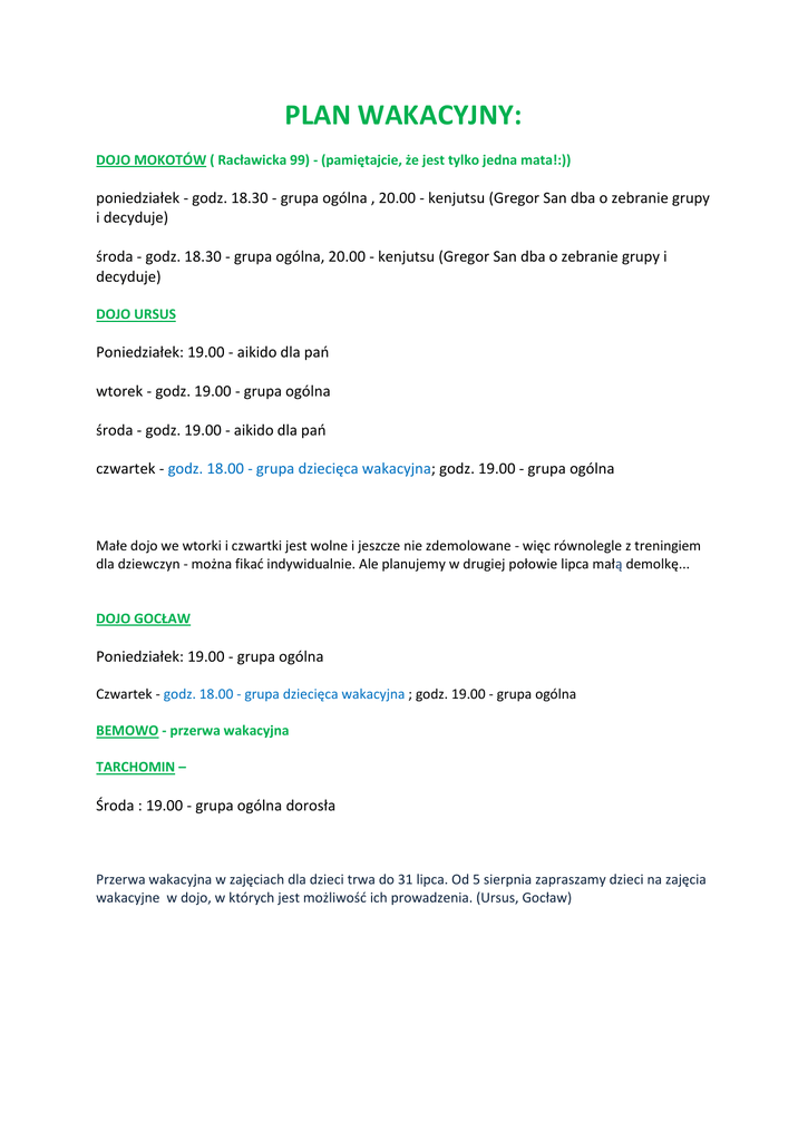 PLAN WAKACYJNY: DOJO MOKOTÓW ( Racławicka 99) - (pamiętajcie, że jest tylko jedna mata!:)) poniedziałek - godz. 18.30 - grupa ogólna , 20.00 - kenjutsu (Gregor San dba o zebranie grupy i decyduje) środa - godz. 18.30 - grupa ogólna, 20.00 - kenjutsu (Gregor San dba o zebranie grupy i decyduje) DOJO URSUS Poniedziałek: 19.00 - aikido dla pań wtorek - godz. 19.00 - grupa ogólna środa - godz. 19.00 - aikido dla pań czwartek - godz. 18.00 - grupa dziecięca wakacyjna; godz. 19.00 - grupa ogólna Małe dojo we wtorki i czwartki jest wolne i jeszcze nie zdemolowane - więc równolegle z treningiem dla dziewczyn - można fikać indywidualnie. Ale planujemy w drugiej połowie lipca małą demolkę... DOJO GOCŁAW Poniedziałek: 19.00 - grupa ogólna Czwartek - godz. 18.00 - grupa dziecięca wakacyjna ; godz. 19.00 - grupa ogólna BEMOWO - przerwa wakacyjna TARCHOMIN – Środa : 19.00 - grupa ogólna dorosła Przerwa wakacyjna w zajęciach dla dzieci trwa do 31 lipca. Od 5 sierpnia zapraszamy dzieci na zajęcia wakacyjne w dojo, w których jest możliwość ich prowadzenia. (Ursus, Gocław)