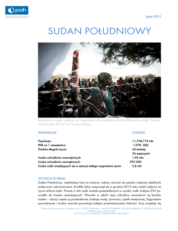 Lipiec 2015 SUDAN POŁUDNIOWY Mieszkańcy wioski czekają na rozpoczęcie demonstracji sposobu filtrowania wody. Gumruk, South Sudan, 2013/ Fot. Tomasz Woźny INFORMACJE Populacja: PKB na 1 mieszkańca: Średnia długość życia: Liczba uchodźców wewnętrznych: Liczba uchodźców zewnętrznych: Liczba osób znajdujących się w sytuacji stałego zagrożenia życia: OGÓLNE 11,738,718 mln 1,978 USD 54 kobiety 56 mężczyźni 1,95 mln 293 000 5,8 mln SYTUACJA W KRAJU Sudan Południowy, najmłodszy kraj na świecie, należy również do państw najmniej stabilnych politycznie i ekonomicznie. Konflikt, który rozpoczął się w grudniu 2013 roku nadal wpływa na życie miliona ludzi. Prawie 2 mln osób zostało przesiedlonych w wyniku walk, kolejne 293 tys. uciekło do krajów sąsiadujących. Warunki w jakich żyją uchodźcy wewnętrzni są bardzo trudne – obozy często są przeludnione, brakuje wody, żywności, opieki medycznej. Zagrożenie powodziowe i trudne warunki powodują kolejne przemieszczenia ludności. Kraj znajduje się Polska Akcja Humanitarna, ul. Szpitalna 5 lok. 3, 00-031 Warszawa, t +48 (022) 828-88-82, +48 (022) 828-90-86, f +48 (022) 831-99-38, [email protected], www.pah.org.pl NIP: 525-14-41-253 REGON: 010849302 KRS: 0000136833 Lipiec 2015 w obliczu najcięższego kryzysu żywnościowego na świecie. Głodem zagrożone jest 5,8 miliona osób - jedna trzecia ludności kraju. Według szacunków liczba ta wzrośnie do 6,4 mln w pierwszym kwartale 2015 roku. POMOC HUMANITARNA UDZIELANA PRZEZ PAH Polska Akcja Humanitarna w Sudanie Południowym działa od 2006 roku. PAH w ramach pomocy natychmiastowej (emergency) finansowanej przez Komisję Europejską (ECHO) oraz Biuro ONZ ds. Koordynacji Pomocy Humanitarnej (CHF) prowadzi działania wodno-sanitarne – „WASH” (Water, Sanitation and Hygiene) i dystrybucję produktów nieżywnościowych (NFIs – non food items: moskitiery, koce, garnki, tabletki uzdatniające wodę – w zależności od potrzeb). PROGRAM WODNO-SANITARNY W STANIE JONGLEI Od początku swojej działalności wybudowanych zostało 184 nowych studni a wyremontowanych 544. PAH zajmuje prestiżowe stanowisko WASH State Focal Point w stanie Jonglei. Oznacza to: koordynację działań wodno-sanitarnych wszystkich podmiotów działających w klastrze wodno-sanitarnym w stanie Jonglei, monitoring dystrybucji materiałów nieżywnościowych (mydła, zestawy higieniczne itp.), organizację działań rozpoznawczych z zakresu wodno-sanitarnego oraz interwencji we współpracy z partnerami, uczestniczenie w spotkaniach klastra wodno-sanitarnego oraz reprezentowanie go na szczeblu krajowym, współpracę z rządem Sudanu Południowego w celu rozszerzenia strategii wodno-sanitarnej na obszar całego kraju; Działania PAH w 2015 roku: Obecnie na Misji w Sudanie Południowym realizowane są dwa projekty: ECHO (1 500 000 EUR): projekt wodno-sanitarny i dystrybucja nieżywnościowych środków pierwszej potrzeby dla osób najbardziej narażonych na cierpienie w sytuacjach kryzysu humanitarnego, głównie w stanie Jonglei. CHF (ok. 1 000 000 EUR): projekt wodno-sanitarny dla osób najbardziej narażonych na cierpienie w sytuacjach kryzysu humanitarnego, w stanie Jonglei, Unity i Upper Nile. W lutym zakończyliśmy działania finansowane przez niemieckiego donora. Głównym celem projektu GIZ była naprawa istniejących studni w okręgach Morobo i Magwi oraz promocja higieny wśród lokalnej społeczności. Ostatecznie naprawiliśmy 110 studni tym samym zapewniając dostęp do bezpiecznego źródła wody dla 47 200 osób. Polska Akcja Humanitarna, ul. Szpitalna 5 lok. 3, 00-031 Warszawa, t +48 (022) 828-88-82, +48 (022) 828-90-86, f +48 (022) 831-99-38, [email protected], www.pah.org.pl NIP: 525-14-41-253 REGON: 010849302 KRS: 0000136833 Lipiec 2015 Z sukcesem zakończyliśmy również kolejny projekt GIZ – tym razem 43 500 osób otrzymało dostęp do bezpiecznego źródła wody w postaci 7 wywierconych studni oraz 40 wyremontowanych. Jednocześnie przeprowadzono kampanię promującą higienę, z którą dotarliśmy do ponad 50 000 osób. PAH dbając o właściwe warunki wodno – sanitarne przyczynia się również do zmniejszenia zachorowalności na choroby wywoływane używaniem brudnej wody. W czerwcu 2015 roku Ministerstwo Zdrowia Sudanu Południowego ogłosiło epidemię cholery W związku z zaistniałą sytuacją, dzięki finansowaniu ECHO i CHF, PAH podjęła działania mające na celu minimalizację i zapobieganie rozprzestrzenianiu się choroby. W pierwszych tygodniach Grupa Reagowania Natychmiastowego PAH (Emergency Response Team) skupiła się na działaniach w Jubie i Bor. Przeprowadziliśmy badania wody, dzięki którym określono stopień skażenia wody oraz działania podjęte do jej uzdatnienia. Kolejnym etapem będzie intensywna kampania promocji higieny mająca na celu propagowanie prawidłowych praktyk i zachowań podczas epidemii cholery. PRZYKŁADOWE KOSZTY Remont lub budowa studni: Jedna studnia według standardów humanitarnych SPHERE służy 500 osobom. Naprawa jednej studni to ok. 2000 USD (części i obsługa) natomiast wywiercenie nowej studni to koszt ok. 20 000 USD (w zależności od miejsca wywiercenia danej studni). Budowanie latryn i zbiorników do mycia rąk. Według standardów jedna latryna służy 50 osobom. Koszt latryny to około 1000 USD (części i obsługa, koszt zmienia się w zależności od głębokości, zabezpieczenia przeciwdeszczowego, ziemi). Polska Akcja Humanitarna, ul. Szpitalna 5 lok. 3, 00-031 Warszawa, t +48 (022) 828-88-82, +48 (022) 828-90-86, f +48 (022) 831-99-38, [email protected], www.pah.org.pl NIP: 525-14-41-253 REGON: 010849302 KRS: 0000136833