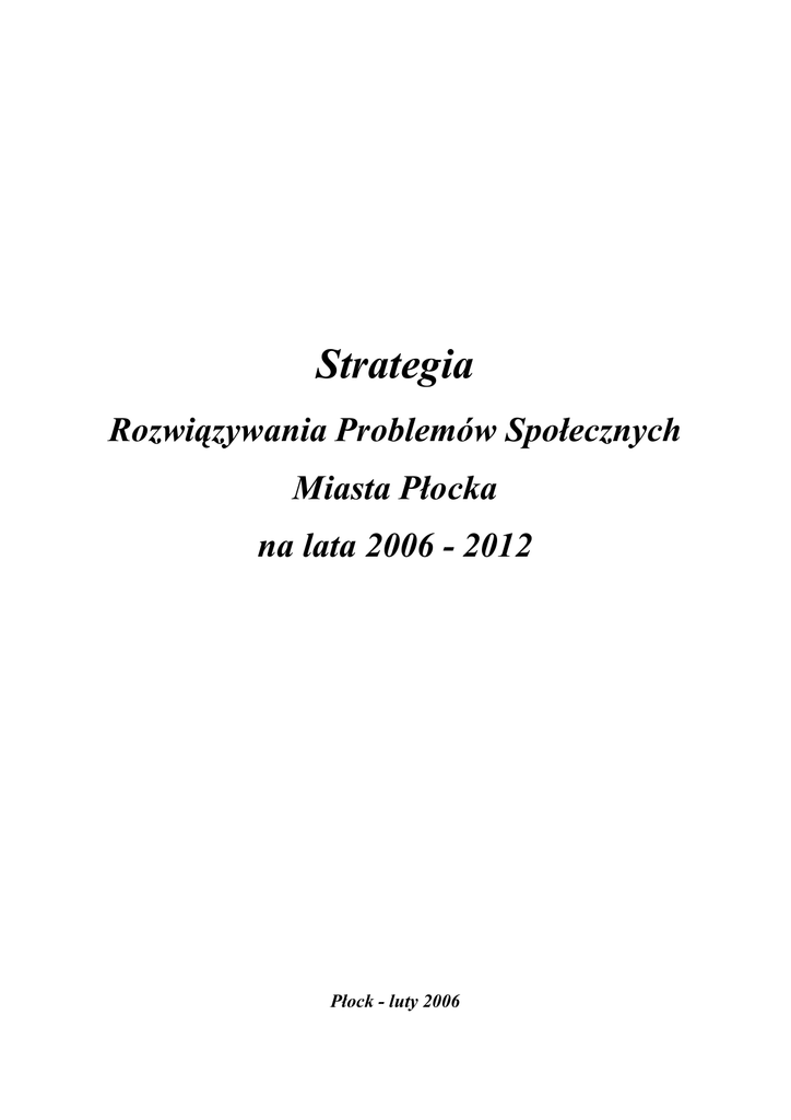 Strategia Rozwiązywania Problemów Społecznych Miasta Płocka na lata 2006 - 2012 Płock - luty 2006 Spis treści. Wstęp.................................................................................................................................................................................. 3 Rozdział I. Charakterystyka społeczno-demograficzna mieszkańców miasta Płocka........................................................ 5 1. Struktura mieszkańców................................................................................................................................................... 6 2. Bezrobocie.................................................................................................................................................................... 11 3.Niepełnosprawność........................................................................................................................................................15 4. Patologie społeczne. ......................................................................................................................................................18 Rozdział II. Zadania miasta w zakresie pomocy społecznej należące do właściwości gminy i powiatu. ....................... 23 Rozdział III. Diagnoza sytuacji społecznej miasta Płocka. .............................................................................................. 28 1. Charakterystyka klientów pomocy społecznej – najważniejsze problemy................................................................... 29 1.1. Ubóstwo..................................................................................................................................................................... 31 1.2. Bezrobocie................................................................................................................................................................. 34 1.3. Niepełnosprawność. ....................................................................................................................................................37 1.3.1. Oparcie społeczne................................................................................................................................................... 38 1.3.2. Rehabilitacja zawodowa i społeczna. ..................................................................................................................... 44 1.4. Problemy ludzi starych. ............................................................................................................................................. 48 1.5. Bezradność w sprawach opiekuńczo – wychowawczych.......................................................................................... 51 1.5.1. Rodziny wielodzietne i niepełne............................................................................................................................. 52 1.5.2. Problemy opiekuńczo – wychowawcze.................................................................................................................. 53 A. Placówki opiekuńczo – wychowawcze wsparcia dziennego. ...................................................................................... 53 B. Opieka i wychowanie poza rodziną naturalną. ............................................................................................................ 57 1.6. Przemoc w rodzinie. .................................................................................................................................................. 61 1.7. Bezdomność. ............................................................................................................................................................. 63 2. Infrastruktura pomocy społecznej. ............................................................................................................................... 66 2.1. Jednostki organizacyjne pomocy społecznej. ............................................................................................................ 66 2.2. Organizacje pozarządowe.......................................................................................................................................... 67 2.3. Rzecznik Osób Niepełnosprawnych. ......................................................................................................................... 68 Rozdział IV. Strategia Rozwiązywania Problemów Społecznych dla miasta Płocka. Misja i główne cele strategiczne. ......................................................................................................................................70 1. Cel strategiczny. Systemowe wsparcie dla osób i rodzin dotkniętych bezrobociem i długotrwale pozostających bez pracy...................... 73 2. Cel strategiczny. Wielozakresowy system wspierania rodziny.................................................................................................................... 75 3. Cel strategiczny. Aktywizacja środowiska seniorów – sieć wsparcia środowiskowego.............................................................................. 77 4. Cel strategiczny. System wsparcia dla osób niepełnosprawnych i ich rodzin.............................................................................................. 79 5. Cel strategiczny. System pomocy bezdomnym i innym osobom poważnie zagrożonym wykluczeniem społecznym.. .............................. 81 6. Cel strategiczny. Organizacje pozarządowe partnerem w rozwiązywaniu problemów społecznych (koalicja lokalna).............................. 83 7. Cel strategiczny. Infrastruktura socjalna (specjalistyczna kadra, zasoby) – adekwatna do zadań i realizowanych celów.. ....................... 85 Zakończenie i wnioski. .............................................................................................................. ........88 Wstęp. Pomoc