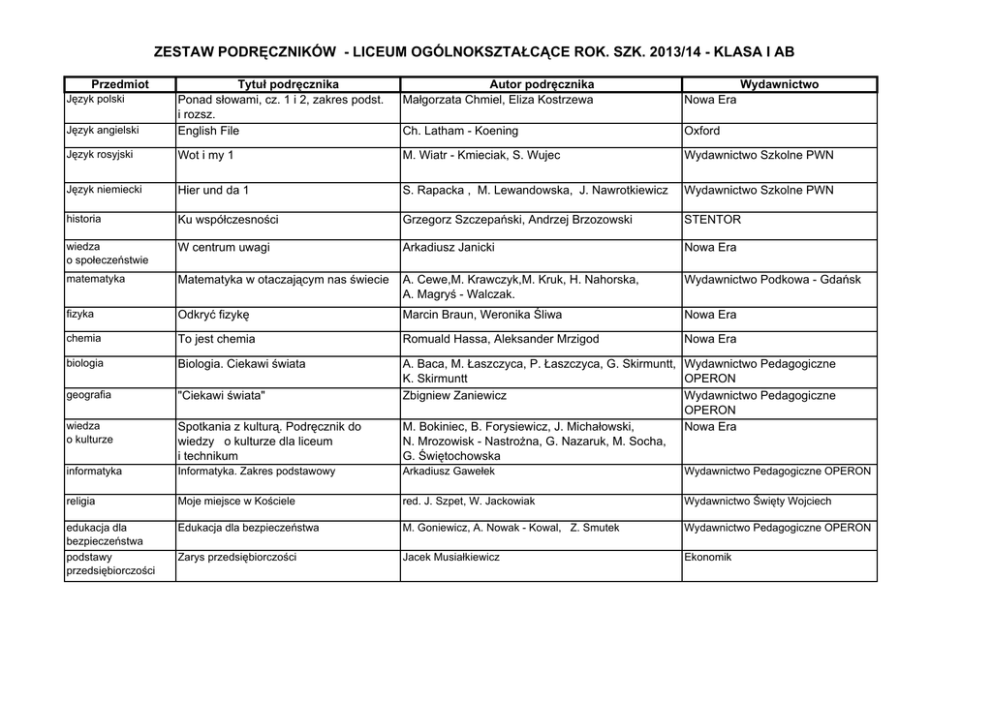 ZESTAW PODRĘCZNIKÓW - LICEUM OGÓLNOKSZTAŁCĄCE ROK. SZK. 2013/14 - KLASA I AB Przedmiot Autor podręcznika Małgorzata Chmiel, Eliza Kostrzewa Nowa Era Język angielski Tytuł podręcznika Ponad słowami, cz. 1 i 2, zakres podst. i rozsz. English File Ch. Latham - Koening Oxford Język rosyjski Wot i my 1 M. Wiatr - Kmieciak, S. Wujec Wydawnictwo Szkolne PWN Język niemiecki Hier und da 1 S. Rapacka , M. Lewandowska, J. Nawrotkiewicz Wydawnictwo Szkolne PWN historia Ku współczesności Grzegorz Szczepański, Andrzej Brzozowski STENTOR wiedza o społeczeństwie W centrum uwagi Arkadiusz Janicki Nowa Era matematyka Matematyka w otaczającym nas świecie A. Cewe,M. Krawczyk,M. Kruk, H. Nahorska, A. Magryś - Walczak. Wydawnictwo Podkowa - Gdańsk fizyka Odkryć fizykę Marcin Braun, Weronika Śliwa Nowa Era chemia To jest chemia Romuald Hassa, Aleksander Mrzigod Nowa Era biologia Biologia. Ciekawi świata geografia "Ciekawi świata" wiedza o kulturze Spotkania z kulturą. Podręcznik do wiedzy o kulturze dla liceum i technikum A. Baca, M. Łaszczyca, P. Łaszczyca, G. Skirmuntt, Wydawnictwo Pedagogiczne K. Skirmuntt OPERON Zbigniew Zaniewicz Wydawnictwo Pedagogiczne OPERON Nowa Era M. Bokiniec, B. Forysiewicz, J. Michałowski, N. Mrozowisk - NastroŜna, G. Nazaruk, M. Socha, G. Świętochowska informatyka Informatyka. Zakres podstawowy Arkadiusz Gawełek Wydawnictwo Pedagogiczne OPERON religia Moje miejsce w Kościele red. J. Szpet, W. Jackowiak Wydawnictwo Święty Wojciech edukacja dla bezpieczeństwa podstawy przedsiębiorczości Edukacja dla bezpieczeństwa M. Goniewicz, A. Nowak - Kowal, Z. Smutek Wydawnictwo Pedagogiczne OPERON Zarys przedsiębiorczości Jacek Musiałkiewicz Ekonomik Język polski Wydawnictwo ZESTAW PODRĘCZNIKÓW - LICEUM OGÓLNOKSZTAŁCĄCE ROK. SZK. 2013/14 - KLASA II AB Język polski Przedmiot Tytuł podręcznika Ponad słowami, zakres podst. i rozsz. Autor podręcznika Małgorzata Chmiel, Eliza Kostrzewa Wydawnictwo Nowa Era Język angielski Matura choices preintermediate A. Tennant, B. Michałowski Pearson Longman Język rosyjski Wot i my 2 Wydawnictwo Szkolne PWN Język niemiecki Hier und da 2 M. Wiatr - Kmieciak S. Wujec S. Rapacka, M. Lewandowska , J. Nawrotkiewicz historia i społeczeństwo /grupa B/ Poznać przeszłość. Ojczysty Panteon i ojczyste spory Grzegorz Szczepański, Andrzej Brzozowski Nowa Era matematyka Matematyka w otaczającym nas świecie A. Cewe,M. Krawczyk,M. Kruk, H. Nahorska, A. Magryś - Walczak. Wydawnictwo Podkowa - Gdańsk przyroda /grupa A/ Przyroda Galikowski M. i in. Nowa Era historia /zakres rozszerzony/ - /grupa A/ Zrozumieć przeszłość, cz. I, zakres rozszerzony Kulesza R., Kowalski K. Nowa Era geografia /zakres rozszerzony/ - /grupa B/ Geografia maturalnie B. Kicińska, D. Makowska. E. Wydawnictwa Szkolne i Pedagogiczne Malinowska, M. Mozolewska-Adamczyk religia Moje miejsce w świecie red. J. Szpet, W. Jackowiak Wydawnictwo Szkolne PWN Wydawnictwo Święty Wojciech ZESTAW PODRĘCZNIKÓW - LICEUM OGÓLNOKSZTAŁCĄCE ROK. SZK. 2013/14 - KLASA III AB Przedmiot Tytuł podręcznika Język polski. Zakres podst. i rozsz. Autor podręcznika Wydawnictwo Urszula Jagiełło, Renata Janicka-Szyszko, Wydawnictwo Pedagogiczne OPERON Magdalena Steblecka B. Polit, J. Hughes Język rosyjski Matura explorer PREINTERMEDIATE Wot i my 3 Język niemiecki Hier und da 3 historia Poznajemy przeszłość, cz. III wiedza o społeczeństwie /klasa 3 B/ Wiedza o społeczeństwie. Podręcznik. Zakres rozszerzony Matematyka w otaczającym nas świecie 3 Biologia 3. Zakres podstawowy. Język polski Język angielski matematyka biologia geografia /klasa 3 A/ geografia /klasa 3 B/ religia wiedza o kulturze /klasa 3 A/ Wiatr-Kmieciak Małgorzata, Wydawnictwo Szkolne PWN Wujec Sławomira Sylwia Rapacka , Małgorzata Wydawnictwo Szkolne PWN Lewandowska, Joanna Nawrotkiewicz Zofia Kozłowska, H. Menz, Stanisław Zając Wydawnictwo SOP Włodzimierz Maj, Teresa Stachurska Maj, Anna Zając, Stanisław Zając Wydawnictwo SOP A. Cewe,M. Krawczyk,M. Kruk, H. Nahorska, I. Pancer, R.Ropela Waldemar Lewiński, GraŜyna Skirmunt, Jan Prokop Makowska D. /red/ Wydawnictwo Podkowa Gdańsk Geografia i człowiek. Zakres podstawowy Geografia 3. Człowiek i jego F. Plit, W. Osuch, M. Sielatycki, działalność. J. Wrona Świadek Chrystusa w rodzinie. red. ks. Jan Szpet, Danuta Jackowiak Człowiek w kulturze. Podręcznik do wiedzy o kulturze. Zakres podstawowy i rozszerzony Nowa Era Grębecka Zuzanna, Kurz Iwona, Litwinowicz - Droździel Małgorzata, Rodak Paweł Wydawnictwo Pedagogiczne OPERON Wydawnictwa Szkolne i Pedagogiczne Wydawnictwa Szkolne i Pedagogiczne Wydawnictwo Św. Wojciech Wydawnictwo Szkolne PWN