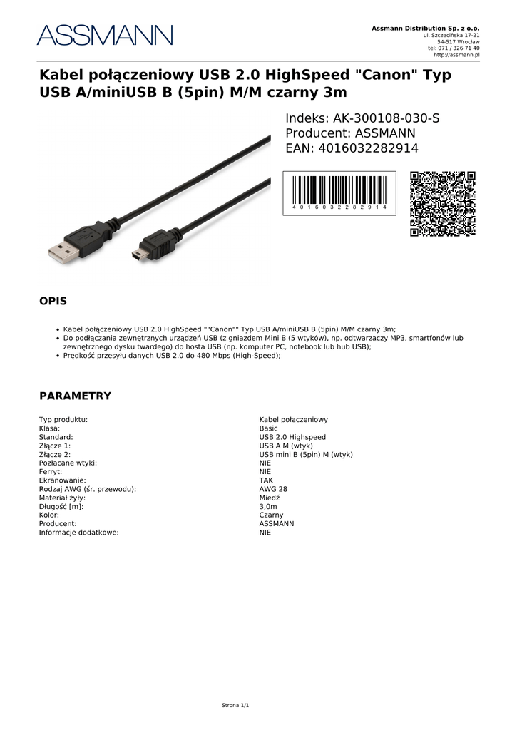 Assmann Distribution Sp. z o.o. ul. Szczecińska 17-21 54-517 Wrocław tel: 071 / 326 71 40 http://assmann.pl Kabel połączeniowy USB 2.0 HighSpeed "Canon" Typ USB A/miniUSB B (5pin) M/M czarny 3m Indeks: AK-300108-030-S Producent: ASSMANN EAN: 4016032282914 4 0 1 6 0 3 2 2 8 2 9 1 4 OPIS Kabel połączeniowy USB 2.0 HighSpeed ""Canon"" Typ USB A/miniUSB B (5pin) M/M czarny 3m; Do podłączania zewnętrznych urządzeń USB (z gniazdem Mini B (5 wtyków), np. odtwarzaczy MP3, smartfonów lub zewnętrznego dysku twardego) do hosta USB (np. komputer PC, notebook lub hub USB); Prędkość przesyłu danych USB 2.0 do 480 Mbps (High-Speed); PARAMETRY Typ produktu: Klasa: Standard: Złącze 1: Złącze 2: Pozłacane wtyki: Ferryt: Ekranowanie: Rodzaj AWG (śr. przewodu): Materiał żyły: Długość [m]: Kolor: Producent: Informacje dodatkowe: Kabel połączeniowy Basic USB 2.0 Highspeed USB A M (wtyk) USB mini B (5pin) M (wtyk) NIE NIE TAK AWG 28 Miedź 3,0m Czarny ASSMANN NIE Strona 1/1 Powered by TCPDF (www.tcpdf.org)