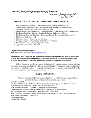 ,,Naród, który nie pamięta swojej historii nie wart jest przeżycia” Jan Paweł II HONOROWY PATRONAT NAD KONKURSEM OBJĘLI: Biskup Tadeusz Rakoczy - Ordynariusz Diecezji Bielsko - Żywieckiej Wanda Sadlik - Prezes Stowarzyszenia Rodzin Katyńskich w Bielsku-Białej Stanisław Szwed – poseł na Sejm VII kadencji RP Marcin Tyrna – Przewodniczący Zarządu Regionu Podbeskidzie NSZZ Solidarność Ks. Prałat Stanisław Bogacz - Dziekan Dekanatu Radziechowskiego Ks. Kanonik Ryszard Kubasiak – Proboszcz Parafii Rzymskokatolickiej p.w. Św. Marcina w Radziechowach 7. Stanisław Faber – Śląski Kurator Oświaty 8. Grzegorz Figura - Wójt Gminy Radziechowy – Wieprz 9. Piotr Tyrlik – Wójt Gminy Węgierska Górka 10. Tygodnik ,,Niedziela’ i Źródło” 1. 2. 3. 4. 5. 6. Organizatorem konkursu jest: Stowarzyszenie Dzieci Serc www.dzieciserc.org Konkurs na Apel Poległych jest hołdem złożonym Wielkim Polakom, którzy oddali swe życie w obronie Ojczyzny lub poza jej granicami, walcząc w obronie słusznej sprawy. Wartość narodu mierzy się m.in. pamięcią o bohaterskich czynach przodków Celem Konkursu jest kształtowanie świadomości i patriotycznych postaw młodego pokolenia przez upowszechnianie wiedzy o historii Narodu Polskiego na przestrzeni dziejów oraz odnajdywanie ludzi, którzy w imię miłości oddali życie za innych, może mieszkali blisko nas a obecnie pamięć o nich ulega zapomnieniu. RADA KONKURSU Ustanawia regulamin konkursu, powołuje Jury ( w skład, którego mogą wchodzić członkowie Rady, a także ustala regulamin jego pracy). Członkowie Rady: Ks. Ryszard Kubasiak - Proboszcz Parafii Rzymskokatolickiej p.w. Św. Marcina w Radz. Mgr Przemysław Kubaszek - Prezes BS w Radziechowach Mgr Wiesław Jakubiec - Dyrektor Gimnazjum nr 2 w Wieprzu Dr Przemysław Dyrlaga - nauczyciel historii w Gimnazjum nr 2 w Wieprzu Ks. Krzysztof Ciurla – wolontariusz Stowarzyszenia Dzieci Serc Mgr Agnieszka Klimonda - wolontariusz Stowarzyszenia Dzieci Serc – Sekretarz Rady Mgr Jadwiga Klimonda - Prezes SDS Patronat medialny: ,,Niedziela”, ,Źródło” REGULAMIN KONKURSU &1 Temat: ,,Apel Poległych ku czci bestialsko pomordowanych Członków Opozycji Komunistycznej i Solidarności w latach 1968 - 1989, odczytany na Zaduszkach Narodowych w Gminie Radziechowy - Wieprz dnia 3 listopada 2012r.” &2 Adresat: Konkurs kierowany jest do młodzieży szkół gimnazjalnych i ponadgimnazjalnych - publicznych, społecznych i prywatnych &3 Termin: Prace należy nadsyłać do 29 kwietnia 2012 - rocznica ,,Cudu w Dachau (decyduje data stempla pocztowego), pod adresem: Dzieci Serc ul. Abramska 2 34 – 381 Radziechowy z dopiskiem ,,Apel Poległych”- konkurs. Konkurs zostanie rozstrzygnięty do 15 maja 2012, po czym niezwłocznie nastąpi publiczne ogłoszenie wyników i rozdanie nagród. Treść wyłonionego w Konkursie ,,Apelu Poległych” zostanie odczytana w dniu 3 listopada 2012 r. podczas Zaduszek Narodowych w Radziechowach, na górze Matysce. &4 Zasady przygotowania pracy: I. Praca może być przygotowana przez uczniów indywidualnie lub grupowo (do 5 osób włącznie), pod opieką nauczyciela lub innej dorosłej osoby, jak również bez takiej opieki; przy wsparciu szkół, drużyn harcerskich, klubów, domów kultury, świetlic, parafii i innych instytucji pracujących z młodzieżą, a także rodziny. II. Prace należy przesłać w dwóch egzemplarzach, podpisanych w sposób jednoznacznie identyfikujący autora/autorów oraz jego/ich dane adresowe. III. Do pracy powinna być trwale dołączona czytelnie i dokładnie wypełniona METRYCZKA PRACY, której formularz podany jest w załączniku. IV. Nadesłane prace nie mogą być wcześniej nagrodzone w innych konkursach. &5 Nagrody I. Jury przyzna uczniom nagrody i wyróżnienia (rzeczowe lub książkowe) indywidualne oraz zespołowe, a nauczycielom nagrody i wyróżnienia (rzeczowe, książkowe lub honorowe – dyplomy). II. Zwycięzca konkursu wraz z opiekunem zostanie zaproszony 3.11.2012 r. na Zaduszki Narodowe do Radziechów, podczas których będzie odczytany Apel Poległych wyłoniony w Konkursie. III. Decyzja Jury, co do podziału i formy nagród będzie nieodwołalna (nie podlega weryfikacji lub zaskarżeniu) i zostanie przedstawiona w formie publicznie ogłoszonego komunikatu. &6 Przeznaczenie prac: Nadesłane prace nie będą zwracane autorom; po ocenie przez Jury, zostaną skatalogowane i zarchiwizowane w Stowarzyszeniu Dzieci Serc - gdzie stworzą odrębną kolekcję. Prace mogą być udostępniane wszystkim zainteresowanym na powszechnie obowiązujących zasadach archiwalnych. Prace, ich fragmenty lub streszczenia mogą być publikowane, przedstawiane lub wymieniane przez Organizatorów w specjalnej publikacji, ewentualnie w czasopismach ogólnokrajowych i lokalnych oraz w internecie, radiu, telewizji. We wszystkich przypadkach autorzy zachowują swoje prawa, również prawo do samodzielnej publikacji pracy &7 Kryteria oceny Apelu Poległych: ● ● W ramach konkursu uczniowie przygotowują w formie pisemnej krótką, nie dłuższą niż dwie strony formatu A4, pracę pisemną - apel poległych – na podany temat. Ocenie będzie podlegać w systemie punktowym (w sumie można zdobyć 40 pkt.): a) zgodność pracy z tematem (0-5 pkt.; każdy błąd rzeczowy powoduje odjęcie 1 pkt., 4 błędy i więcej – 0 pkt.); b) logika wywodu i spójność wypowiedzi (0-5 pkt.); c) kompozycja (0-5 pkt.); d) słownictwo i trafne użycie stylistycznych środków perswazji (5 pkt.) e) styl (0-5 pkt.; za każdy błąd odejmujemy 0,5 pkt.); f) poprawność językowo-gramatyczna (0-5 pkt.; za każdy błąd odejmujemy 0,5 pkt.); g) ortografia i interpunkcja, przenoszenie wyrazów (0-2 pkt.; gdy 1-3 błędów – za każdy odejmuje się – 0,5 pkt, 4 błędy i więcej – 0 pkt.); h) samodzielność i szczególne właściwości pracy – oryginalność, śmiałość ujęcia, itp. (0-5 pkt.); i) estetyka pracy (0-3 pkt.). Uwag
