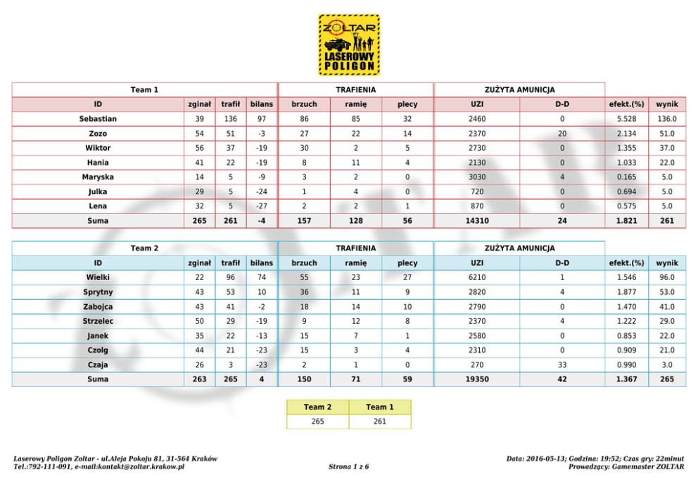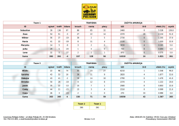 Team 1 TRAFIENIA ZUŻYTA AMUNICJA ID zginał trafił bilans brzuch ramię plecy UZI D-D efekt.(%) wynik Sebastian 39 136 97 86 85 32 2460 0 5.528 136.0 Zozo 54 51 -3 27 22 14 2370 20 2.134 51.0 Wiktor 56 37 -19 30 2 5 2730 0 1.355 37.0 Hania 41 22 -19 8 11 4 2130 0 1.033 22.0 Maryska 14 5 -9 3 2 0 3030 4 0.165 5.0 Julka 29 5 -24 1 4 0 720 0 0.694 5.0 Lena 32 5 -27 2 2 1 870 0 0.575 5.0 Suma 265 261 -4 157 128 56 14310 24 1.821 261 Team 2 TRAFIENIA ZUŻYTA AMUNICJA ID zginał trafił bilans brzuch ramię plecy UZI D-D efekt.(%) wynik Wielki 22 96 74 55 23 27 6210 1 1.546 96.0 Sprytny 43 53 10 36 11 9 2820 4 1.877 53.0 Zabojca 43 41 -2 18 14 10 2790 0 1.470 41.0 Strzelec 50 29 -19 9 12 8 2370 4 1.222 29.0 Janek 35 22 -13 15 7 1 2580 0 0.853 22.0 Czolg 44 21 -23 15 3 4 2310 0 0.909 21.0 Czaja 26 3 -23 2 1 0 270 33 0.990 3.0 Suma 263 265 4 150 71 59 19350 42 1.367 265 Laserowy Poligon Zoltar - ul.Aleja Pokoju 81, 31-564 Kraków Tel.:792-111-091, e-mail:[email protected] Team 2 Team 1 265 261 Strona 1 z 6 Data: 2016-05-13; Godzina: 19:52; Czas gry: 22minut Prowadzący: Gamemaster ZOLTAR Team 1 TRAFIENIA ZUŻYTA AMUNICJA ID zginał trafił bilans brzuch ramię plecy UZI D-D efekt.(%) wynik Sebastian 32 65 33 45 35 14 1230 0 5.285 65.0 Zozo 49 62 13 31 31 8 2340 0 2.650 62.0 Wiktor 49 28 -21 15 15 0 4740 0 0.591 28.0 Hania 35 24 -11 12 13 1 1500 0 1.600 24.0 Lena 17 10 -7 6 2 2 690 0 1.449 10.0 Julka 27 4 -22 2 2 0 750 0 0.533 4.0 Maryska 7 3 -4 2 1 1 2100 0 0.143 3.0 Suma 216 196 -19 113 99 26 13350 0 1.468 196 Team 2 TRAFIENIA ZUŻYTA AMUNICJA ID zginał trafił bilans brzuch ramię plecy UZI D-D efekt.(%) wynik Wielki 31 60 29 43 7 11 4590 8 1.305 60.0 Sprytny 22 44 22 25 9 12 2760 8 1.590 44.0 Janek 40 34 -6 25 4 6 2820 0 1.206 34.0 Czolg 30 26 26 18 7 1 1380 3 1.880 26.0 Zabojca 30 23 -7 6 14 3 1380 3 1.663 23.0 Czaja 35 14 -21 6 7 2 1320 2 1.059 14.0 Strzelec 38 14 -24 6 5 3 1470 0 0.952 14.0 Suma 226 215 19 129 53 38 15720 24 1.366 215 Laserowy Poligon Zoltar - ul.Aleja Pokoju 81, 31-564 Kraków Tel.:792-111-091, e-mail:[email protected] Team 2 Team 1 215 196 Strona 2 z 6 Data: 2016-05-13; Godzina: 19:02; Czas gry: 25minut Prowadzący: Gamemaster ZOLTAR Drużyny Miejsce Laserowy Poligon Zoltar - ul.Aleja Pokoju 81, 31-564 Kraków Tel.:792-111-091, e-mail:[email protected] Nazwa Rozgrywki 1 2 Suma Team 2 265 215 480 Team 1 261 196 457 Strona 3 z 6 Data: 2016-05-13 Prowadzący: Gamemaster ZOLTAR Zestawienie wg wyniku Miejsce TRAFIENIA ZUŻYTA AMUNICJA ID zginał trafił bilans brzuch ramię plecy UZI D-D efekt.(%) wynik Sebastian 91.58 263.45 171.87 171.27 157.91 60.44 4830.55 0.00 5.454 263.45 Wielki 67.20 202.91 135.71 126.60 39.76 50.02 13976.18 10.96 1.451 202.91 Zozo 132.44 143.95 11.51 74.02 67.20 28.69 6039.82 27.27 2.373 143.95 4 Sprytny 85.04 125.07 40.04 79.09 25.80 26.67 7157.45 15.05 1.744 125.07 5 Wiktor 135.16 84.05 -51.11 58.91 20.73 6.82 9410.73 0.00 0.893 84.05 6 Zabojca 94.64 83.51 -11.13 31.75 35.89 17.24 5460.55 3.60 1.528 83.51 7 Janek 95.73 70.80 -24.93 50.45 14.35 8.56 6902.18 0.00 1.026 70.80 8 Czolg 96.00 59.84 -36.16 42.05 12.49 6.65 4806.00 3.60 1.244 59.84 9 Hania 97.91 58.80 -39.11 25.31 30.60 6.65 4704.55 0.00 1.250 58.80 10 Strzelec 113.78 56.35 -57.44 19.47 22.36 14.51 4995.82 5.45 1.127 56.35 11 Czaja 77.45 20.89 -56.56 9.93 9.76 2.40 1952.18 47.40 1.045 20.89 12 Lena 64.04 18.82 -45.22 9.93 5.13 3.76 2014.36 0.00 0.934 18.82 13 Julka 71.95 11.62 -60.33 3.76 7.85 0.00 1881.82 0.00 0.617 11.62 14 Maryska 27.49 10.42 -17.07 6.49 3.93 1.20 6651.82 5.45 0.156 10.42 Laserowy Poligon Zoltar - ul.Aleja Pokoju 81, 31-564 Kraków Tel.:792-111-091, e-mail:[email protected] Strona 4 z 6 Data: 2016-05-13 Prowadzący: Gamemaster ZOLTAR Zestawienie wg bilansu Miejsce TRAFIENIA ZUŻYTA AMUNICJA ID zginał trafił bilans brzuch ramię plecy UZI D-D efekt.(%) wynik Sebastian 91.58 263.45 171.87 171.27 157.91 60.44 4830.55 0.00 5.454 263.45 Wielki 67.20 202.91 135.71 126.60 39.76 50.02 13976.18 10.96 1.451 202.91 Sprytny 85.04 125.07 40.04 79.09 25.80 26.67 7157.45 15.05 1.744 125.07 4 Zozo 132.44 143.95 11.51 74.02 67.20 28.69 6039.82 27.27 2.373 143.95 5 Zabojca 94.64 83.51 -11.13 31.75 35.89 17.24 5460.55 3.60 1.528 83.51 6 Maryska 27.49 10.42 -17.07 6.49 3.93 1.20 6651.82 5.45 0.156 10.42 7 Janek 95.73 70.80 -24.93 50.45 14.35 8.56 6902.18 0.00 1.026 70.80 8 Czolg 96.00 59.84 -36.16 42.05 12.49 6.65 4806.00 3.60 1.244 59.84 9 Hania 97.91 58.80 -39.11 25.31 30.60 6.65 4704.55 0.00 1.250 58.80 10 Lena 64.04 18.82 -45.22 9.93 5.13 3.76 2014.36 0.00 0.934 18.82 11 Wiktor 135.16 84.05 -51.11 58.91 20.73 6.82 9410.73 0.00 0.893 84.05 12 Czaja 77.45 20.89 -56.56 9.93 9.76 2.40 1952.18 47.40 1.045 20.89 13 Strzelec 113.78 56.35 -57.44 19.47 22.36 14.51 4995.82 5.45 1.127 56.35 14 Julka 71.95 11.62 -60.33 3.76 7.85 0.00 1881.82 0.00 0.617 11.62 Laserowy Poligon Zoltar - ul.Aleja Pokoju 81, 31-564 Kraków Tel.:792-111-091, e-mail:[email protected] Strona 5 z 6 Data: 2016-05-13 Prowadzący: Gamemaster ZOLTAR Zestawienie wg efektywności Miejsce TRAFIENIA ZUŻYTA AMUNICJA ID zginał trafił bilans brzuch ramię plecy UZI D-D efekt.(%) wynik Sebastian 91.58 263.45 171.87 171.27 157.91 60.44 4830.55 0.00 5.454 263.45 Zozo 132.44 143.95 11.51 74.02 67.20 28.69 6039.82 27.27 2.373 143.95 Sprytny 85.04 125.07 40.04 79.09 25.80 26.67 7157.45 15.05 1.744 125.07 4 Zabojca 94.64 83.51 -11.13 31.75 35.89 17.24 5460.55 3.60 1.528 83.51 5 Wielki 67.20 202.91 135.71 126.60 39.76 50.02 13976.18 10.96 1.451 202.91 6 Hania 97.91 58.80 -39.11 25.31 30.60 6.65 4704.55 0.00 1.250 58.80 7 Czolg 96.00 59.84 -36.16 42.05 12.49 6.65 4806.00 3.60 1.244 59.84 8 Strzelec 113.78 56.35 -57.44 19.47 22.36 14.51 4995.82 5.45 1.127 56.35 9 Czaja 77.45 20.89 -56.56 9.93 9.76 2.40 1952.18 47.40 1.045 20.89 10 Janek 95.73 70.80 -24.93 50.45 14.35 8.56 6902.18 0.00 1.026 70.80 11 Lena 64.04 18.82 -45.22 9.93 5.13 3.76 2014.36 0.00 0.934 18.82 12 Wiktor 135.16 84.05 -51.11 58.91 20.73 6.82 9410.73 0.00 0.893 84.05 13 