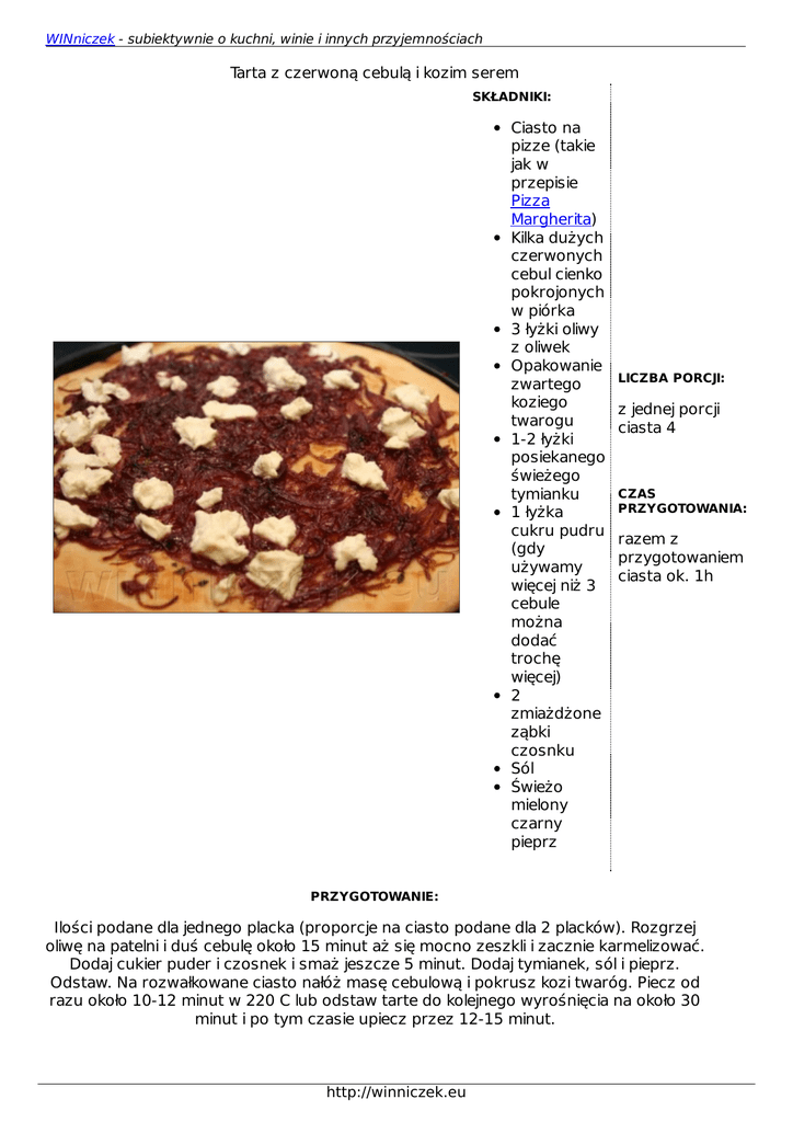 WINniczek - subiektywnie o kuchni, winie i innych przyjemnościach Tarta z czerwoną cebulą i kozim serem SKŁADNIKI: Ciasto na pizze (takie jak w przepisie Pizza Margherita) Kilka dużych czerwonych cebul cienko pokrojonych w piórka 3 łyżki oliwy z oliwek Opakowanie zwartego koziego twarogu 1-2 łyżki posiekanego świeżego tymianku 1 łyżka cukru pudru (gdy używamy więcej niż 3 cebule można dodać trochę więcej) 2 zmiażdżone ząbki czosnku Sól Świeżo mielony czarny pieprz LICZBA PORCJI: z jednej porcji ciasta 4 CZAS PRZYGOTOWANIA: razem z przygotowaniem ciasta ok. 1h PRZYGOTOWANIE: Ilości podane dla jednego placka (proporcje na ciasto podane dla 2 placków). Rozgrzej oliwę na patelni i duś cebulę około 15 minut aż się mocno zeszkli i zacznie karmelizować. Dodaj cukier puder i czosnek i smaż jeszcze 5 minut. Dodaj tymianek, sól i pieprz. Odstaw. Na rozwałkowane ciasto nałóż masę cebulową i pokrusz kozi twaróg. Piecz od razu około 10-12 minut w 220 C lub odstaw tarte do kolejnego wyrośnięcia na około 30 minut i po tym czasie upiecz przez 12-15 minut. http://winniczek.eu WINniczek - subiektywnie o kuchni, winie i innych przyjemnościach http://winniczek.eu