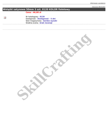 Informacje o produkcie Utworzono 08-03-2017 Wstążki satynowe 50mm 3 szt. 8120 KOLOR fioletowy Cena : 46,00 zł Sk ill C ra ft in g Nr katalogowy : 8120 Dostępność : Dostępność - 5 dni Stan magazynowy : bardzo wysoki Średnia ocena : brak recenzji