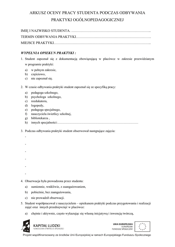 ARKUSZ OCENY PRACY STUDENTA PODCZAS ODBYWANIA PRAKTYKI OGÓLNOPEDAGOGICZNEJ IMIĘ I NAZWISKO STUDENTA. ………………………………………………………….. TERMIN ODBYWANIA PRAKTYKI………………………………………………………. MIEJSCE PRAKTYKI……………………………………………………………………….. WYPEŁNIA OPIEKUN PRAKTYKI : 1. Student zapoznał się z dokumentacją obowiązującą w placówce w zakresie przewidzianym w programie praktyki: a) b) c) w pełnym zakresie, częściowo, nie zapoznał się. 2. W czasie odbywania praktyki student zapoznał się ze specyfiką pracy: a) b) c) d) e) f) g) h) pedagoga szkolnego, psychologa szkolnego, reedukatora, logopedy, pedagoga specjalnego, nauczyciela świetlicy szkolnej, bibliotekarza , innych specjalności:………………………………………………………………… 3. Podczas odbywania praktyki student obserwował następujące zajęcia: 4. Obserwacja była prowadzona przez studenta: a) sumiennie, wnikliwie, z zaangażowaniem, b) pobieżnie, bez zaangażowania, c) nie prowadził obserwacji. 5. Student współpracował z nauczycielem – opiekunem praktyki podczas przygotowania i realizacji zajęć oraz innych przedsięwzięć w placówce: a) chętnie i aktywnie, często wykazując się własną inicjatywą i inwencją twórczą, b) zawsze, ale zazwyczaj na prośbę nauczyciela, c) niechętnie, nie wykazując zaangażowania. 6. Student potrafił omówić obserwowane zajęcia, posługując się uzupełnionym przez siebie arkuszem obserwacji: a) zajęcia omawia wyczerpująco, z uwzględnieniem celu obserwacji, b) zajęcia omawia z pomocą opiekuna praktyki, c) nie potrafi omówić obserwowanych zajęć. 7. Student był zaangażowany w prace na rzecz placówki: a) wykazywał wiele własnej inicjatywy, był chętny i gotowy do pomocy, b) podejmował działania na prośbę nauczyciela, wywiązując się z nich właściwie, c) nie podejmował działań na rzecz placówki, niechętnie pomagał, nie wywiązywał się z powierzonych zadań. 8. Dokumentacja z odbytej praktyki była przygotowana przez studenta : a) sumiennie, dokładnie, kompletnie, b) wykazywała niewielkie braki, c) niepoprawnie. 9. Postawa studenta podczas praktyki Proszę ocenić w skali 0 – 2 wymienione niżej elementy składające się na postawę studenta, gdzie 2 oznacza najwyższą wartość. a) punktualność 0 1 2 b) kultura słowa 0 1 2 c) estetyka wyglądu 0 1 2 d) rzetelne podejście do obowiązków związanych z praktyką 0 1 2 e) umiejętność nawiązania kontaktu z dziećmi 0 1 2 f) relacje z opiekunem praktyki 0 1 2 PUNKTACJA: 24 – 26 pkt - bardzo dobry 15 – 17 pkt - dostateczny + 21 – 23 pkt - dobry + 12 – 14 pkt - dostateczny 18 – 20 pkt - dobry 0 – 11 pkt - niedostateczny Ilość uzyskanych przez studenta punktów……………………… Proponowana ocena………………………………………………... …………………………………………………. podpis opiekuna praktyki w placówce ………………………………. podpis studenta Data………………………………… pieczątka placówki WYPEŁNIA STUDENT: 1. a) W czasie odbywania praktyk ogólnopedagogicznych nauczyłem się o sobie jako nauczycielu: w zakresie wiedzy, przekonań: …………………………………………………………………………………………………………… …………………………………………………………………………………………………………… ………………………………………………………………………………………………………….. b) w zakresie umiejętności: …………………………………………………………………………………………………………… …………………………………………………………………………………………………………… ………………………………………………………………………………………………………….. c) w aspekcie cech osobistych, motywacji do działania itp.: …………………………………………………………………………………………………………… …………………………………………………………………………………………………………… ………………………………………………………………………………………………………….. d) inne: …………………………………………………………………………………………………………… …………………………………………………………………………………………………………… ………………………………………………………………………………………………………….. 2. Samoocena postawy studenta: Proszę dokonać samooceny swojej postawy jako praktykanta w skali 0 – 2 w zakresie poniższych elementów, gdzie 2 oznacza najwyższą wartość. a) punktualność 0 1 2 b) kultura słowa 0 1 2 c) estetyka wyglądu 0 1 2 d) rzetelne podejście do obowiązków związanych z praktyką 0 1 2 e) umiejętność nawiązania kontaktu z dziećmi 0 1 2 f) relacje z opiekunem praktyki 0 1 2 3. Jakie stawiasz sobie aktualnie pytania po odbytej praktyce, jakich doświadczasz wątpliwości? ………………………………………………………………………………………………… ………………………………………………………………………………………………… ………………………………………………………………………………………………… ………………………………………………………………………………………………… ……………………………………………………………………………………………