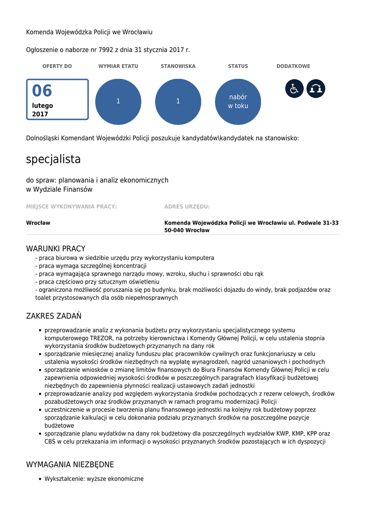 Komenda Wojewódzka Policji we Wrocławiu Ogłoszenie o naborze nr 7992 z dnia 31 stycznia 2017 r. OFERTY DO WYMIAR ETATU STANOWISKA STATUS 1 1 nabór w toku 06 lutego 2017 DODATKOWE Dolnośląski Komendant Wojewódzki Policji poszukuje kandydatów\kandydatek na stanowisko: specjalista do spraw: planowania i analiz ekonomicznych w Wydziale Finansów MIEJSCE WYKONYWANIA PRACY: ADRES URZĘDU: Wrocław Komenda Wojewódzka Policji we Wrocławiu ul. Podwale 31-33 50-040 Wrocław WARUNKI PRACY - praca biurowa w siedzibie urzędu przy wykorzystaniu komputera - praca wymaga szczególnej koncentracji - praca wymagająca sprawnego narządu mowy, wzroku, słuchu i sprawności obu rąk - praca częściowo przy sztucznym oświetleniu - ograniczona możliwość poruszania się po budynku, brak możliwości dojazdu do windy, brak podjazdów oraz toalet przystosowanych dla osób niepełnosprawnych ZAKRES ZADAŃ przeprowadzanie analiz z wykonania budżetu przy wykorzystaniu specjalistycznego systemu komputerowego TREZOR, na potrzeby kierownictwa i Komendy Głównej Policji, w celu ustalenia stopnia wykorzystania środków budżetowych przyznanych na dany rok sporządzanie miesięcznej analizy funduszu płac pracowników cywilnych oraz funkcjonariuszy w celu ustalenia wysokości środków niezbędnych na wypłatę wynagrodzeń, nagród uznaniowych i pochodnych sporządzanie wniosków o zmianę limitów finansowych do Biura Finansów Komendy Głównej Policji w celu zapewnienia odpowiedniej wysokości środków w poszczególnych paragrafach klasyfikacji budżetowej niezbędnych do zapewnienia płynności realizacji ustawowych zadań jednostki przeprowadzanie analizy pod względem wykorzystania środków pochodzących z rezerw celowych, środków pozabudżetowych oraz środków przyznanych w ramach programu modernizacji Policji uczestniczenie w procesie tworzenia planu finansowego jednostki na kolejny rok budżetowy poprzez sporządzanie kalkulacji w celu dokonania podziału przyznanych środków na poszczególne pozycje budżetowe sporządzanie planu wydatków na dany rok budżetowy dla poszczególnych wydziałów KWP, KMP, KPP oraz CBŚ w celu przekazania im informacji o wysokości przyznanych środków pozostających w ich dyspozycji WYMAGANIA NIEZBĘDNE Wykształcenie: wyższe ekonomiczne doświadczenie zawodowe: 2 lata w pracy w komórce finansowej jednostki budżetowej umiejętność kierowania grupą pracowników, umiejętność negocjacji umiejętność interpretacji i korzystania z przepisów szczegółowa znajomość klasyfikacji budżetowej znajomość ustawy o rachunkowości, ustawy o finansach publicznych oraz ustawy o służbie cywilnej umiejętność selekcji informacji, umiejętność analitycznego i logicznego myślenia umiejętność samodzielnego sporządzania analiz ekonomicznych umiejętność współpracy w zespole, umiejętność organizacji pracy własnej umiejętność obsługi programu TREZOR umiejętność obsługi programów komputerowych typu Word, Excel, Outlook Express Posiadanie obywatelstwa polskiego Korzystanie z pełni praw publicznych Nieskazanie prawomocnym wyrokiem za umyślne przestępstwo lub umyślne przestępstwo skarbowe WYMAGANIA DODATKOWE doświadczenie zawodowe: 1 rok w pracy w obszarze finansów publicznych przeszkolenie: rachunkowość zarządcza umiejętność obsługi programów PowerPoint, Access DOKUMENTY I OŚWIADCZENIA NIEZBĘDNE Życiorys/CV i list motywacyjny Kopie dokumentów potwierdzających spełnienie wymagania niezbędnego w zakresie wykształcenia Kopie dokumentów potwierdzających spełnienie wymagania niezbędnego w zakresie doświadczenia zawodowego / stażu pracy Oświadczenie o posiadaniu obywatelstwa polskiego albo kopia dokumentu potwierdzającego posiadanie polskiego obywatelstwa Oświadczenie o wyrażeniu zgody na przetwarzanie danych osobowych do celów naboru Oświadczenie o korzystaniu z pełni praw publicznych Oświadczenie o nieskazaniu prawomocnym wyrokiem za umyślne przestępstwo lub umyślne przestępstwo skarbowe DOKUMENTY I OŚWIADCZENIA DODATKOWE kopia dokumentu potwierdzającego niepełnosprawność - w przypadku kandydatek/kandydatów, zamierzających skorzystać z pierwszeństwa w zatrudnieniu w przypadku, gdy znajdą się w gronie najlepszych kandydatek/kandydatów kopie dokumentów potwierdzających spełnienie wymagania dodatkowego w zakresie doświadczenia zawodowego / stażu pracy kopie dokumentów potwierdzających spełnienie wymagania dodatkowego w zakresie przeszkolenia: rachunkowość zarządcza TERMINY I MIEJSCE SKŁADANIA DOKUMENTÓW Dokumenty należy złożyć do: 06 lutego 2017 r. Decyduje data: stempla pocztowego / osobistego dostarczenia oferty do urzędu Miejsce składania dokumentów: Dokumenty można przesyłać drogą pocztową na adres: Komenda Wojewódzka Policji we Wrocławiu Wydział Kadr ul. Podwale 31-33 50-040 Wrocław lub składać osobiście-za potwierdzeniem odbioru-w siedzibie KWP we Wrocławiu–wejście od ul. Podwale 31-33 od poniedziałku do piątku między g.8.00 a 15.00 INNE INFORMACJE: W miesiącu poprzedzającym datę upublicznienia ogłoszenia wskaźnik zatrudnienia osób niepełnosprawnych w urzędzie, w rozumieniu przepisów o rehabilitacji zawodowej i społecznej oraz zatrudnianiu osób niepełnosprawnych, nie wynosi co najmniej 6%. W aplikacji kandydaci powinni wskazać numer ogłoszenia o naborze. Wysokość proponowanego wynagrodzenia zasadniczego: mnożnik kwoty bazowej 1,6068 (co stanowi kwotę 3 010,89 zł brutto) O zakwalifikowaniu, niezakwalifikowaniu, sposobie rozparzenia aplikacji oraz zakończenia naboru kandydaci będą informowani drogą elektroniczną, w związku z tym w dokumentach należy podać adres poczty elektronicznej/e-mail. Kandydaci, którzy spełnią wymogi formalne określone w ogłoszeniu zostaną poinformowani drogą elektroniczną (telefonicznie w przypadku braku adresu e-mailowego) o terminie i miejscu przeprowadzenia kolejnych etapów naboru oraz o