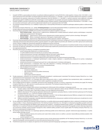 1 WARUNKI GWARANCJI GRZEJNIKI SUPERIA 1. 2. 3. 4. 5. 6. 7. 8. 9. 10. 11. 12. 13. 14. 15. 16. 17. 18. Grzejniki SUPERIA są wprowadzane do obrotu na podstawie deklaracji zgodności z normą PN-EN 442, a także zgodnie z Ustawą z dnia 16-04-2004 r. o wyrobach budowlanych (Dz.U.04.92.881) oraz Rozporządzeniami Ministra Infrastruktury: z 11-08-2004 r. w sprawie sposobów deklarowania zgodności wyrobów budowlanych oraz sposobu znakowania ich znakiem budowlanym (Dz.U.04.198.2041) i z 11-08-2004 r. w sprawie systemów oceny zgodności, wymagań, jakie powinny spełnić notyfikowane jednostki uczestniczące w ocenie zgodności oraz sposobu oznaczania wyrobów budowlanych oznakowaniem CE. Grzejniki SUPERIA muszą być instalowane przez wykwalifikowanego instalatora zgodnie z Rozporządzeniem Ministra Infrastruktury z 12-04-2002 r. w sprawie warunków technicznych, jakim powinny odpowiadać budynki oraz ich usytuowanie (Dz.U. 02.75.690). The Heating Company Poland Sp. z o.o. z siedzibą w Legnicy przy ul. Jaworzyńskiej 295 dostarcza urządzenia spełniające założenia podane w dokumentacji technicznej. The Heating Company Poland Sp. z o.o. udziela 10 letniej gwarancji na terenie Rzeczypospolitej Polskiej na sprzedawane przez siebie grzejniki SUPERIA. Za datę rozpoczęcia gwarancji przyjmuje się dzień, w którym grzejnik został wydany kupującemu. Gwarancja dotyczy grzejników SUPERIA pod warunkiem stosowania ich wyłącznie zgodnie z normami: •• PN-91-B-02414:1999 - „Ogrzewnictwo i ciepłownictwo. Zabezpieczenie instalacji ogrzewań wodnych systemu zamkniętego z naczyniami wybiorczymi przeponowymi. Wymagania.” •• PN-91/B-02413 - „Ogrzewnictwo i ciepłownictwo. Zabezpieczenie instalacji ogrzewań wodnych systemu otwartego. Wymagania.” •• PN-93/C-04607 - „Woda w instalacjach ogrzewania. Wymagania i badania jakości wody” •• PN-91/B-02420 - „Ogrzewnictwo. Odpowietrzanie instalacji ogrzewań wodnych. Wymagania” Gwarancja obejmuje grzejniki przeznaczone do ogrzewania pomieszczeń mieszkalnych, biurowych, usługowych i innych o normalnej wilgotności powietrza, wyłączając pomieszczenia takie jak baseny, łaźnie, suszarnie, łazienki i inne gdzie wilgotność powietrza jak i działanie czynników agresywnych przekraczają normy, w których mogłyby być zastosowane grzejniki bez dodatkowej warstwy ochronnej. Gwarancja obejmuje wady wynikające z winy producenta, ujawnione w trakcie trwania gwarancji, zgłoszone nie później niż jeden miesiąc od wykrycia wady. Gwarancja nie obejmuje uszkodzeń, które powstały wskutek niewłaściwego użytkowania, przechowywania, transportu oraz zastosowania wyrobu niezgodnie z jego przeznaczeniem. Roszczenia gwarancyjne nie dotyczą w szczególności grzejników, które: •• przed instalacją były składowane na świeżym powietrzu, •• w wyniku działania korozji wewnętrznej, np. za sprawą wody są nieszczelne, •• zostały zanieczyszczone wewnątrz niepożądanymi płynami lub innymi ciałami obcymi, •• zostały zamontowane przez osoby nie posiadające odpowiednich kwalifikacji, •• zostały zamontowane w instalacjach połączonych przez hydroelewator lub węzeł zmieszania pompowego •• zostały zamontowane w instalacjach opróżnianych z wody w stopniu większym i z częstotliwością większą niż to wynika z niezbędnych wymogów eksploatacyjnych, •• zostały zamontowane w instalacjach parowych lub na stałe połączonych z instalacją wodociągową, •• ostały zamontowane w instalacjach, które mają stałe połączenie z instalacją wodociągową bez zastosowania na połączeniu armatury zabezpieczającej przed przepływami zwrotnymi (antyskażeniowej), •• były nienależycie konserwowane i czyszczone, •• zostały zdeformowane przez: -- niewłaściwe składowanie, -- zbyt wysokie ciśnienie przy próbie ciśnieniowej, -- działanie mrozu, -- zbyt wysokie ciśnienie statyczne, Porady, propozycje i wskazania inne niż zawarte w katalogach, prospektach i wydrukowanych materiałach The Heating Company Poland Sp. z o.o. , będą wykorzystywane przez kupującego na jego własną odpowiedzialność. The Heating Company Poland Sp. z o.o. zastrzega sobie prawo dokonywania zmian w swoich produktach bez zawiadomienia, także w produktach już zamówionych, przy założeniu, że nie zostaną zmienione żadne uzgodnione szczegóły techniczne. Towar podlega gwarancji jedynie w przypadku zachowania przez kupującego warunku, iż nie był on naprawiany lub zmieniany bez zgody The Heating Company Poland Sp. z o.o. albo używany w sposób sprzeczny z zaleceniami The Heating Company Poland Sp. z o.o. Podstawą reklamacji jest faktura zakupu. Jeżeli w okresie gwarancji wystąpią wady wszczyna się postępowanie reklamacyjne, które przebiega w następujący sposób: a/ kupujący zgłasza wadę Odbiorcy (Dystrybutorowi THC) na formularzu zgłoszenia szkody, opisując dokładnie powstałą wadę i podając wszelkie wymagane w formularzu dane. Kopia faktury zakupu winna być dołączona do formularza, b/ Odbiorca (Dystrybutor THC) przyjmuje zgłoszenie reklamacji do rozpatrzenia i przesyła je faksem, e-mailem lub listem poleconym do The Heating Company Poland Sp. z o.o. w terminie 24 godzin od jego otrzymania, c/ he Heating Company Poland Sp. z o.o. rozpatrzy reklamację w terminie 12 dni od daty jej zgłoszenia przez Odbiorcę, następnie treść swej decyzji niezwłocznie przekaże Odbiorcy faksem, e-mailem lub listem poleconym, d/ Odbiorca zawiadomi kupującego o sposobie załatwienia reklamacji, pismem doręczonym osobiście lub listem poleconym, nie później niż w terminie 14 dni od daty zgłoszenia reklamacji. W celu rozpatrzenia reklamacji The Heating Company Poland Sp. z o.o. podda reklamowany grzejnik oględzinom, które w zależności od okoliczności sprawy, mogą się odbyć w miejscu eksploatacji grzejnika lub w The Heating Company Poland Sp. z o.o. W drugim ze wskazanych przyp