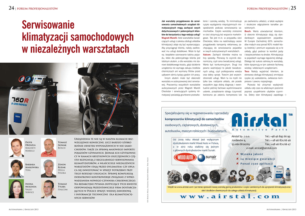 24 | FORUM PROFESJONALISTÓW FORUM PROFESJONALISTÓW | KONFORT Serwisowanie klimatyzacji samochodowych SERIA 700 w niezależnych warsztatach Tomasz Nowak Bosch Barbara Masłowska Texa Zenon Rudak Hella Polska Iwona Molenda Valeo Service Tomasz Tyliba Italcom Autonaprawa | Kwiecień 2013 Urządzenia te nie są w naszym klimacie bezwzględnie konieczne, lecz bardzo szybko rośnie odsetek wyposażonych w nie samochodów, także za sprawą masowego importu pojazdów używanych. Jednak ich użytkownicy w ramach kryzysowych oszczędności często rezygnują z regularnego serwisowania klimatyzatorów, a właściciele niezależnych warsztatów stają przed dylematem: czy opłaca się inwestować w sprzęt potrzebny przy tego rodzaju usługach. Sprawę komplikują dodatkowo kontrowersje związane z wprowadzaniem nowego czynnika chłodniczego. Na redakcyjne pytania dotyczące tych kwestii odpowiadają przedstawiciele firm dostarczających w Polsce sprzęt, wiedzę zawodową i informacje techniczne dla klimatyzacyjnych serwisów lenie i szeroką wiedzę. To minimalizuje ryzyko wystąpienia nieprzyjemnych niespodzianek podczas serwisowania samochodów. Często warsztaty zrzeszone w sieci otrzymują też wsparcie marketingowe. Tak jest m.in. w przypadku sieci Checkstar, która na nadchodzący sezon przygotowała kampanię reklamową zachęcającą do serwisowania pojazdów w swych autoryzowanych warsztatach. Italcom: Zachęcić klientów można na trzy sposoby. Pierwszy to czynnik ekonomiczny, czyli cena świadczonej usługi. Warto być konkurencyjnym. Drugi (na pewno ważniejszy) to jakość świadczonych usług, czyli profesjonalna wiedza oraz dobry sprzęt. Trzecim jest wszechstronność usługi. Mam tu na myśli nie tylko tzw. nabijanie układu, ale przede wszystkim jego dobrą diagnozę i ewentualnie później fachowe wyeliminowanie usterek, przepłukanie obiegu (czynność konieczna po zatarciu kompresora lub po zaoliwieniu układu), a także wydajne i skuteczne odgrzybienie kanałów powietrznych. Bosch: Warto uświadamiać klientom, iż obecnie klimatyzacje stają się standardowym wyposażeniem pojazdów. W Europie Zachodniej 60% samochodów małych oraz ponad 90% modeli klasy średniej i premium wyposaża się w te układy, gdyż podnosi to komfort jazdy i bezpieczeństwo na drodze. Klimatyzacja w pojazdach wymaga regularnej obsługi. Dlatego też sukces odniosą te warsztaty, które dysponują w tym zakresie fachową wiedzą i właściwymi urządzeniami. Texa: Należy wyjaśniać klientom, że okresowa obsługa klimatyzacji zmniejsza ryzyko jej uszkodzenia, zwłaszcza kompresora i zaworu rozprężnego. Pozwala też utrzymać wydajność układu cały czas na właściwym poziomie poprzez uzupełnianie ubytków czynnika. Dobry stan klimatyzacji zapobiega Fot. Bosch, Hella, Italcom, Magneti Marelli, Texa, Valeo Piotr Drzazga Magneti Marelli Jak warsztaty przygotowane do serwisowania samochodowych urządzeń klimatyzacyjnych mogą zachęcać swych dotychczasowych i potencjalnych klientów do korzystania z tego rodzaju usług? Magneti Marelli: Ilość warsztatów świadczących usługi z zakresu obsługi układów klimatyzacji zdaje się być wystarczająca. Aby przyciągnąć klienta, należy zaoferować mu usługi dodatkowe. Może to być np. bezpłatne ozonowanie kabiny pojazdu, które dla potencjalnego klienta jest istotnym atutem, a dla warsztatu nie stanowi dodatkowego kosztu, gdyż działanie urządzenia nie wymaga zakupu środków chemicznych ani wymiany filtrów przed upływem ośmiu tysięcy godzin ich pracy. Innym atutem może być obecność warsztatu w autoryzowanej sieci serwisowej. Pracownicy wszystkich warsztatów autoryzowanych przez Magneti Marelli Checkstar i serwisujących systemy klimatyzacji posiadają gruntowne przeszko- 25 Autonaprawa | Kwiecień 2013