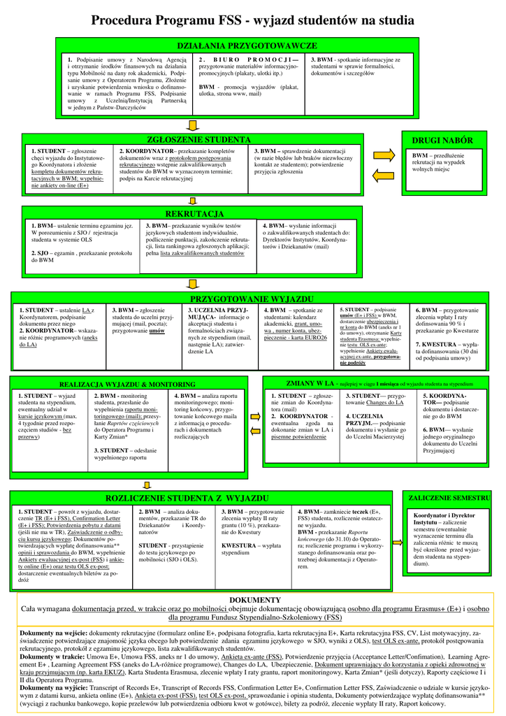Procedura Programu FSS - wyjazd studentów na studia DZIAŁANIA PRZYGOTOWAWCZE 1. Podpisanie umowy z Narodową Agencją i otrzymanie środków finansowych na działania typu Mobilność na dany rok akademicki, Podpisanie umowy z Operatorem Programu, Złożenie i uzyskanie potwierdzenia wniosku o dofinansowanie w ramach Programu FSS, Podpisanie umowy z Uczelnią/Instytucją Partnerską w jednym z Państw-Darczyńców 2. BIURO PROMOCJI— przygotowanie materiałów informacyjnopromocyjnych (plakaty, ulotki itp.) 3. BWM - spotkanie informacyjne ze studentami w sprawie formalności, dokumentów i szczegółów BWM - promocja wyjazdów (plakat, ulotka, strona www, mail) ZGŁOSZENIE STUDENTA 1. STUDENT – zgłoszenie chęci wyjazdu do Instytutowego Koordynatora i złożenie kompletu dokumentów rekrutacyjnych w BWM; wypełnienie ankiety on-line (E+) 2. KOORDYNATOR– przekazanie kompletów dokumentów wraz z protokołem postępowania rekrutacyjnego wstępnie zakwalifikowanych studentów do BWM w wyznaczonym terminie; podpis na Karcie rekrutacyjnej DRUGI NABÓR 3. BWM – sprawdzenie dokumentacji (w razie błędów lub braków niezwłoczny kontakt ze studentem); potwierdzenie przyjęcia zgłoszenia BWM – przedłużenie rekrutacji na wypadek wolnych miejsc REKRUTACJA 1. BWM– ustalenie terminu egzaminu jęz. W porozumieniu z SJO / rejestracja studenta w systemie OLS 2. SJO – egzamin , przekazanie protokołu do BWM 3. BWM– przekazanie wyników testów językowych studentom indywidualnie, podliczenie punktacji, zakończenie rekrutacji, lista rankingowa zgłoszonych aplikacji; pełna lista zakwalifikowanych studentów 4. BWM– wysłanie informacji o zakwalifikowanych studentach do: Dyrektorów Instytutów, Koordynatorów i Dziekanatów (mail) PRZYGOTOWANIE WYJAZDU 1. STUDENT – ustalenie LA z Koordynatorem, podpisanie dokumentu przez niego 2. KOORDYNATOR– wskazanie różnic programowych (aneks do LA) 3. BWM – zgłoszenie studenta do uczelni przyjmującej (mail, poczta); przygotowanie umów 3. UCZELNIA PRZYJMUJĄCA- informacje o akceptacji studenta i formalnościach związanych ze stypendium (mail, następnie LA); zatwierdzenie LA 4. BWM – spotkanie ze studentami: kalendarz akademicki, grant, umowa , numer konta, ubezpieczenie - karta EURO26 2. BWM - monitoring studenta, przesłanie do wypełnienia raportu monitoringowego (mail); przesyłanie Raprtów częściowych do Operatora Programu i Karty Zmian* 4. BWM – analiza raportu monitoringowego; monitoring końcowy, przygotowanie końcowego maila z informacją o procedurach i dokumentach rozliczających 1. STUDENT – zgłoszenie zmian do Koordynatora (mail) 2. KOORDYNATOR ewentualna zgoda na dokonanie zmian w LA i pisemne potwierdzenie 3. STUDENT— przygotowanie Changes do LA 4. UCZELNIA PRZYJM.— podpisanie dokumentu i wysłanie go do Uczelni Macierzystej 3. STUDENT – odesłanie wypełnionego raportu ROZLICZENIE STUDENTA Z WYJAZDU 1. STUDENT – powrót z wyjazdu, dostarczenie TR (E+ i FSS), Confirmation Letter (E+ i FSS); Potwierdzenia pobytu z datami (jeśli nie ma w TR), Zaświadczenie o odbyciu kursu językowego; Dokumentów potwierdzających wypłatę dofinansowania** opinii i sprawozdania do BWM, wypełnienie Ankiety ewaluacyjnej ex-post (FSS) i ankiety online (E+) oraz testu OLS ex-post; dostarczenie ewentualnych biletów za podróż 6. BWM – przygotowanie zlecenia wpłaty I raty dofinsowania 90 % i przekazanie go Kwesturze 7. KWESTURA – wypłata dofinansowania (30 dni od podpisania umowy) ZMIANY W LA - najlepiej w ciągu 1 miesiąca od wyjazdu studenta na stypendium REALIZACJA WYJAZDU & MONITORING 1. STUDENT – wyjazd studenta na stypendium, ewentualny udział w kursie językowym (max. 4 tygodnie przed rozpoczęciem studiów - bez przerwy) 5. STUDENT – podpisanie umów (E+ i FSS) w BWM, dostarczenie ubezpieczenia i nr konta do BWM (aneks nr 1 do umowy), otrzymanie Karty studenta Erasmusa; wypełnienie testu OLS ex-ante; wypełnienie Ankiety ewaluacyjnej ex-ante, przygotowanie podróży 2. BWM – analiza dokumentów, przekazanie TR do Dziekanatów i Koordynatorów 3. BWM – przygotowanie zlecenia wypłaty II raty grantu (10 %), przekazanie do Kwestury STUDENT - przystąpienie do testu językowego po mobilności (SJO i OLS). KWESTURA – wypłata stypendium 5. KOORDYNATOR— podpisanie dokumentu i dostarczenie go do BWM 6. BWM— wysłanie jednego oryginalnego dokumentu do Uczelni Przyjmującej ZALICZENIE SEMESTRU 4. BWM– zamkniecie teczek (E+, FSS) studenta, rozliczenie ostateczne wyjazdu. BWM - przekazanie Raportu końcowego (do 31.10) do Operatora; rozliczenie programu i wykorzystanego dofinansowania oraz potrzebnej dokumentacji z Operatorem. Koordynator i Dyrektor Instytutu – zaliczenie semestru (ewentualnie wyznaczenie terminu dla zaliczenia różnic te muszą być określone przed wyjazdem studenta na stypendium). DOKUMENTY Cała wymagana dokumentacja przed, w trakcie oraz po mobilności obejmuje dokumentację obowiązującą osobno dla programu Erasmus+ (E+) i osobno dla programu Fundusz Stypendialno-Szkoleniowy (FSS) Dokumenty na wejście: dokumenty rekrutacyjne (formularz online E+, podpisana fotografia, karta rekrutacyjna E+, Karta rekrutacyjna FSS, CV, List motywacyjny, zaświadczenie potwierdzające znajomość języka obcego lub potwierdzenie zdania egzaminu językowego w SJO, wyniki z OLS), test OLS ex-ante, protokół postępowania rekrutacyjnego, protokół z egzaminu językowego, lista zakwalifikowanych studentów. Dokumenty w trakcie: Umowa E+, Umowa FSS, aneks nr 1 do umowy, Ankieta ex-ante (FSS), Potwierdzenie przyjęcia (Acceptance Letter/Confimation), Learning Agreement E+ , Learning Agreement FSS (aneks do LA-różnice programowe), Changes do LA, Ubezpieczenie, Dokument uprawniający do korzystania z opieki zdrowotnej w kraju przyjmującym (np. karta EKUZ), Karta Studenta Erasmusa, zlecenie wpłaty I raty grantu, raport monitoringowy, Karta Zmian* (jeśli dotyczy), Raporty częściowe I 