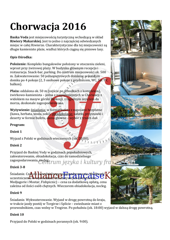 Chorwacja 2016 Baska Voda jest miejscowością turystyczną wchodzącą w skład Riwiery Makarskiej. Jest to jedno z najczęściej odwiedzanych miejsc w całej Riwierze. Charakterystyczne dla tej miejscowości są długie kamieniste plaże, wzdłuż których ciągną się piniowe lasy. Opis Ośrodka: Polożenie: Kompleks bungalowów położony w otoczeniu zieleni, wprost przy żwirowej plaży. W budynku głównym recepcja i restauracja. Snack-bar, parking. Do centrum miejscowości ok. 500 m. Zakwaterowanie: 50 jednopiętrowych domków, w każdym domku po 4 pokoje (2, 3 osobowe pokoje z prysznicem, WC, Sat TV, balkon). Plaża: oddalona ok. 50 m (zejście po schodkach z kompleksu), żwirkowo-kamienista – jedna z najpiękniejszych w Chorwacji z widokiem na masyw górski Biokovo, z łagodnym zejściem do morza, doskonale zagospodarowana. Wyżywienie: śniadania: w formie bufetu z napojami bezpłatne (kawa, herbata, woda, soki), obiadokolacje: sałatki, przystawki i deserty w formie bufetu, dania główne – wybór z trzech dań Program: Dzień 1 Wyjazd z Polski w godzinach wieczornych (ok. 20:00). Dzień 2 Przyjazd do Baskiej Vody w godzinach popołudniowych, zakwaterowanie, obiadokolacja, czas do samodzielnego zagospodarowania, nocleg. Dzień 3-8 Śniadanie. Czas do samodzielnego zagospodarowania. Możliwość uczestniczenia w wycieczkach fakultatywnych (Dubrovnik, Medjugorie i Mostar, Fishpicnic) – cena za dodatkową opłatą, cena zależna od ilości osób chętnych. Wieczorem obiadokolacja, nocleg. Dzień 9 Śniadanie. Wykwaterowanie. Wyjazd w drogę powrotną do kraju, w trakcie jazdy postój w Torgirze i Splicie – zwiedzanie miast z przewodnikiem, czas wolny w Trogirze. Po południu (ok. 18:00) wyjazd w dalszą drogę powrotną. Dzień 10 Przyjazd do Polski w godzinach porannych (ok. 9:00). Cena / dzieci 2-11 lat (z dwójką osób dorosłych w pokoju) 20. – 29.05.2016 1090 zł (promocja) 900 zł 27.05 – 5.06.2016 1350 zł 1050 zł 16. – 25.09.2016 1190 zł 900 zł 16. – 30.09.2016 1699 zł 1199 zł Dzieci do 2 lat z dwójką osób dorosłych w pokoju gratis. Termin Cena / dorośli Cena zawiera:        Transport komfortowym autokarem (klimatyzacja, wc, video, cafe-barek) 7 noclegów w domkach (bungalowach) w pokojach 2-3 osobowych z łazienką w Baskiej Vodzie (w terminie 16. – 30.09.2016: 12 noclegów) Wyżywienie HB: śniadania i obiadokołacje Wycieczkę do Trogiru i Splitu (w przypadku terminu 27.05. – 5.06.2016 Jeziora Plitvickie – w cenie przewodnik i transport, bilet dodatkowo płatny) Opiekę pilota Taksę klimatyczną Ubiezpieczenie NNW, KL i BP Cena nie zawiera:    Wycieczek fakultatywnych do Dubrovnika, Medjugorie i Mostaru oraz Fishpicnicu Dopłaty do pokoju 1-osobowego (350zł) Biletu wstępu na Jeziora Plitvickie (110 HRK) Wycieczki fakultatywne: Dubrovnik: niewątpliwie najpiękniejsze miasto w Chorwacji, tzw. „perła Adriatyku”, jedno z najbardziej romantycznych miejsc na świecie. Za potężnymi murami kryją się urokliwe uliczki, wspaniałe kościoły, muzea i pałace. Koszt wycieczki zależny od ilości osób chętnych. Ok. 35 EUR. Medjugorie i Mostar: miasteczko położone w skalistych górach. W 1984 r. grupie dzieci ukazała się tu Matka Boska. Od tej pory miejscowość stała się sławna na cały świat i co roku jest odwiedzana przez tysiące pielgrzymów. Koszt wycieczki zależny jest od ilości osób chętnych. Ok. 35 EUR (na wyjazd w celu zakupów polecamy zabranie euro). Fishpicnic: rejs na wyspę Hvar i Bol, podczas rejsu impreza z muzyką, słodki poczęstunek, obiad, lokalne wino bez ograniczeń. Wypłynięcie 8:45, powrót ok. 19:00. Cena ok. 200 HRK. Alliance Française Katowice Ul. Staromiejska 12/3 40-013 Katowice tel. +48 518 868 344 email: [email protected]